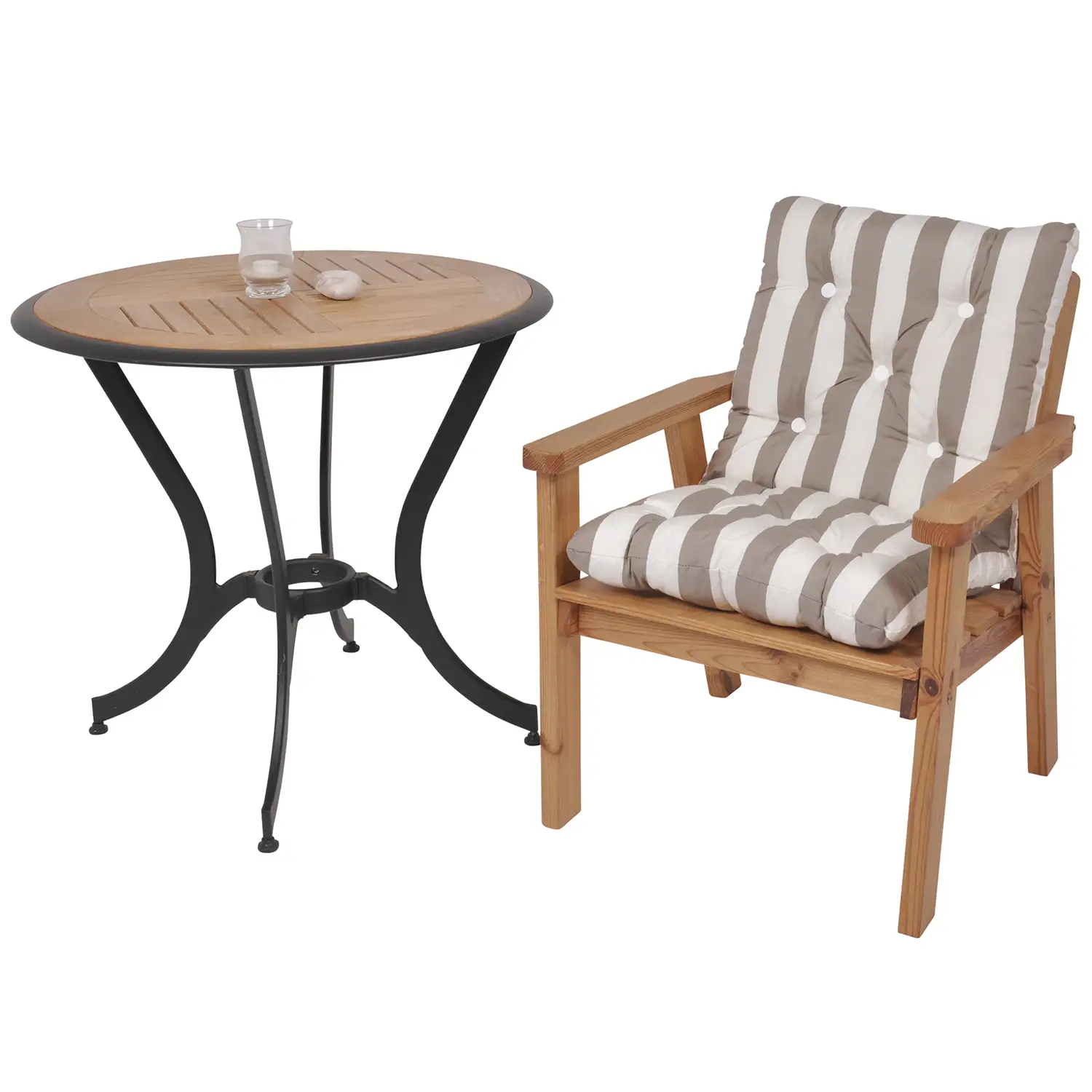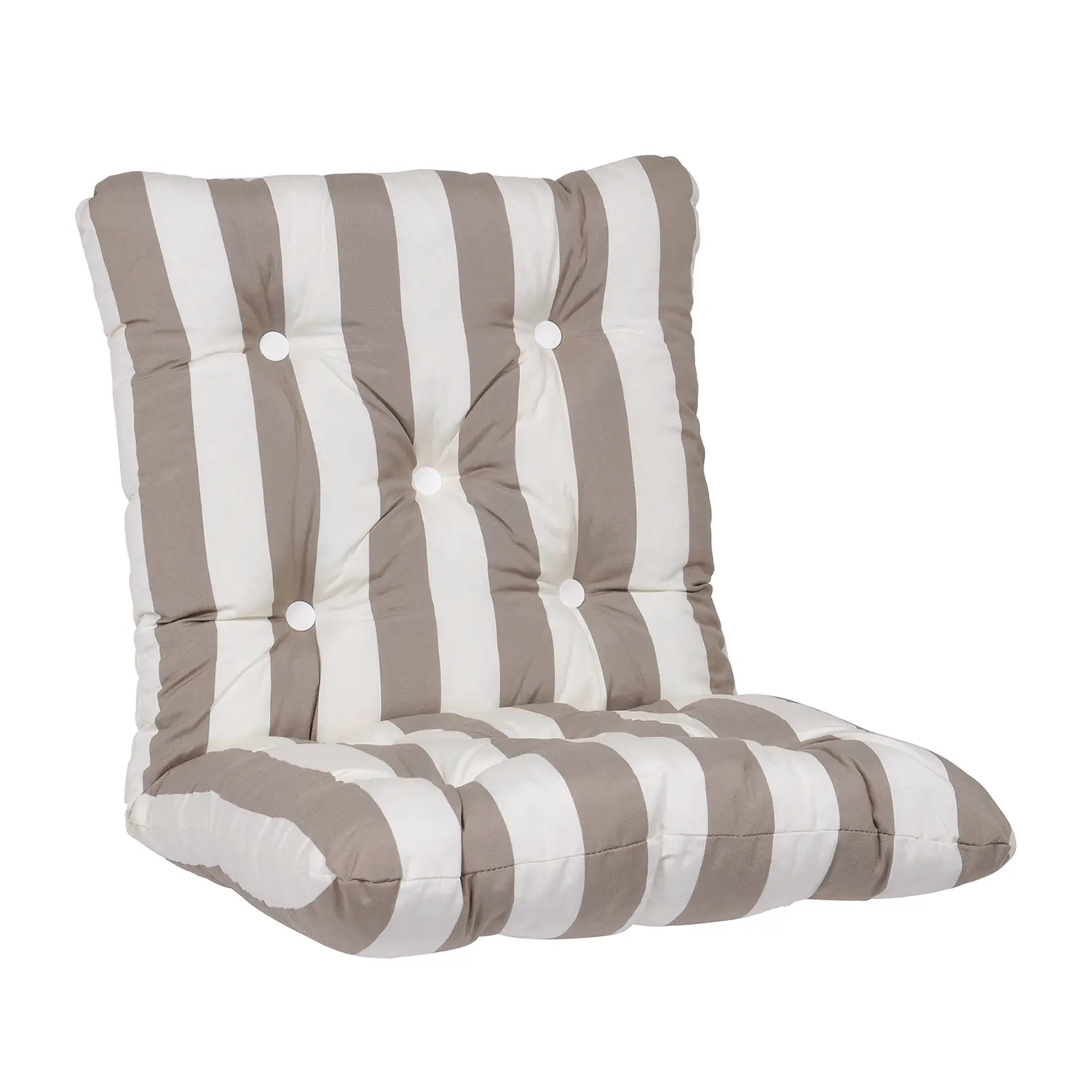 Minivik visas här i randigt tyg i Dralon. Dralondynor är mycket tåliga mot solblekning och kommer att hålla färgen i många år. Dynan har vita knappar i plast i rygg och sits.