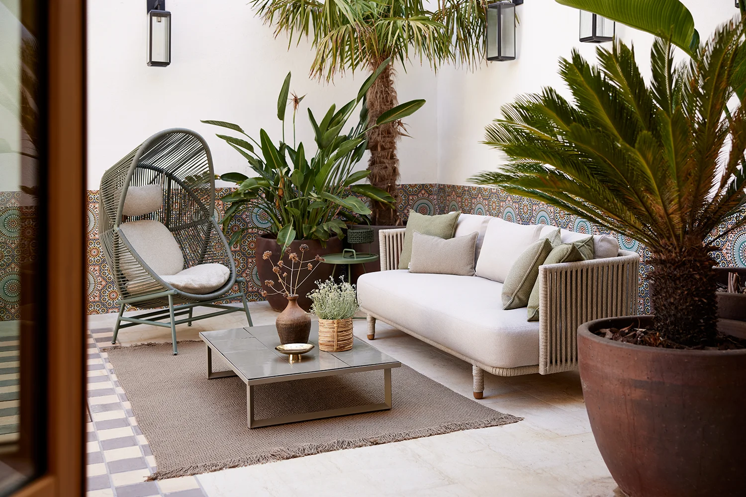 Cane-Line Soft Rope är en vävd polypropylen-fiber. Materialet används lite som konstrotting i möbler men har en mjuk yta som tyg. Undvik att dra i materialet för hårt då det kan leda till att den tappar formen. Detta vädertåliga material tål skiftande väderförhållanden och är UV-resistent. Det är lätt att underhålla och kan rengöras med vanliga rengöringsmedel (exempelvis såpa).
