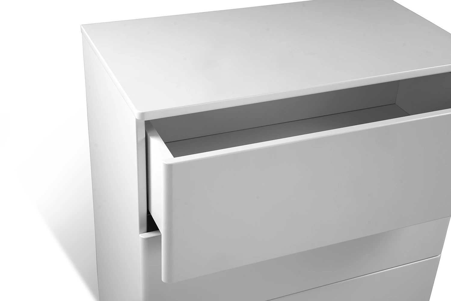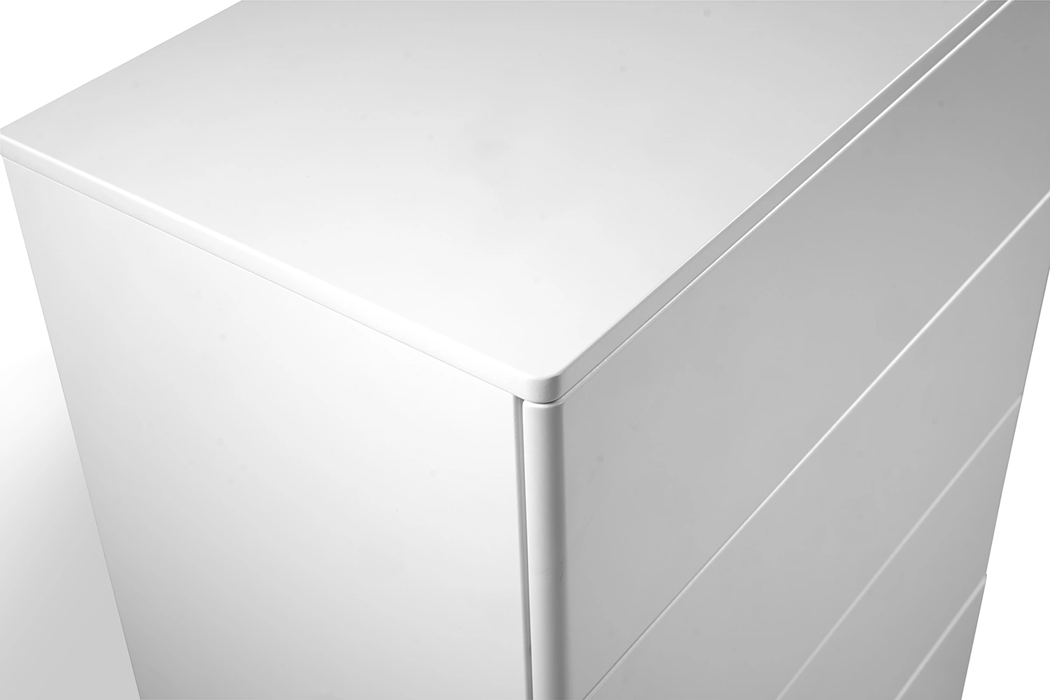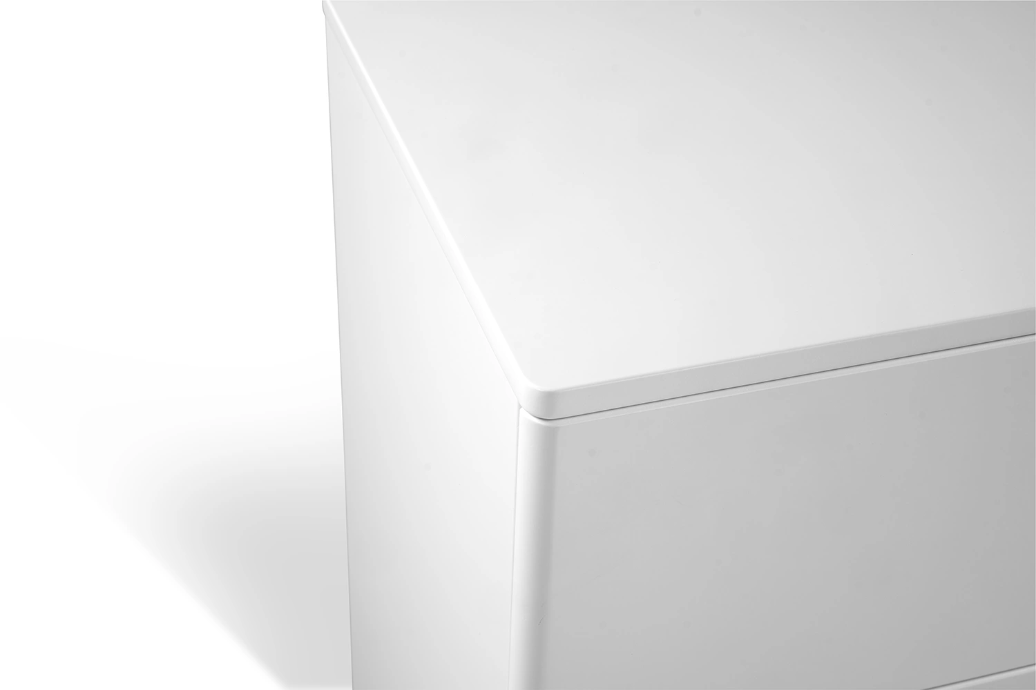 Byrån har runda hörn i framkant, lådor med underliggande push open och förstärkt lådbotten.