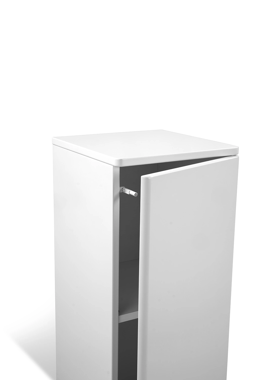 Sängskåpet har rundat hörn i framkant. Dörr går att montera åt båda hållen.