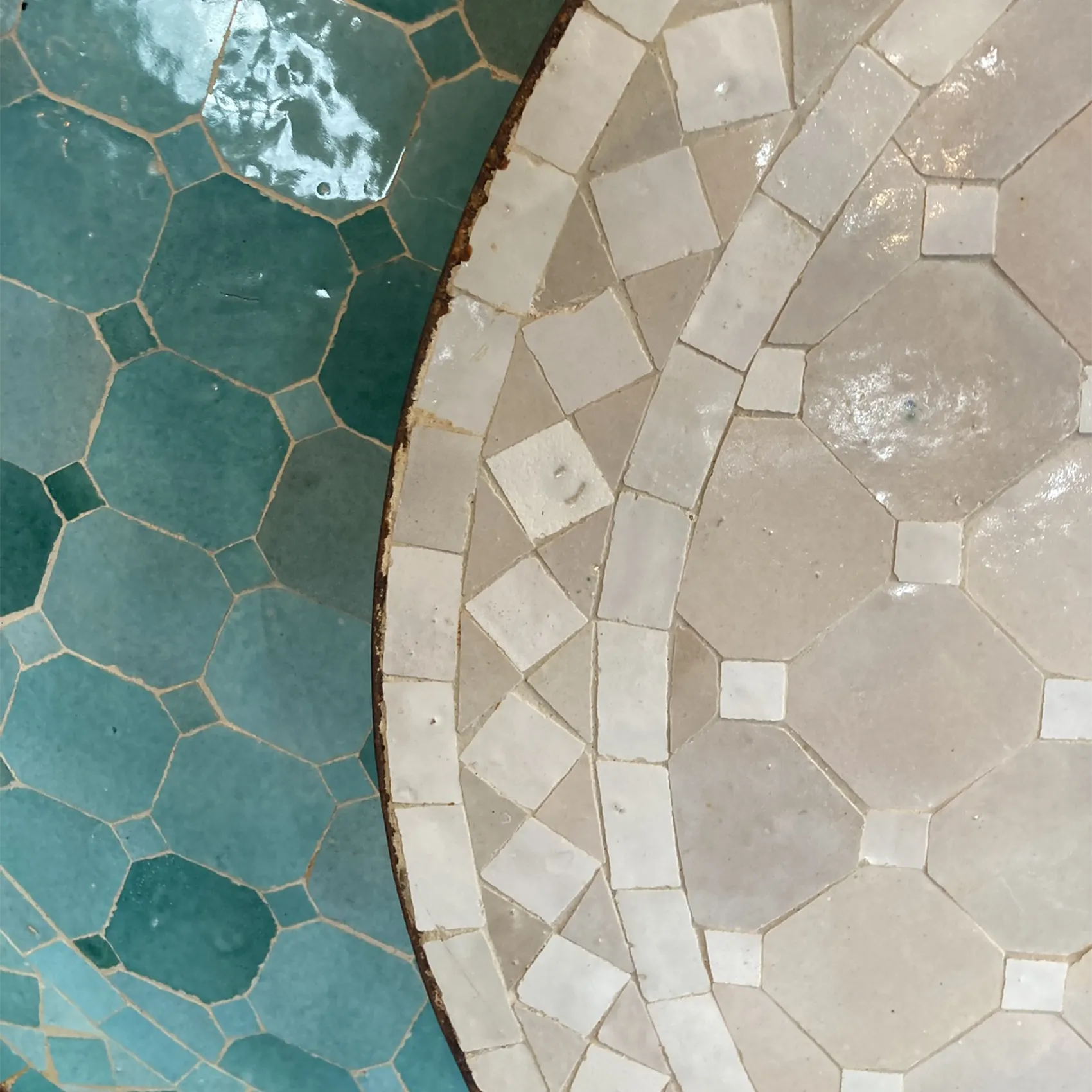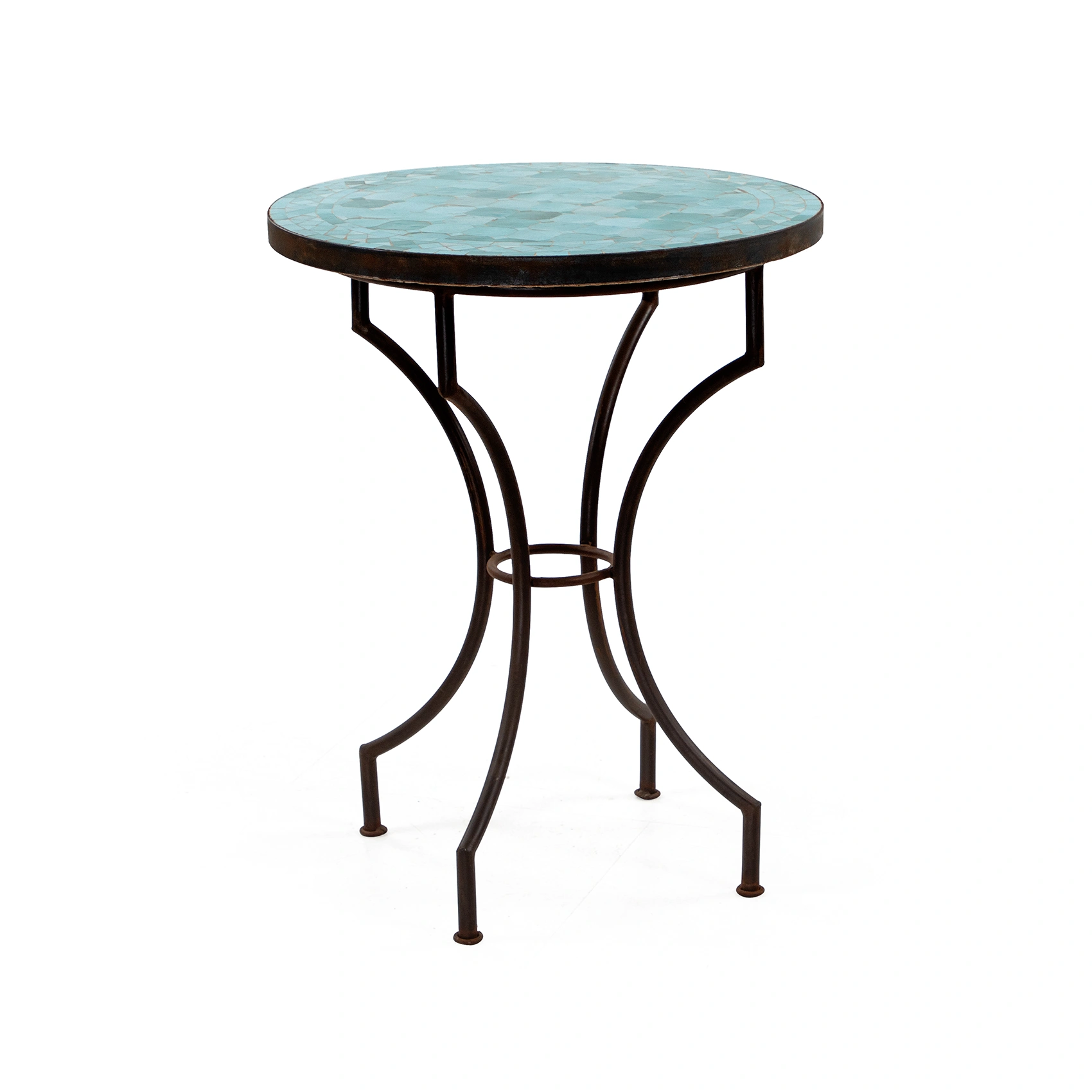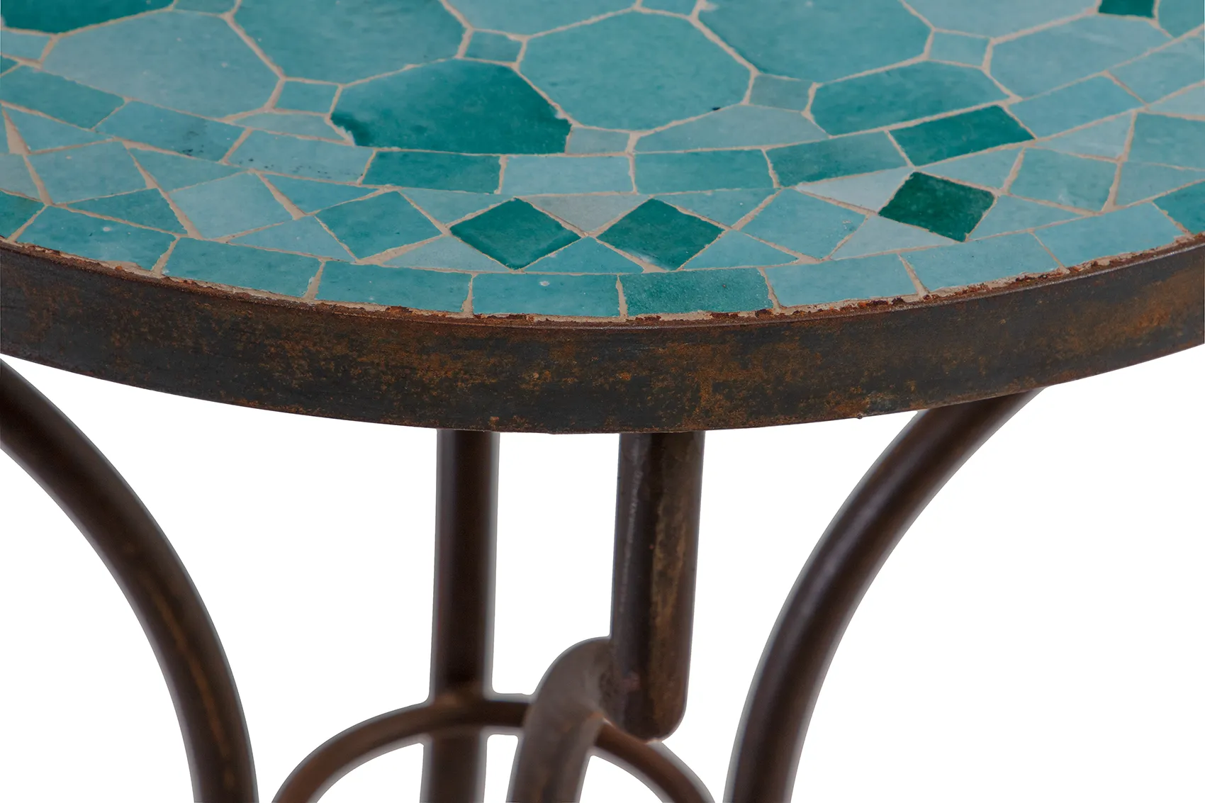 Skapa en inbjudande och charmig cafékänsla hemma med detta vackra mosaikbord i turkos. Bordet har en rund, gjuten mosaikskiva med dekorativt mönster som ger varje exemplar en unik karaktär.