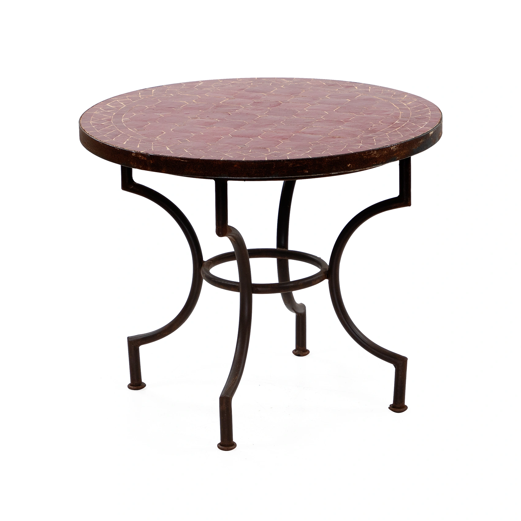 Lyft helheten i din uteplats eller ditt vardagsrum med detta dekorativa mosaikbord i vinrött. Den runda, gjutna mosaikskivan har ett vackert mönster som ger varje bord en unik och levande karaktär.