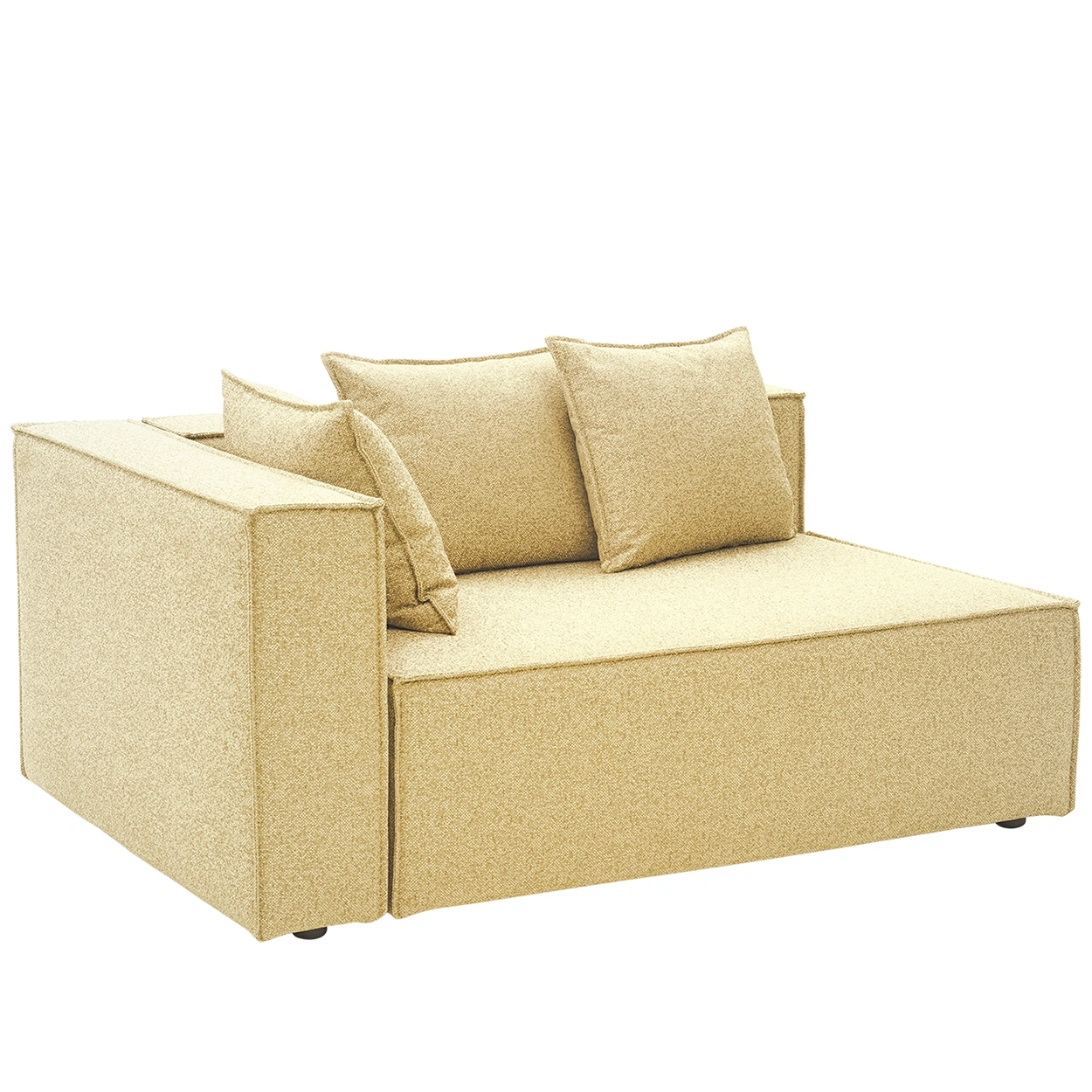 Varje modul är klädd i slitstarkt tyg med TPU-liner som står emot sol, fukt och vardagsliv, medan den mjuka stoppningen och sittytan med fjädrar bjuder in till långa, avkopplande stunder. Tre lösa mindre kuddar ingår i varje modul och soffans dekorativa sömmarna ger en sofistikerad look.