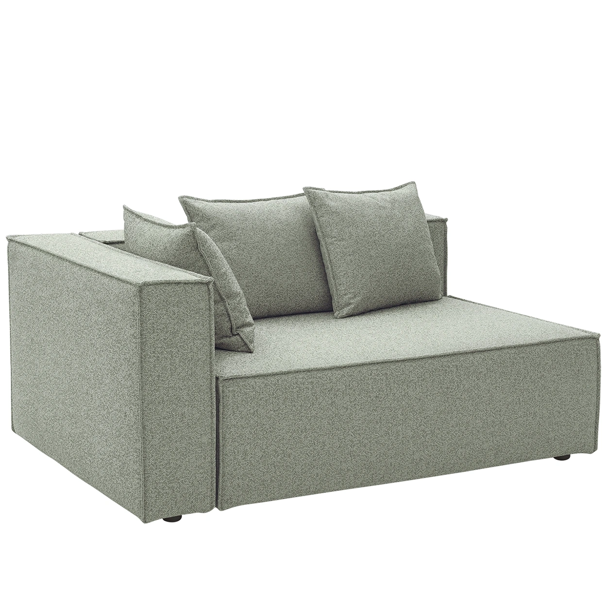 Varje modul är klädd i slitstarkt tyg med TPU-liner som står emot sol, fukt och vardagsliv, medan den mjuka stoppningen och sittytan med fjädrar bjuder in till långa, avkopplande stunder. Tre lösa mindre kuddar ingår i varje modul och soffans dekorativa sömmarna ger en sofistikerad look.