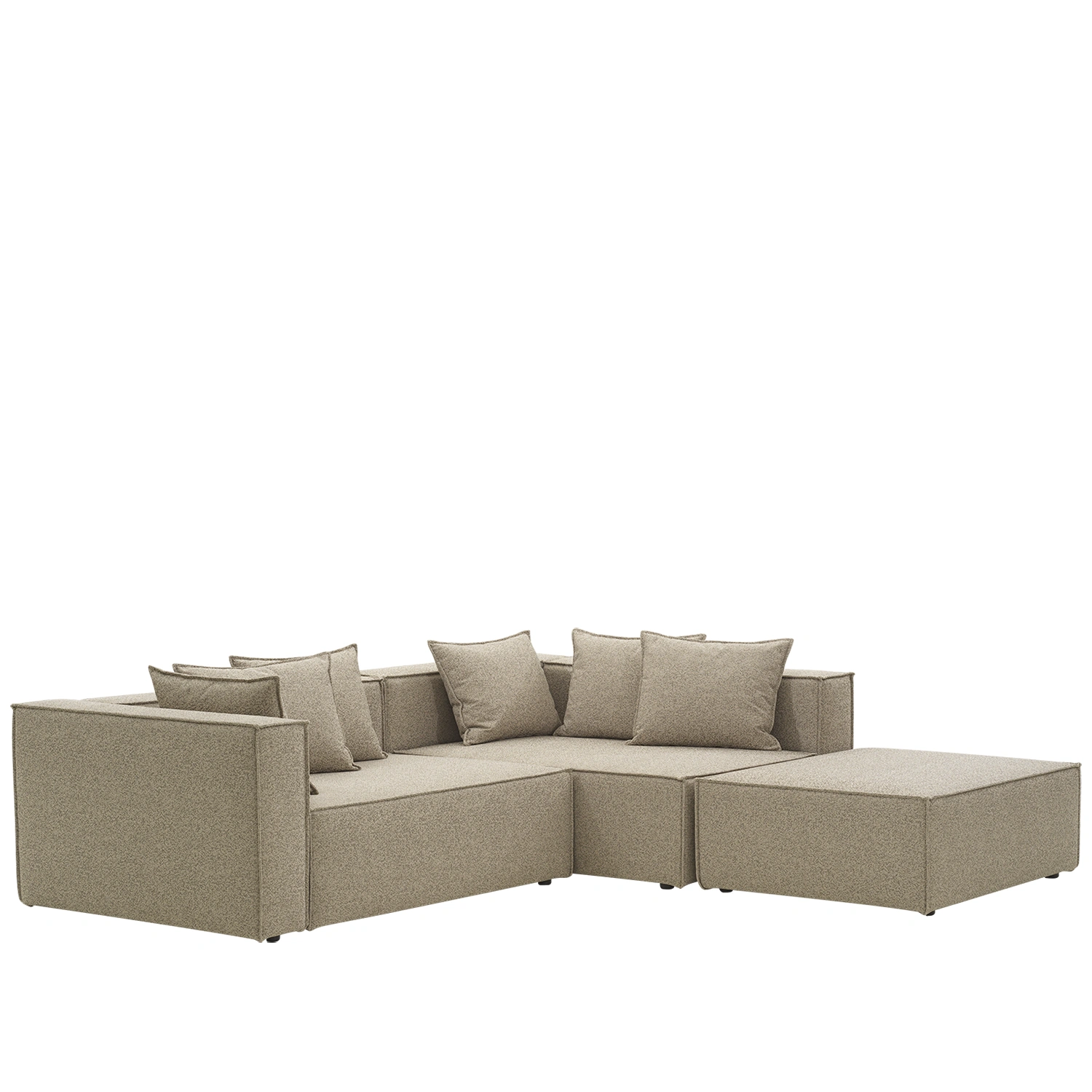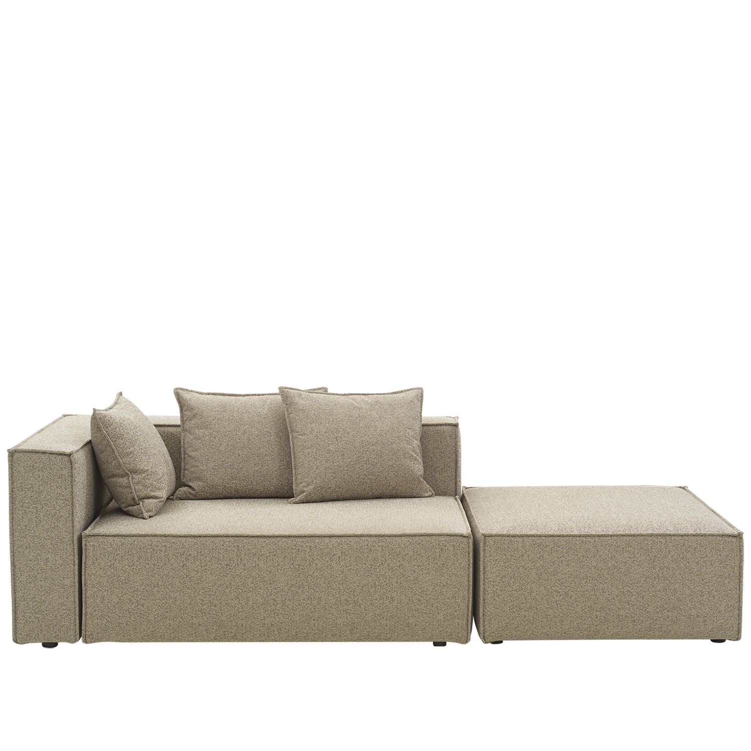 Varje modul är klädd i slitstarkt tyg med TPU-liner som står emot sol, fukt och vardagsliv, medan den mjuka stoppningen och sittytan med fjädrar bjuder in till långa, avkopplande stunder. Tre lösa mindre kuddar ingår i varje modul och soffans dekorativa sömmarna ger en sofistikerad look.
