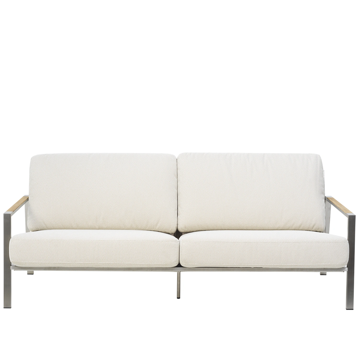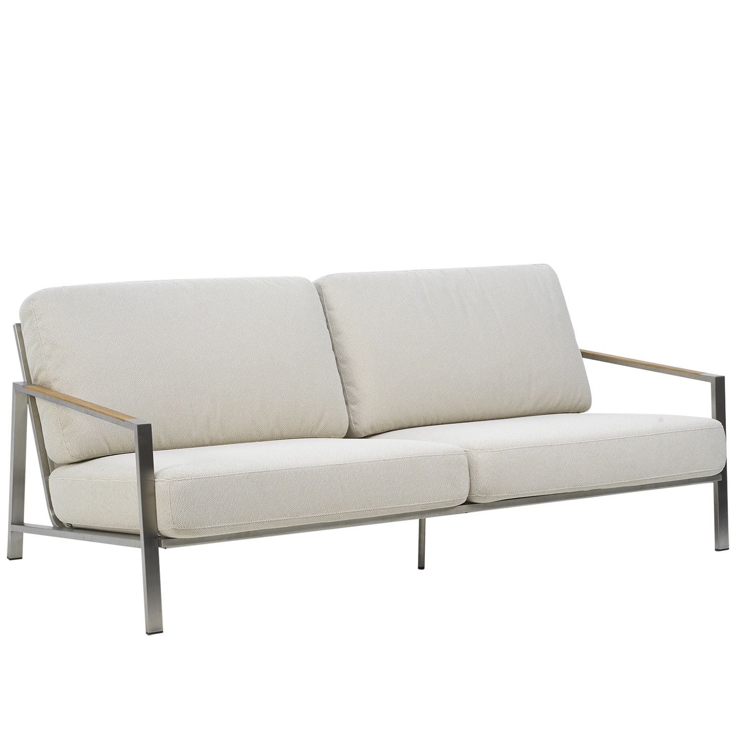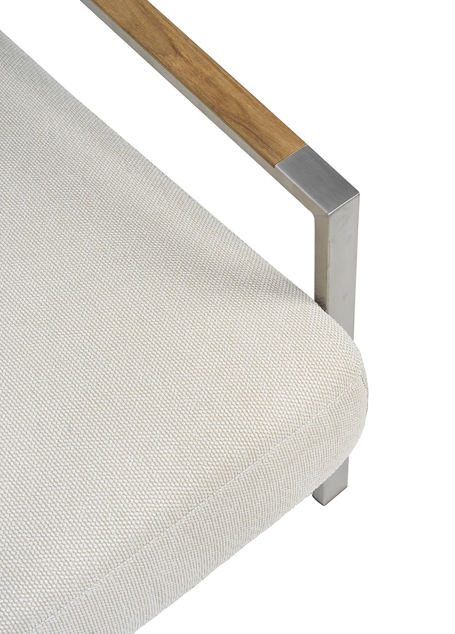 Snygg soffa som verkligen känns modern med sin stomme i rostfritt stål. Rejält sittdjup med skön lutning, här kommer du kunna koppla av med stil. Helheten formas av detaljerna och teakinslagen på armstöden förhöjer den genomtänkta känslan. Den låga sitthöjden förstärker känslan av modern loungestil och sköna dynor av högdensitetsskum med klädsel av fodrat olefintyg som gör dem vattenavvisande. Det här är en sittgrupp med snygga detaljer och vinklar. Rena linjer och tidlös design i en modern tappning.