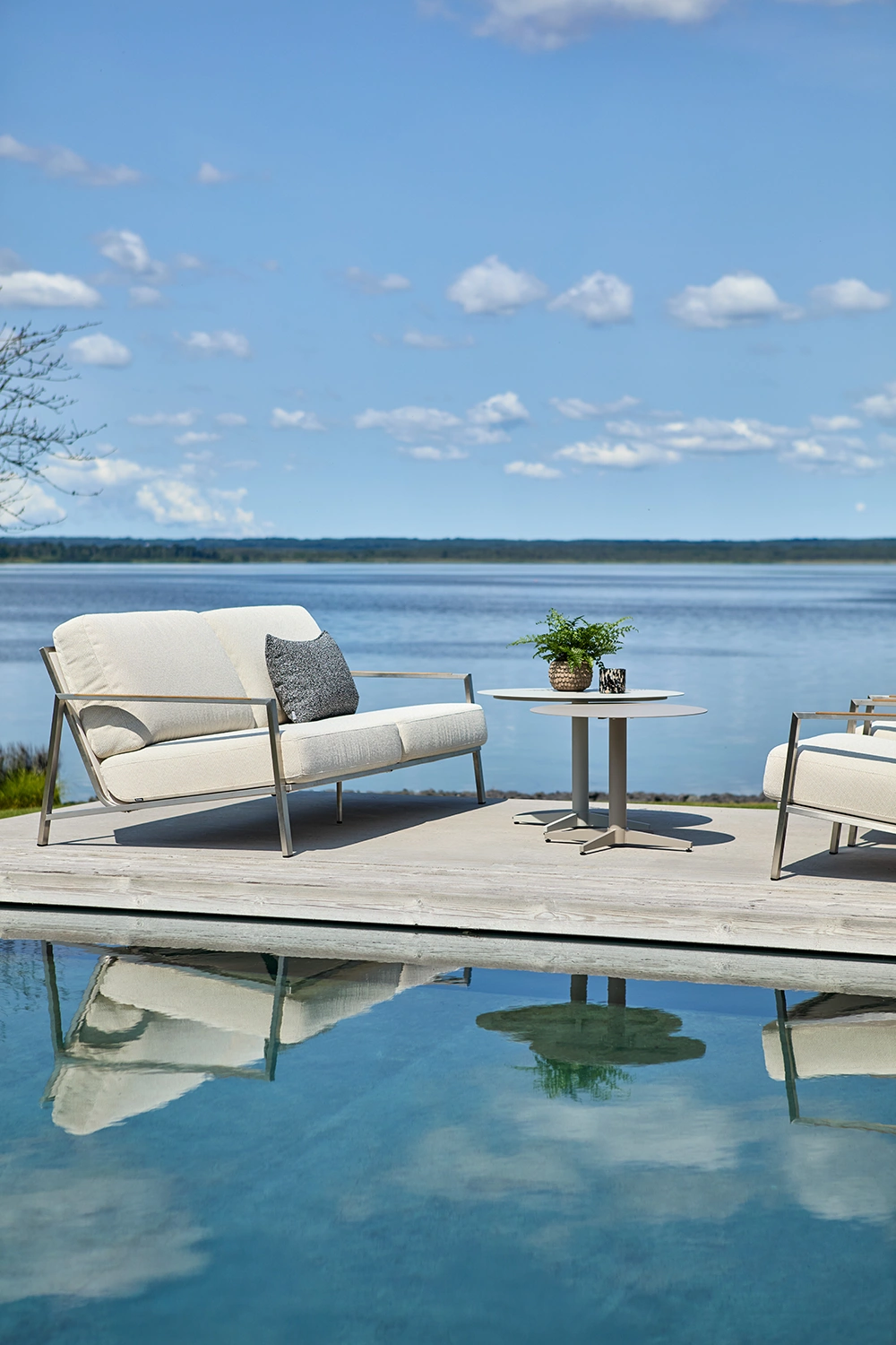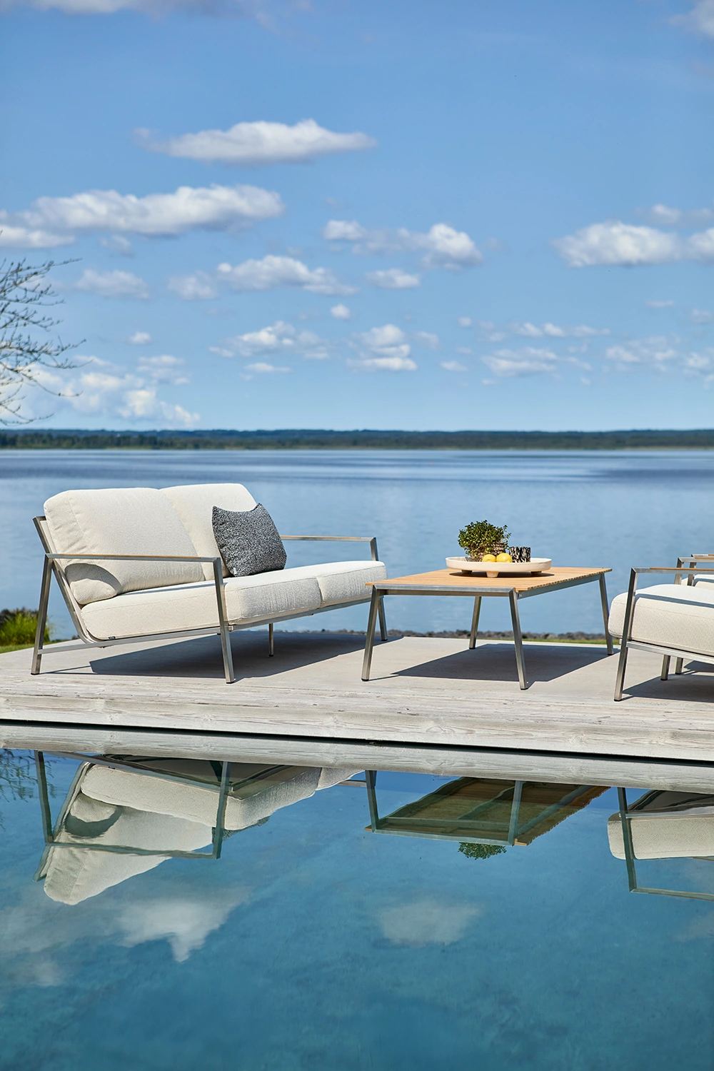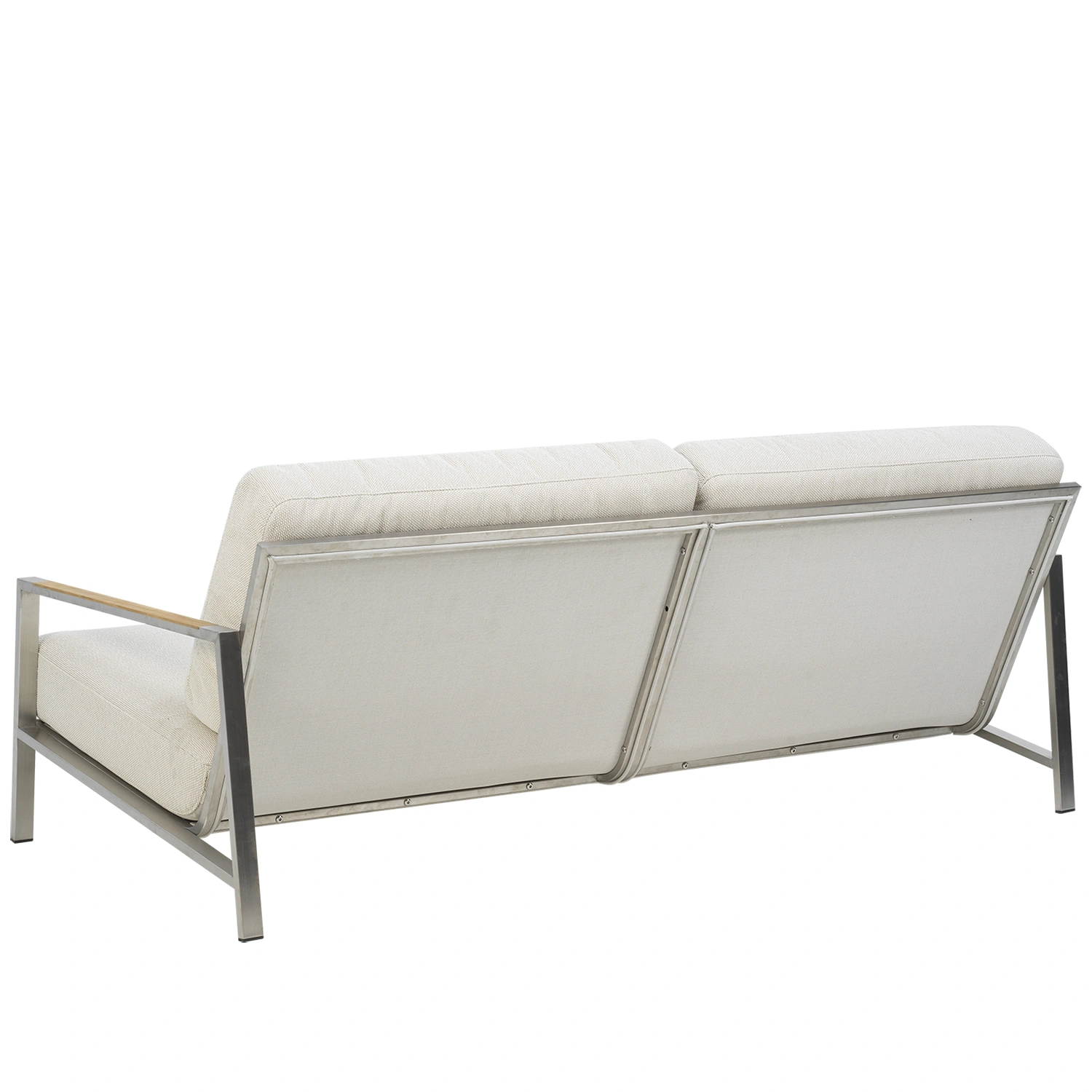 Snygg soffa som verkligen känns modern med sin stomme i rostfritt stål. Rejält sittdjup med skön lutning, här kommer du kunna koppla av med stil. Helheten formas av detaljerna och teakinslagen på armstöden förhöjer den genomtänkta känslan. Den låga sitthöjden förstärker känslan av modern loungestil och sköna dynor av högdensitetsskum med klädsel av fodrat olefintyg som gör dem vattenavvisande. Det här är en sittgrupp med snygga detaljer och vinklar. Rena linjer och tidlös design i en modern tappning.