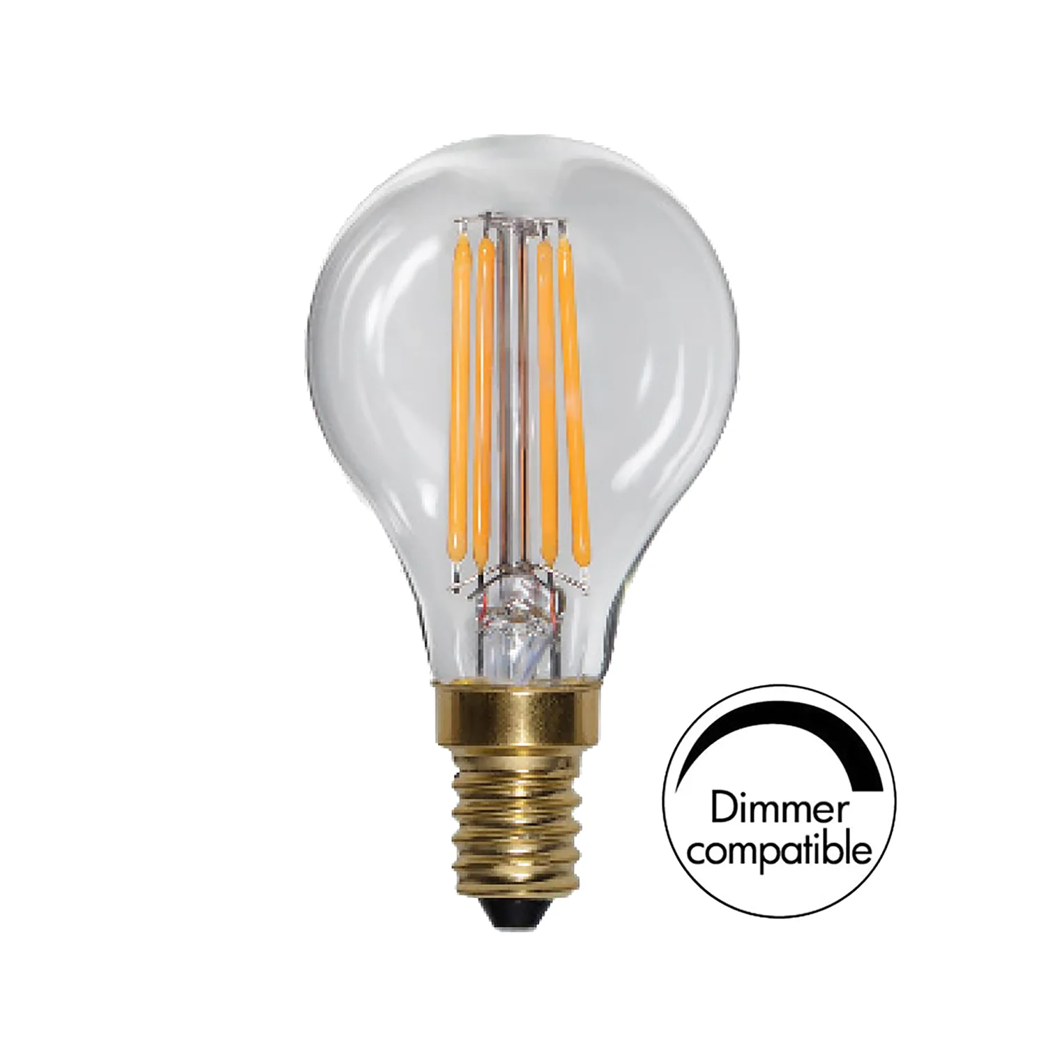 LED-lampa med E14-sockel och klart glas. Färgtemperaturen är 2100K och lampan är dimmerkompatibel.