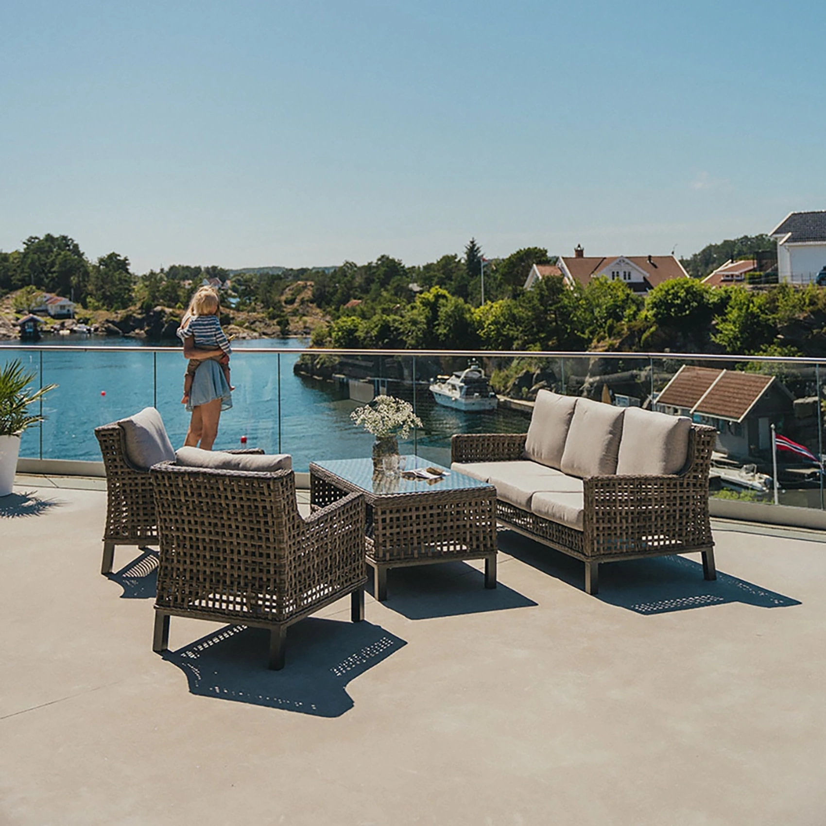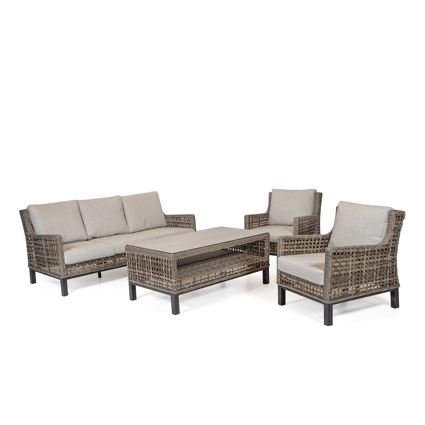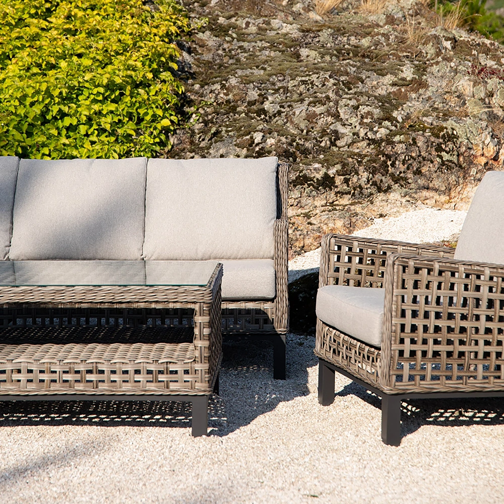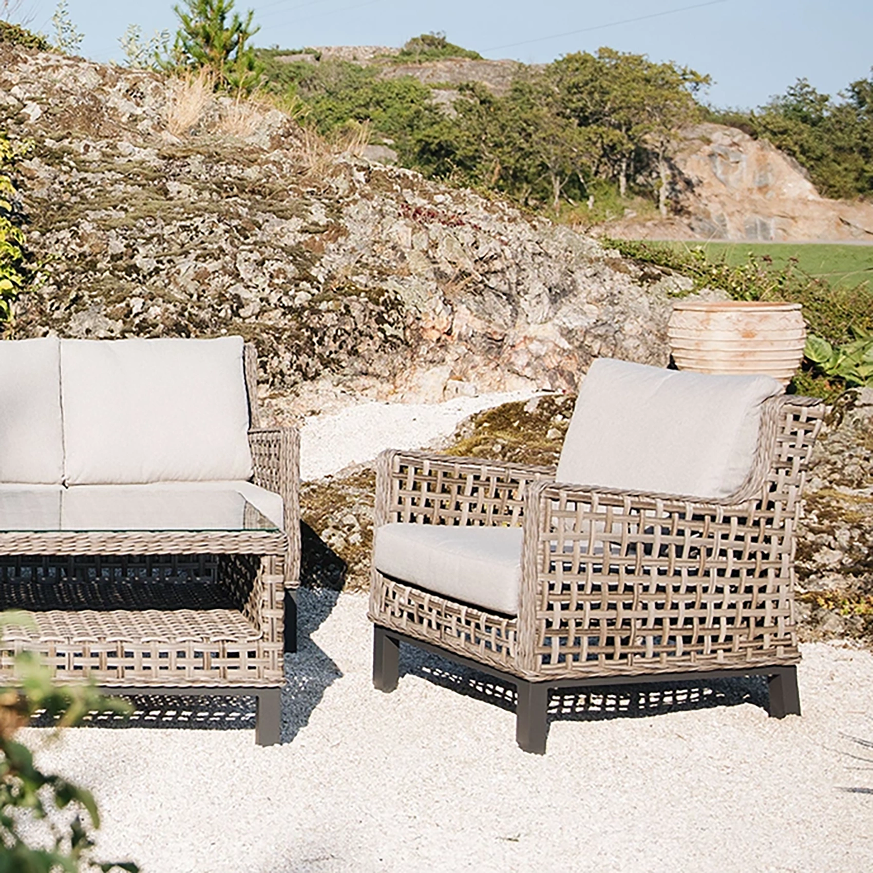 New Haven soffgrupp i drivvedsfärgad konstrotting med stomme och ben i antracitgrålackad aluminium. Dynor i kraftigt allväderstyg med avtagbara klädslar som går att tvätta.