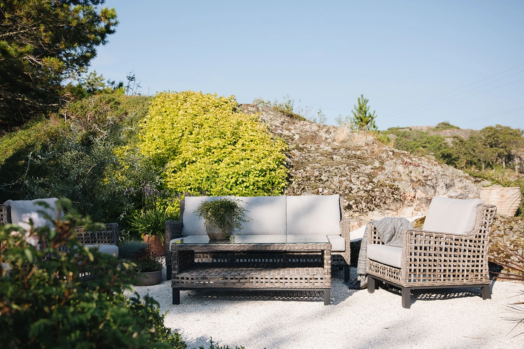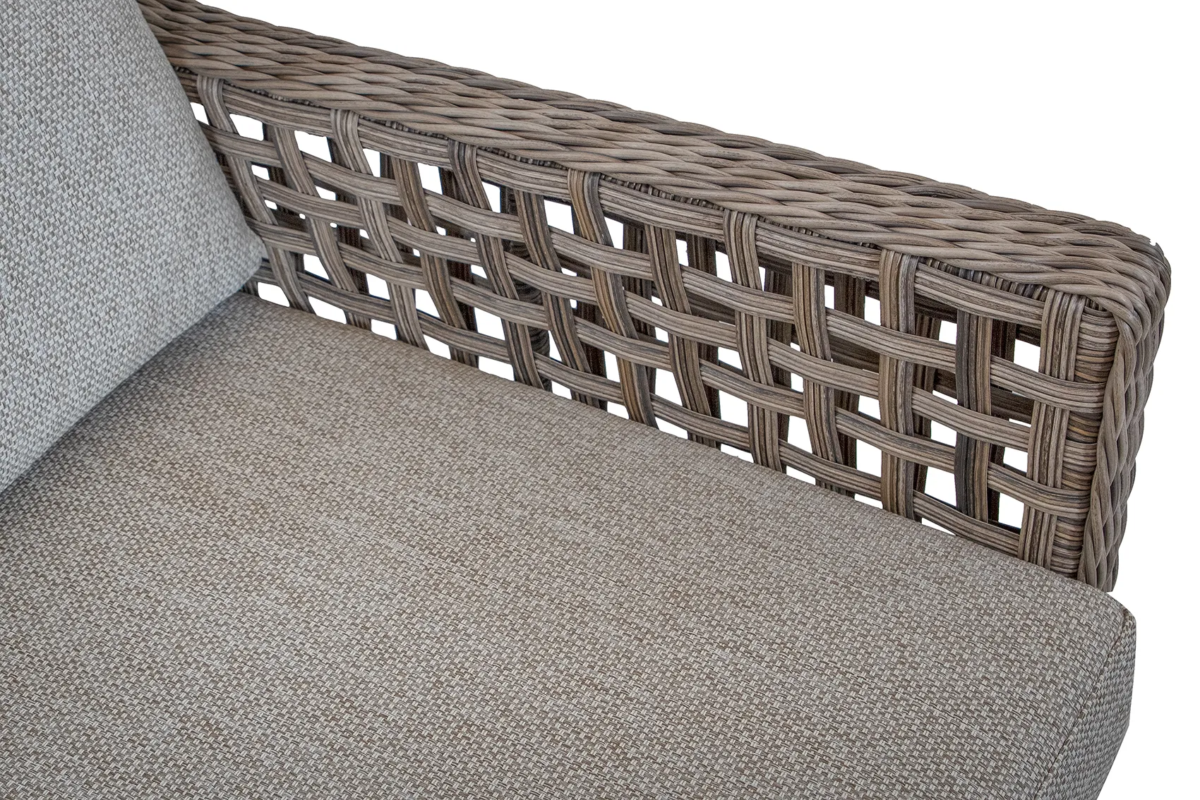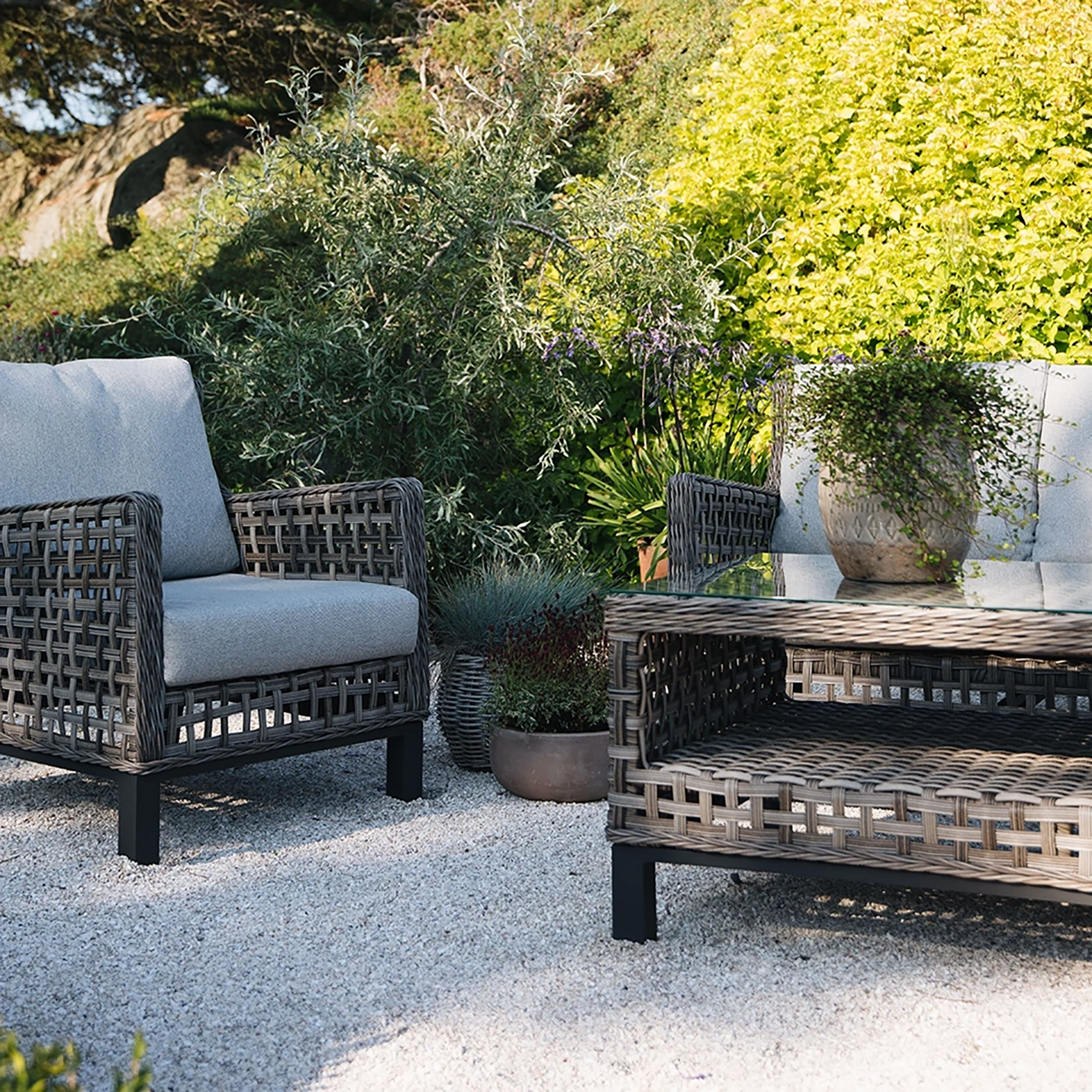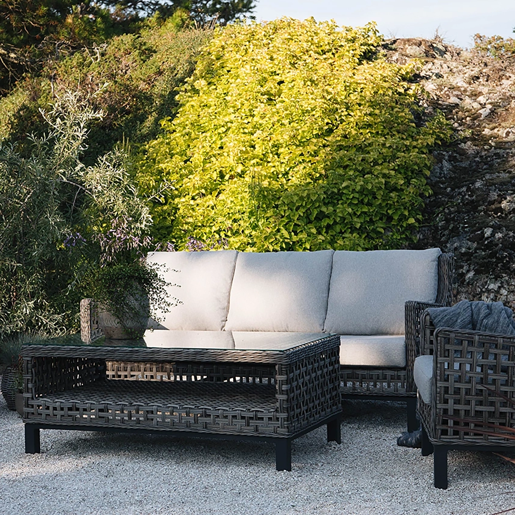 New Haven soffgrupp i drivvedsfärgad konstrotting med stomme och ben i antracitgrålackad aluminium. Dynor i kraftigt allväderstyg med avtagbara klädslar som går att tvätta.