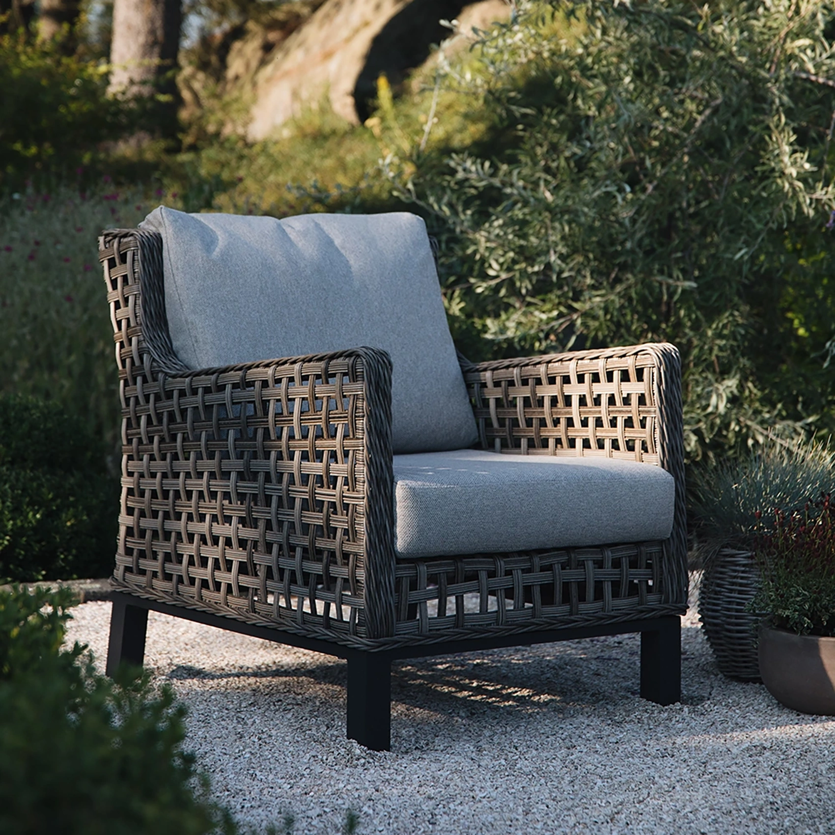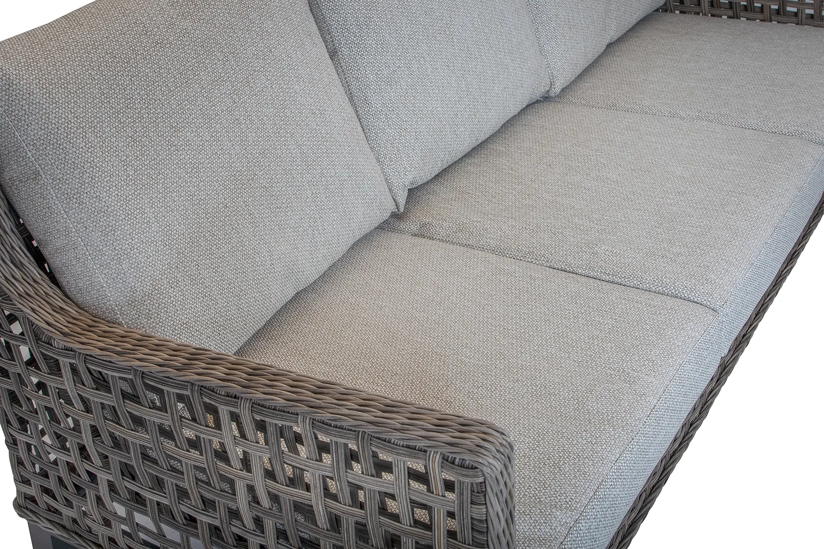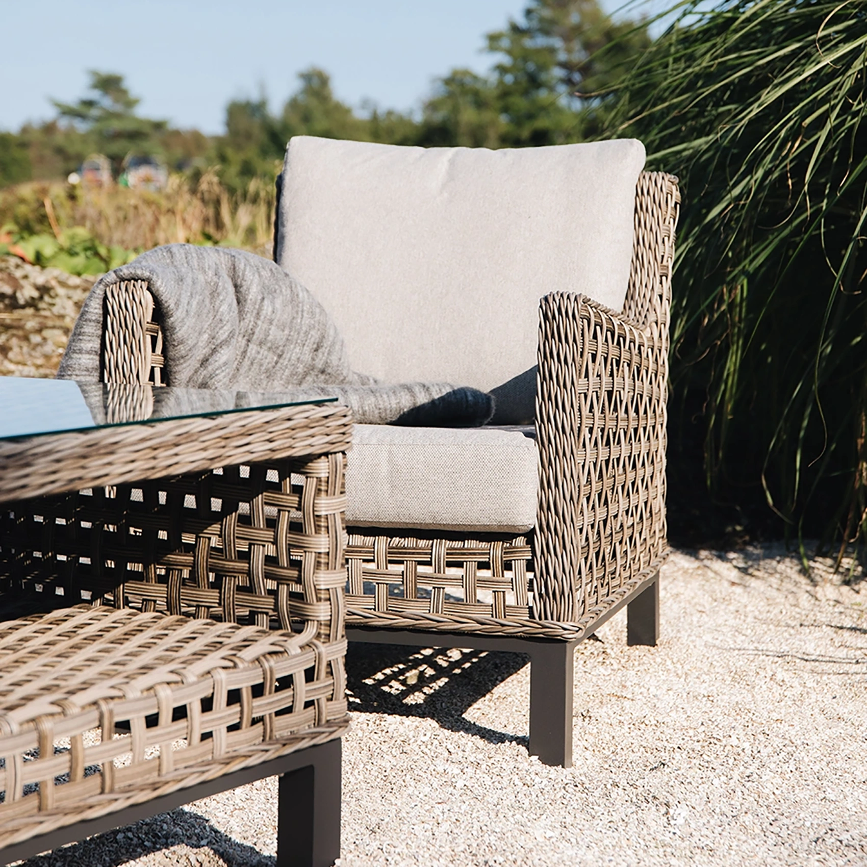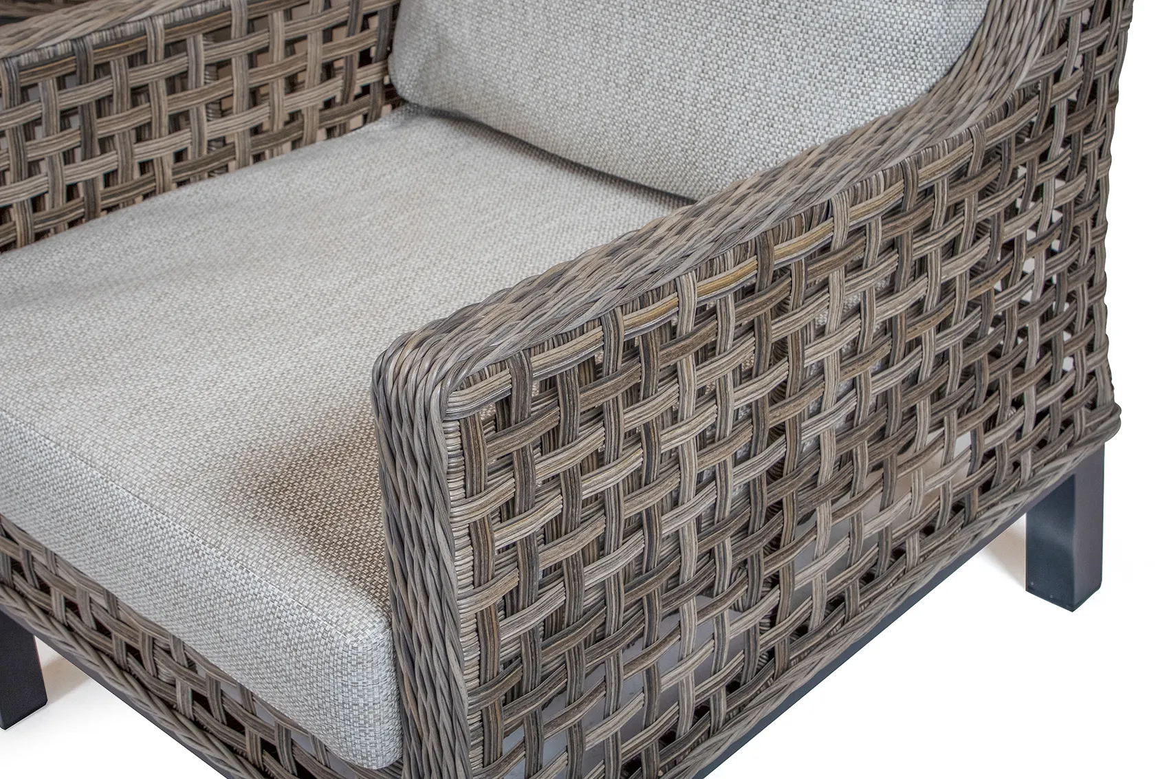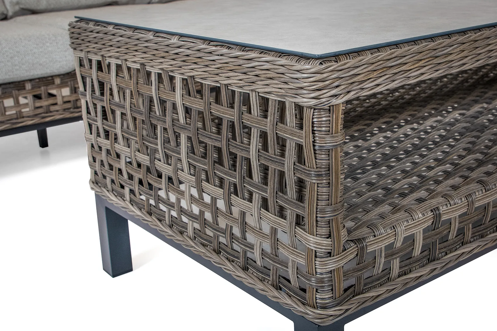 New Haven soffgrupp i drivvedsfärgad konstrotting med stomme och ben i antracitgrålackad aluminium. Dynor i kraftigt allväderstyg med avtagbara klädslar som går att tvätta.