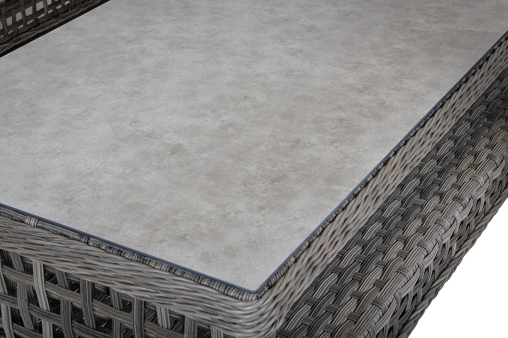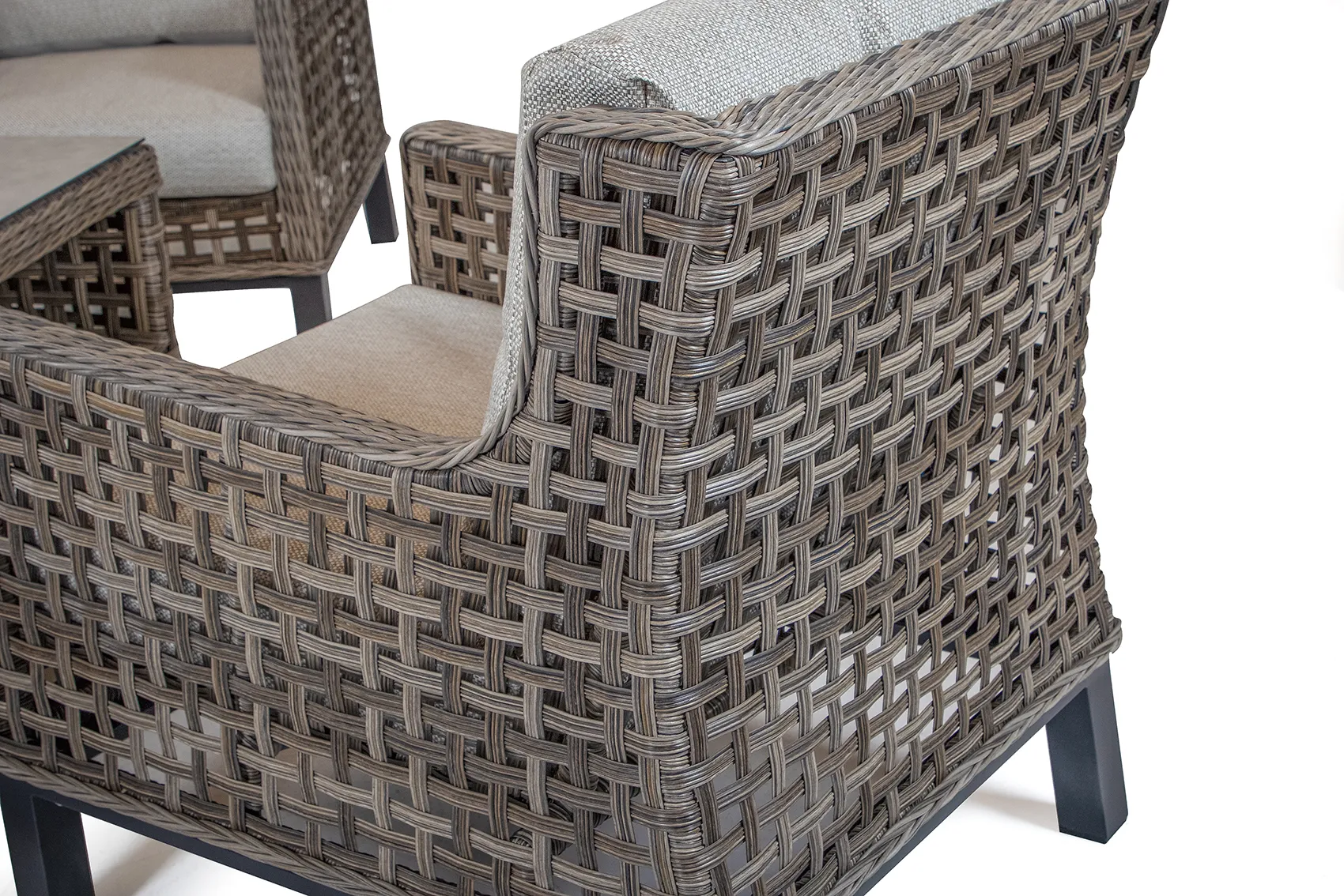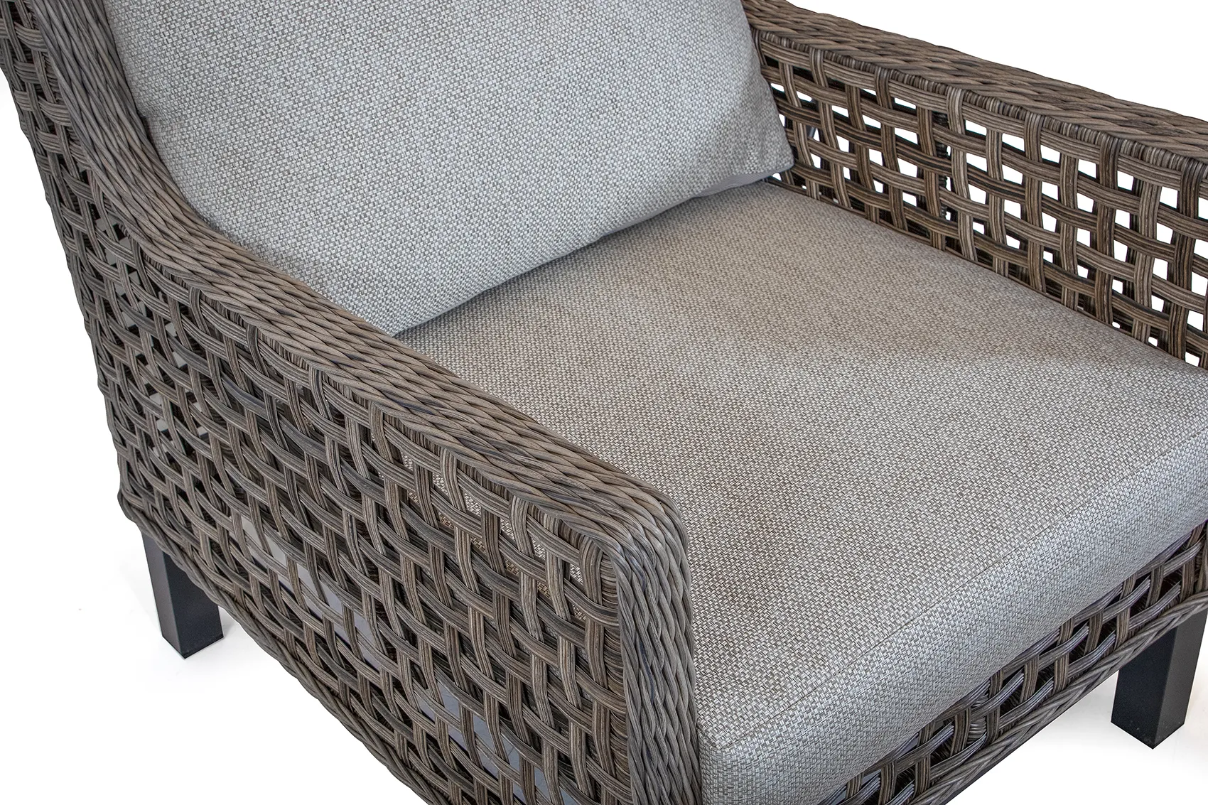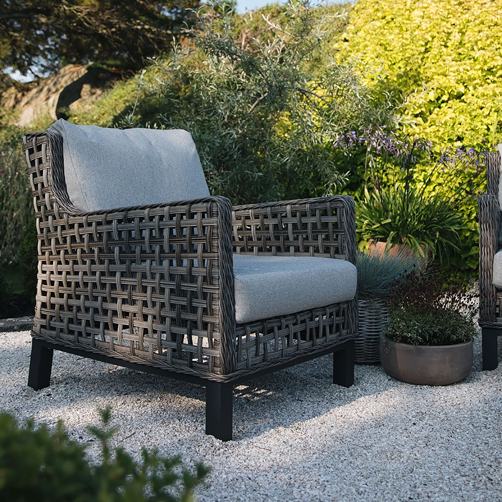 New Haven soffgrupp i drivvedsfärgad konstrotting med stomme och ben i antracitgrålackad aluminium. Dynor i kraftigt allväderstyg med avtagbara klädslar som går att tvätta.