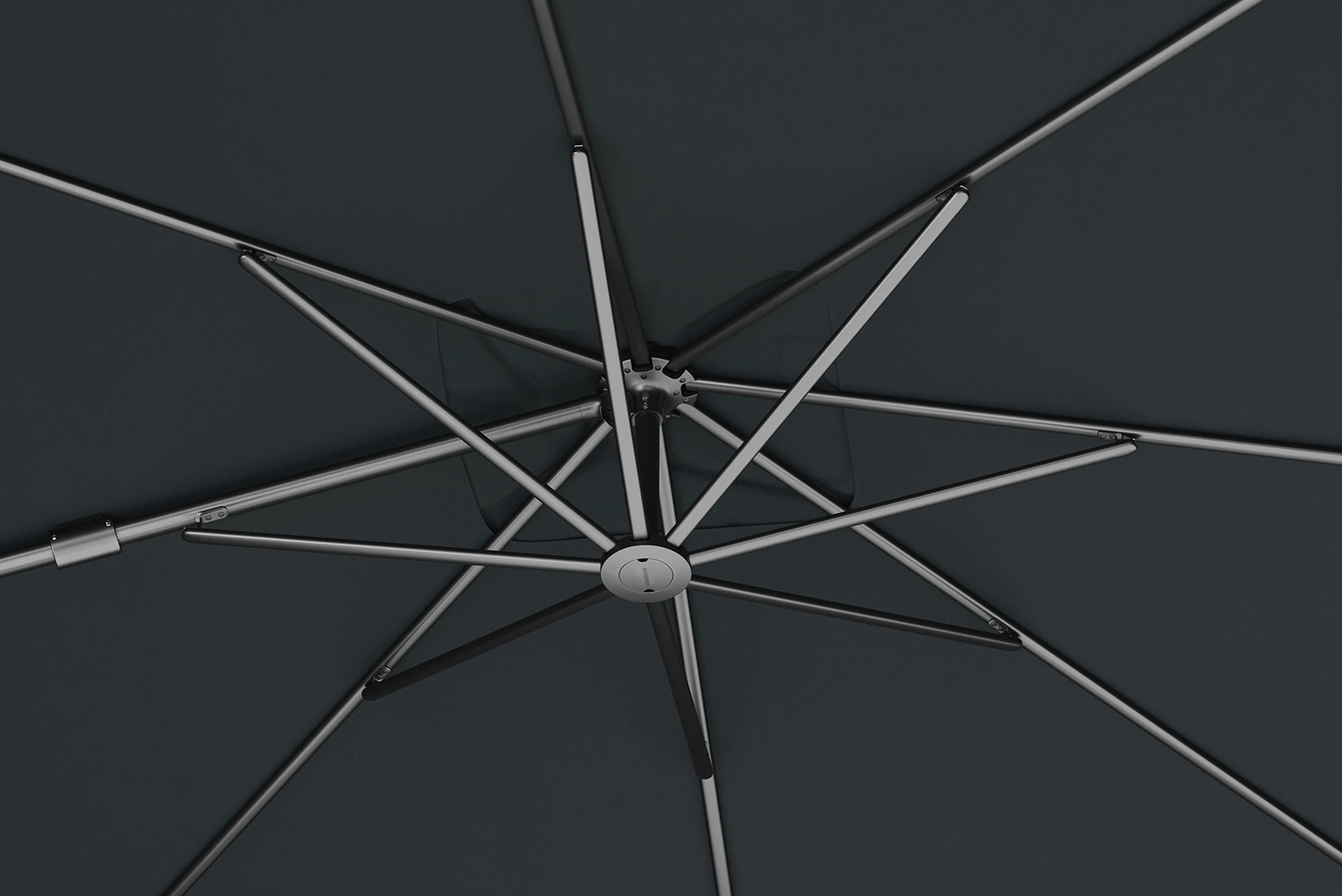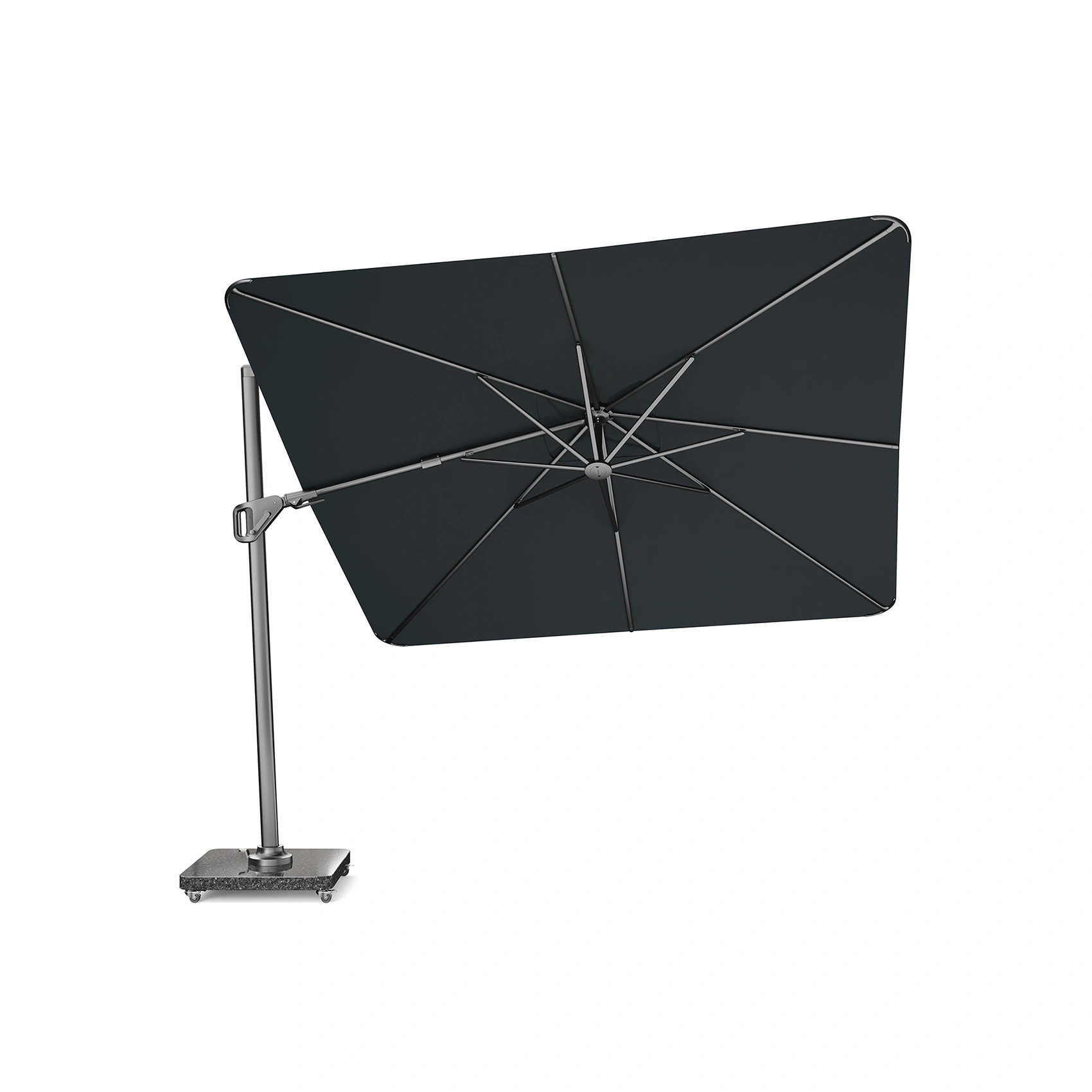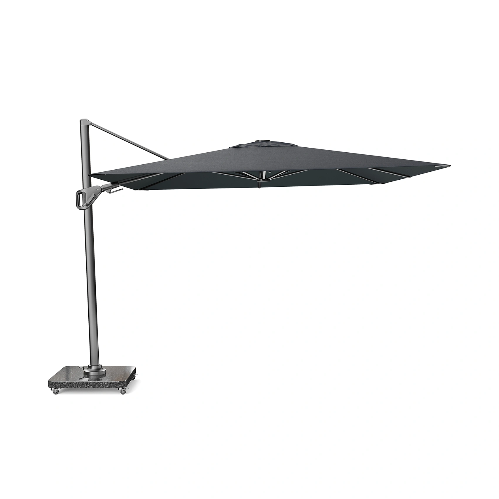Platinum Sun & Shade frihängande parasoll Nexus T² Premium med pulverlackerat aluminiumstativ och tyg i färgen Faded Black.