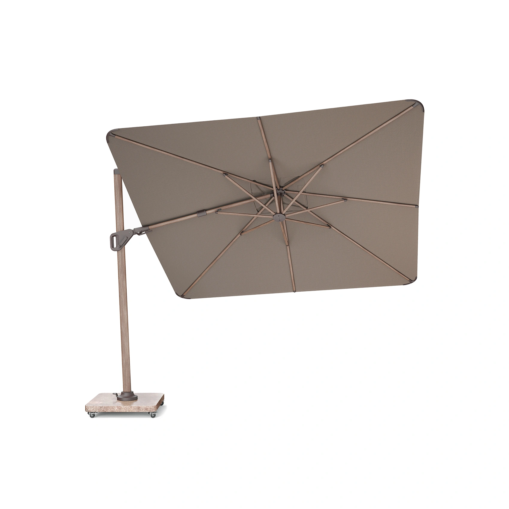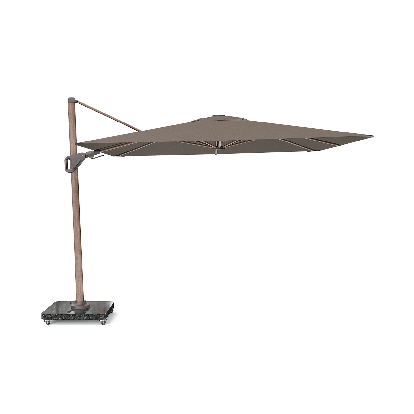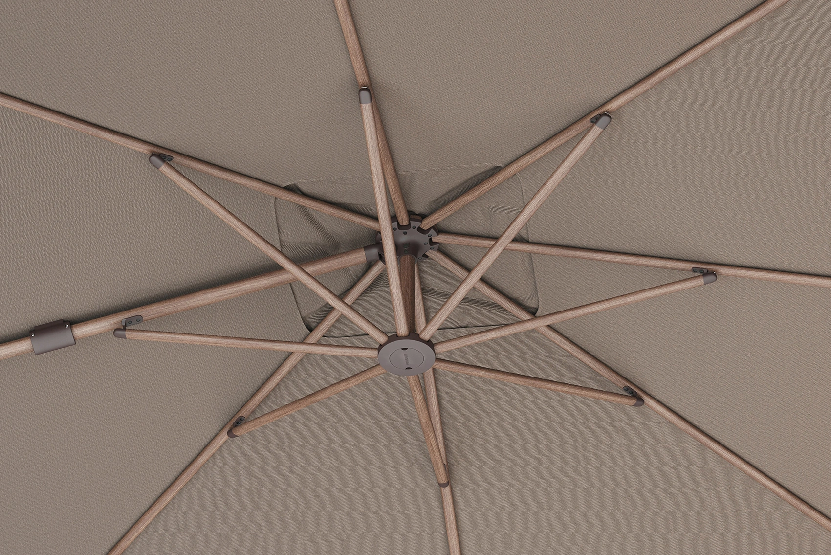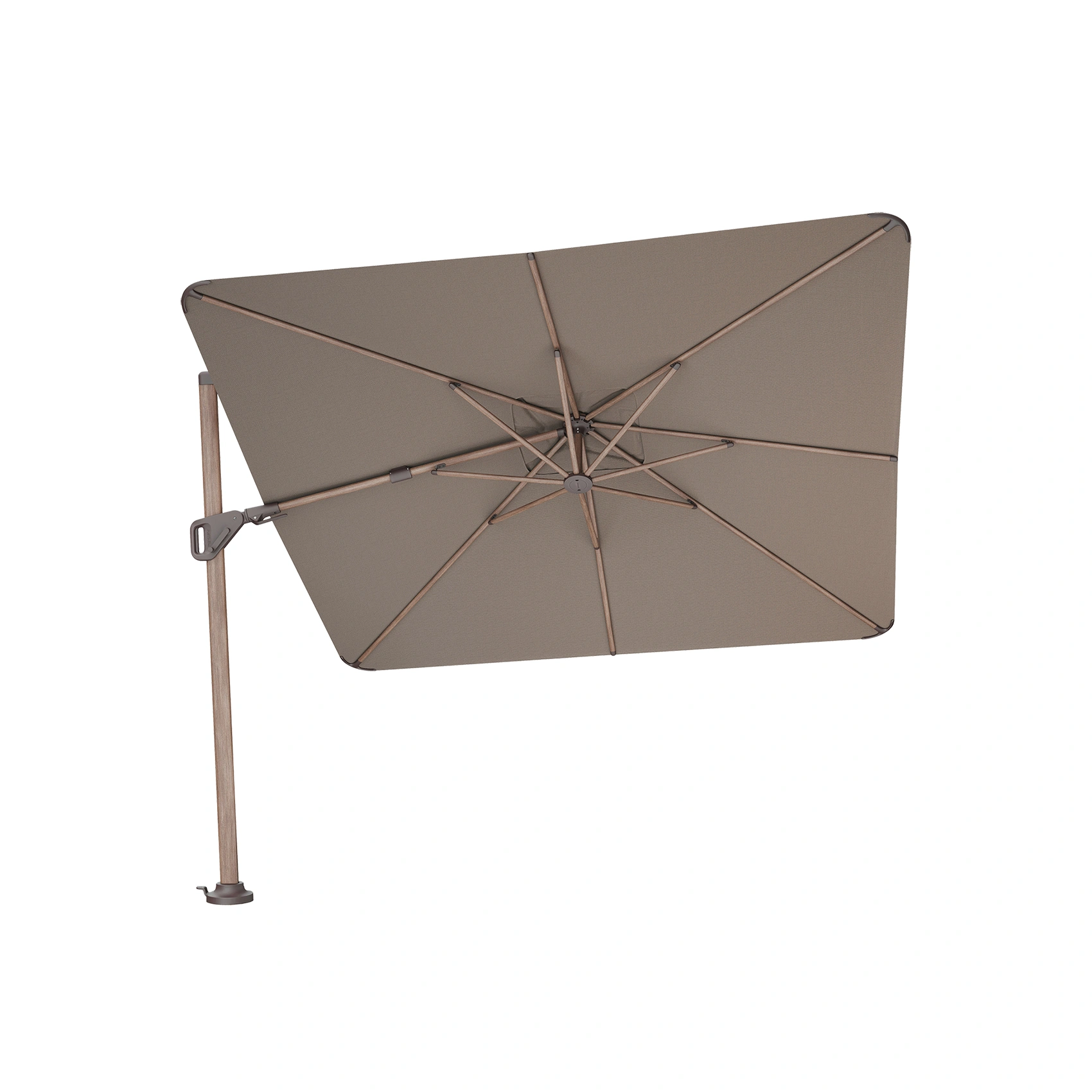 Platinum Sun & Shade frihängande parasoll Nexus T² Premium med aluminiumstativ med trälook-print i färgen Mocha och tyg i färgen Havana.