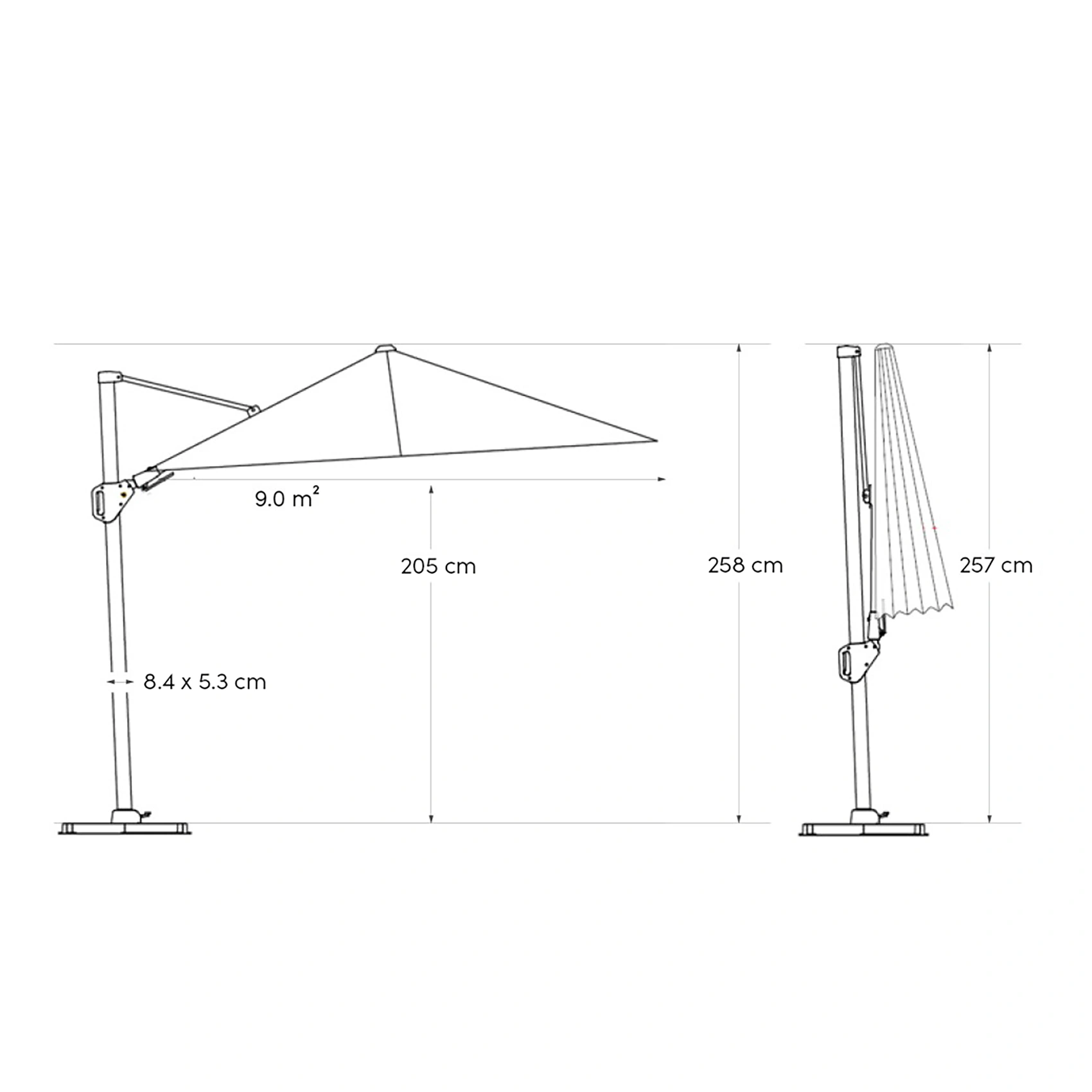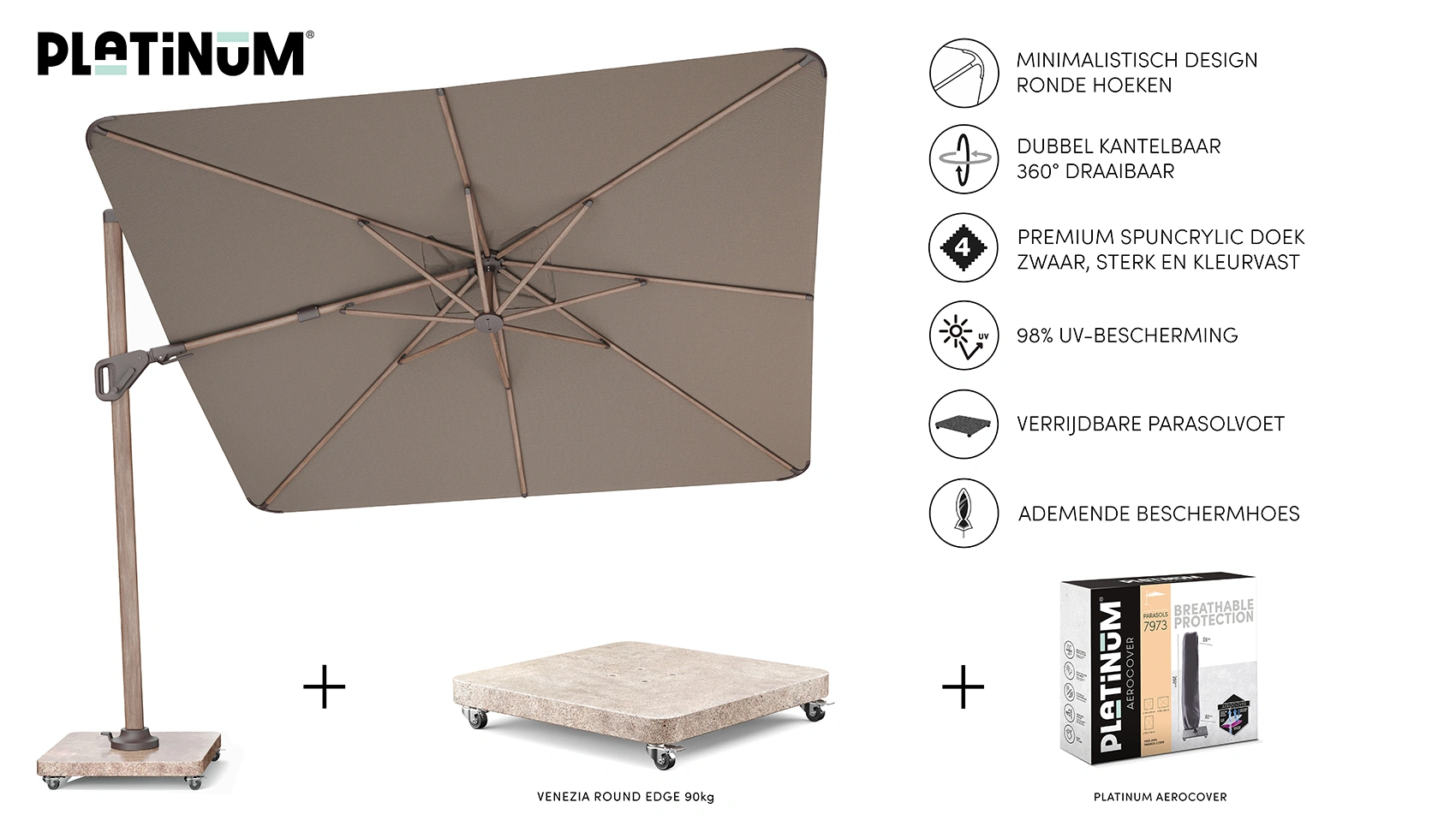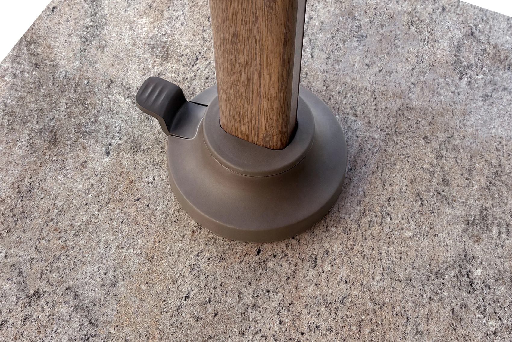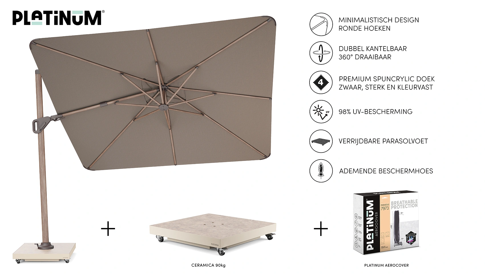 Parasollet levereras utan bas eller fotkryss. Parasollet kräver en parasollfotsvikt minst 90 kg. Vi rekommenderar att du placerar detta parasoll på en parasollfot från Platinum Sun & Shade. Dessa är försedda med hjul så att parasollet är lätt att flytta. Platinum Sun & Shade erbjuder även In-Ground parasollfötter som kan grävas ner eller gjutas fast i marken. Detta ger dig mer utrymme på din uteplats.