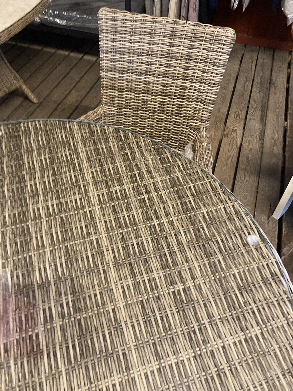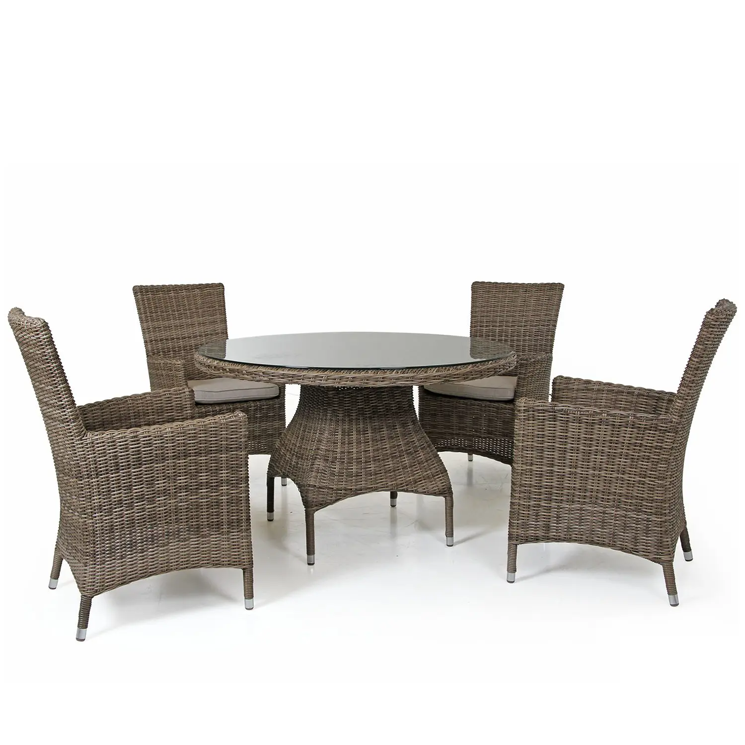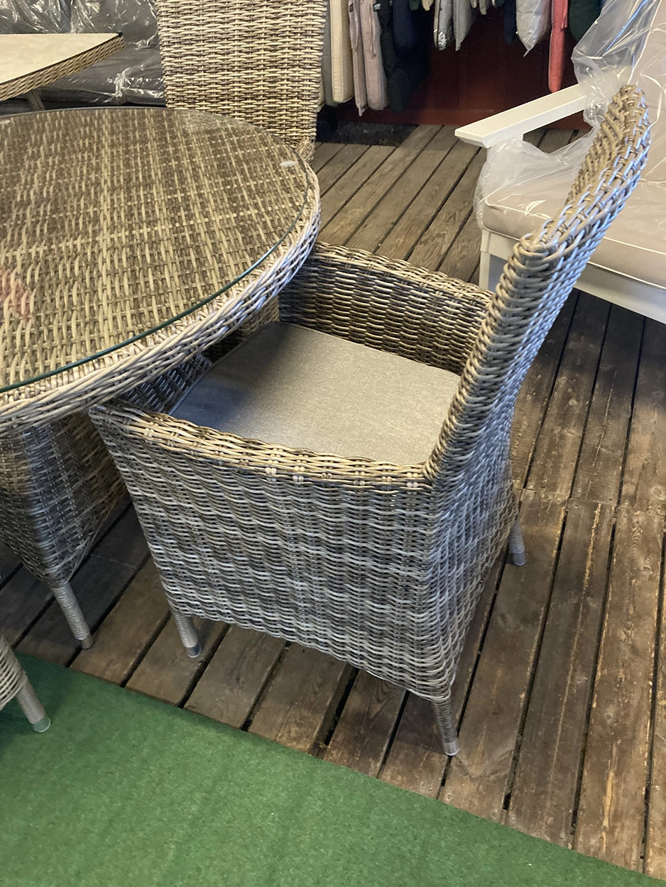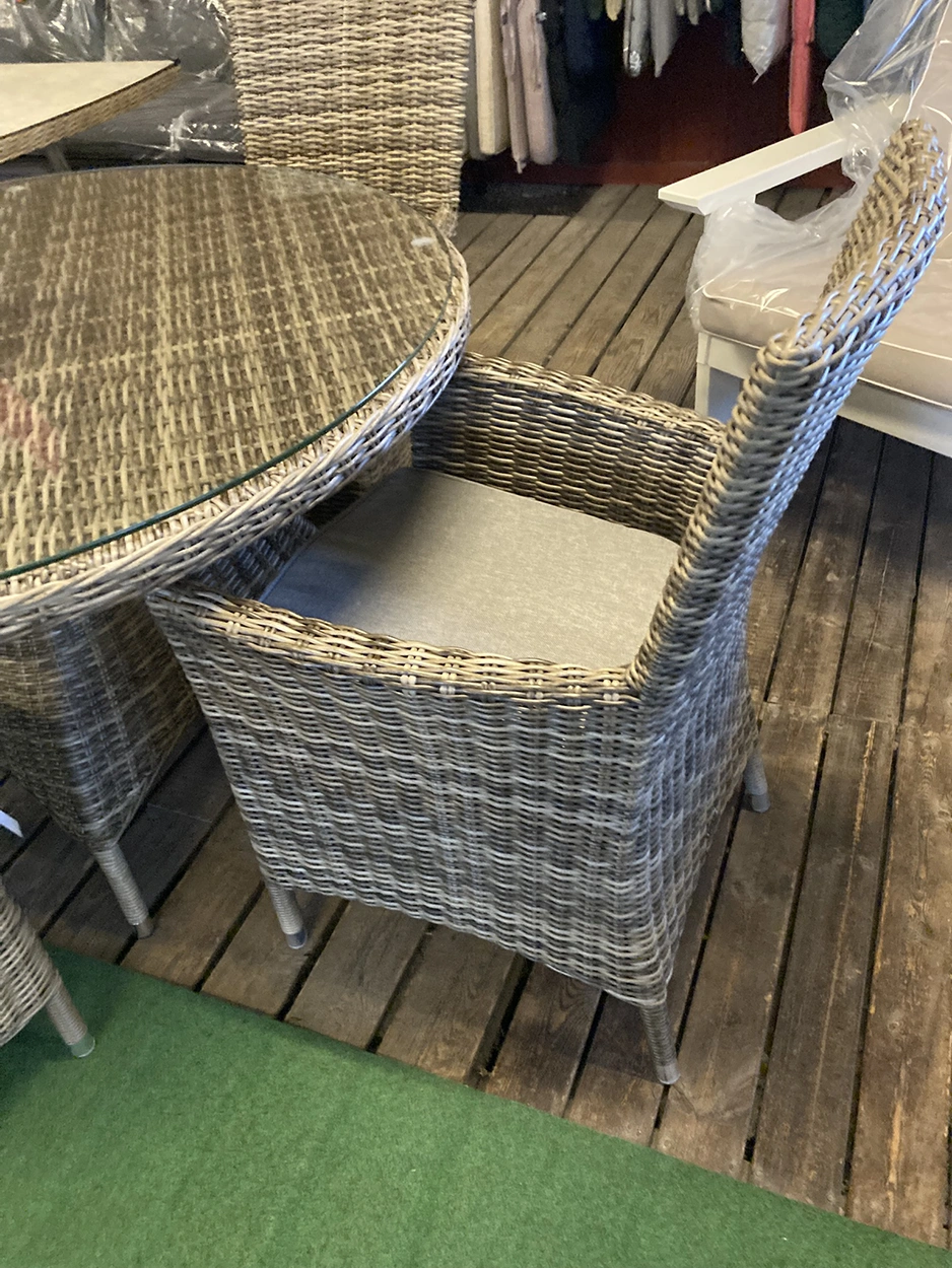Här visar vi en karmstol och bord med flätning av den nya halvrunda konstrottingen rustik och stomme av aluminium. Sitsdynor i grå polyester ingår.