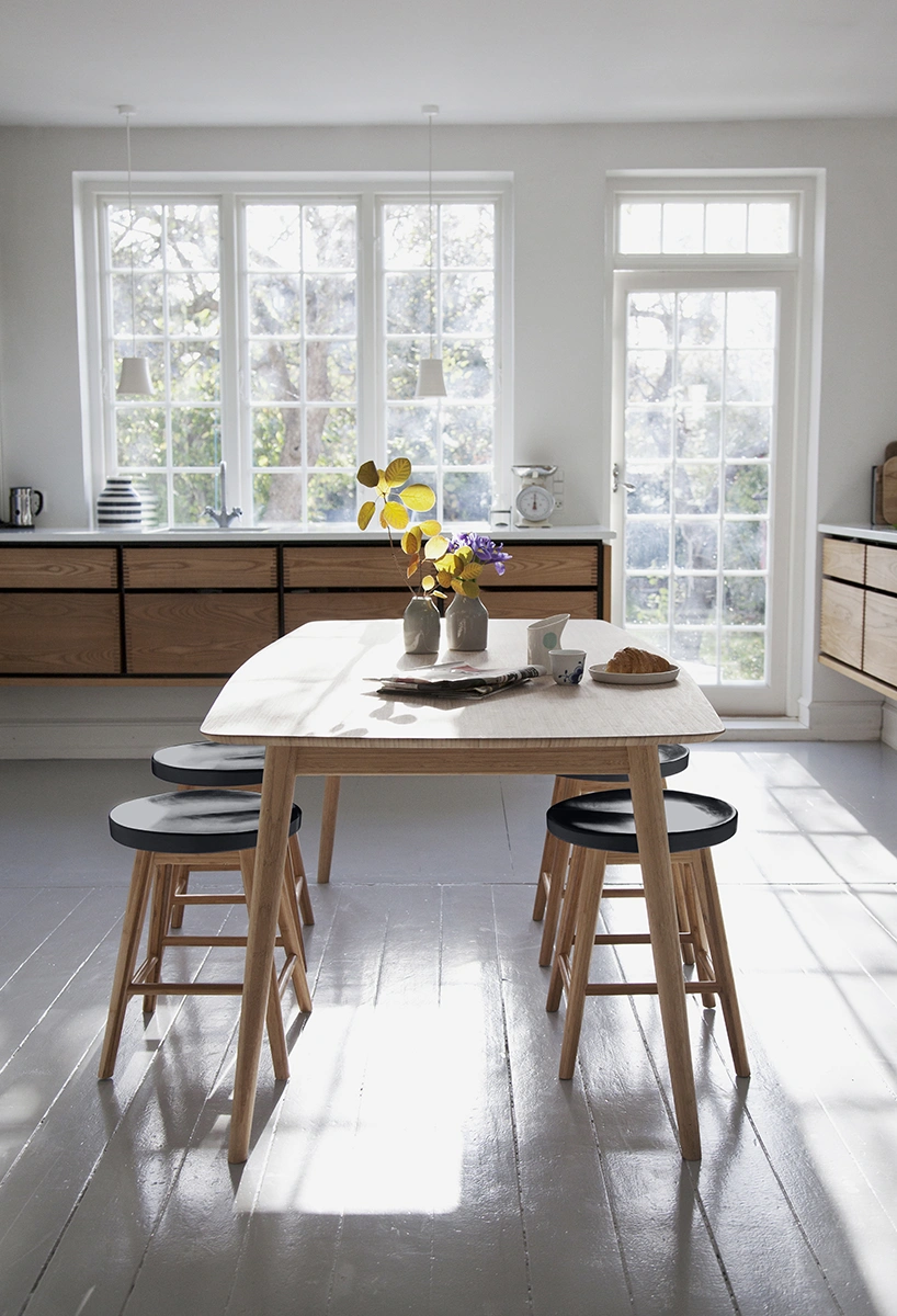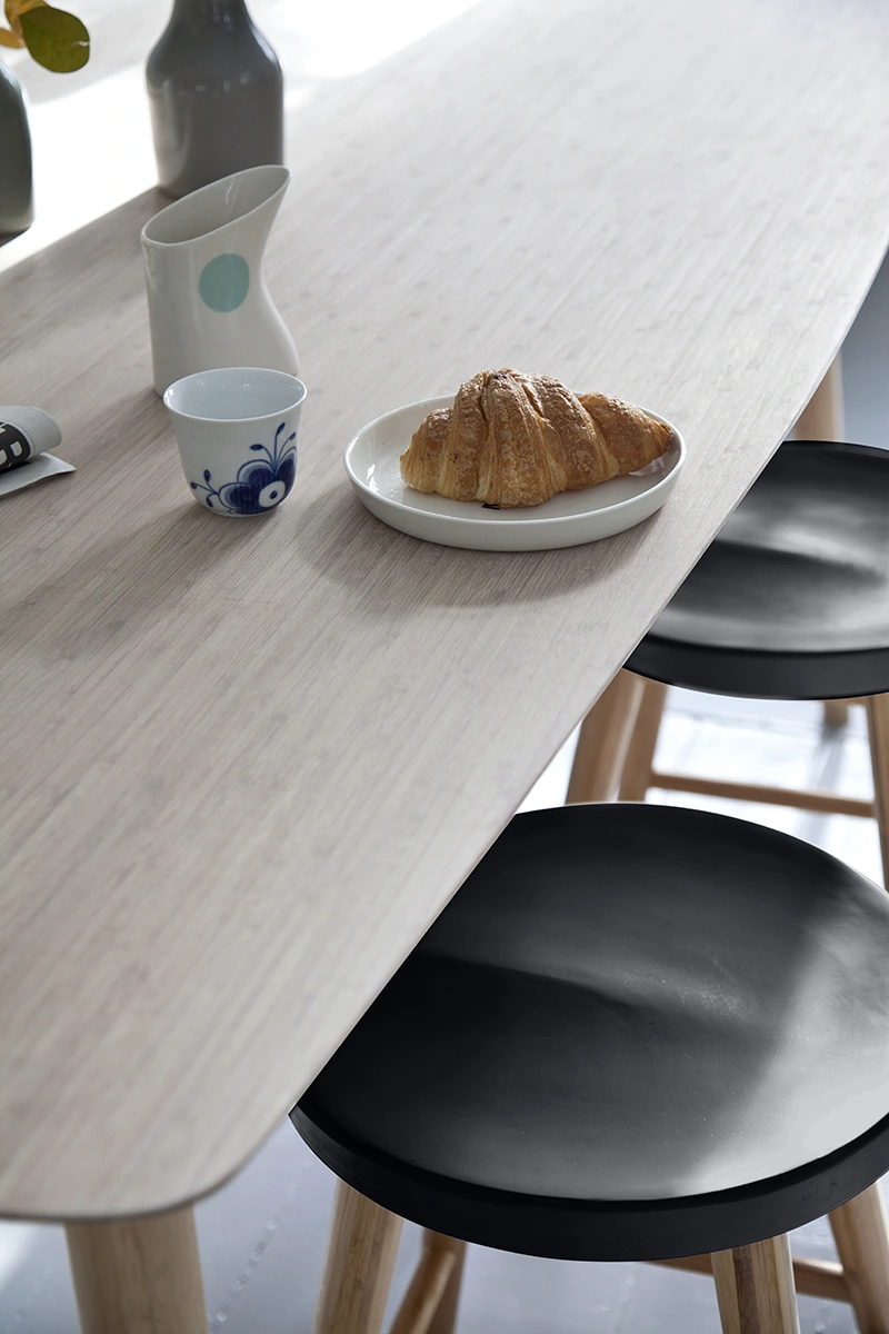 Tillverkat i massiv karboniserad bambu – ett slitstarkt och miljövänligt material som ger bordet lång livslängd och en varm känsla. Ytan är tålig och lätt att underhålla, vilket gör bordet lika praktiskt som vackert.