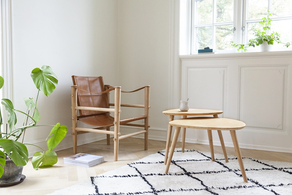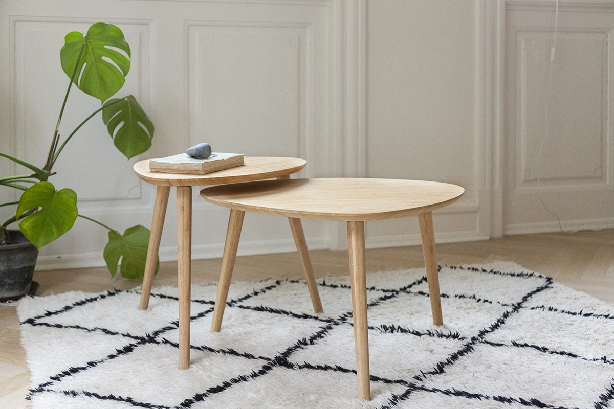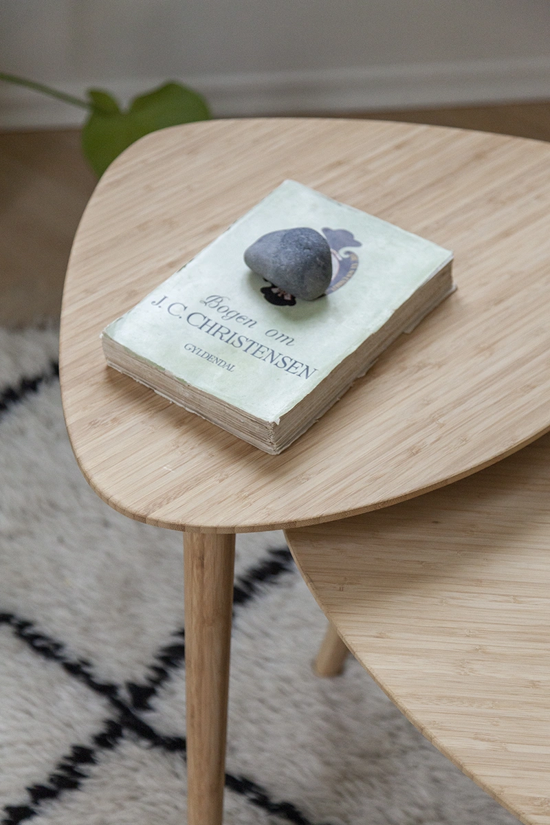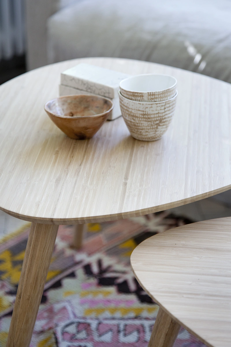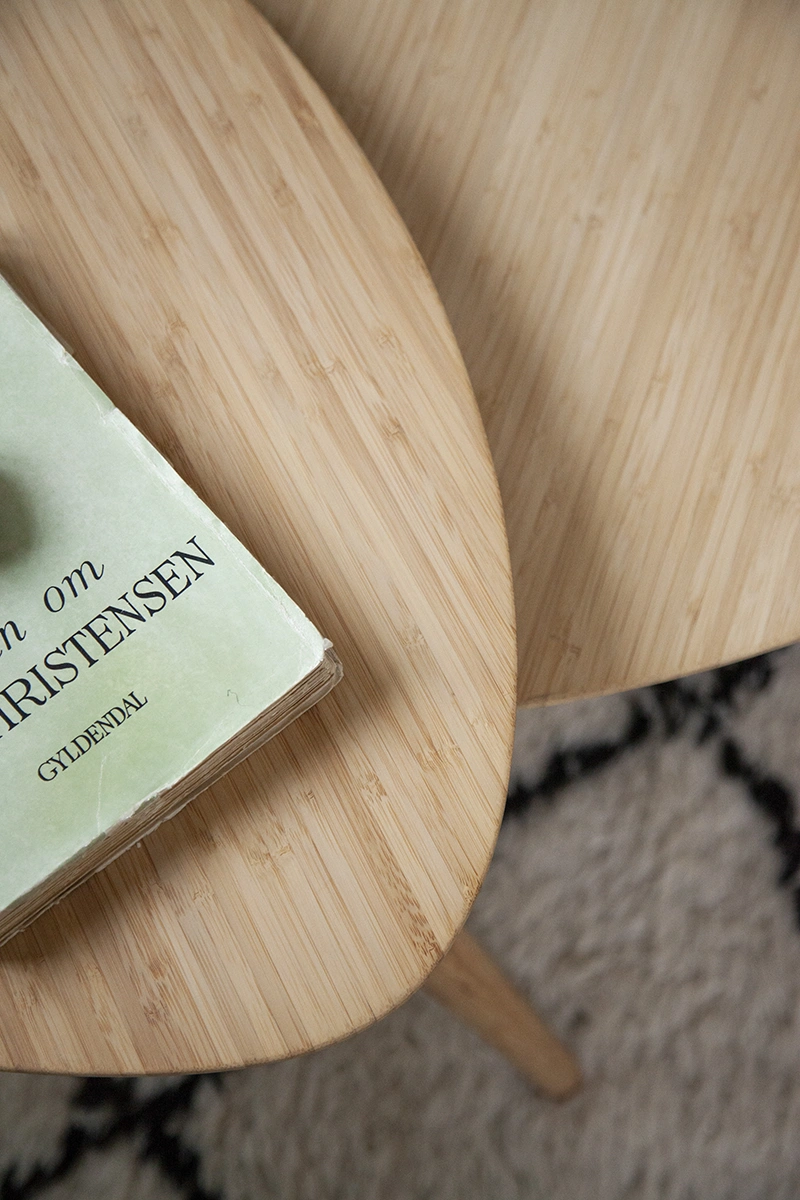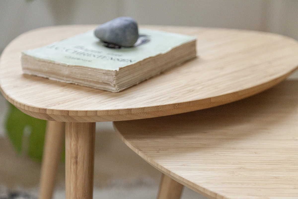 Tillverkat i massiv karboniserad bambu – ett slitstarkt och miljövänligt material som ger lång livslängd och en mjuk, organisk känsla. Ytan är tålig och lätt att underhålla, vilket gör borden lika praktiska som vackra.