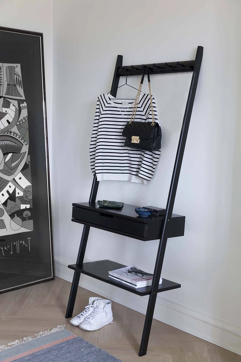 Noble väggmonterat entrébord med krokar och en liten låda för förvaring. En praktisk, snygg och mångsidig hallmöbel i svartmålad bambu. Möbeln har sex krokar, en låda och en hylla.