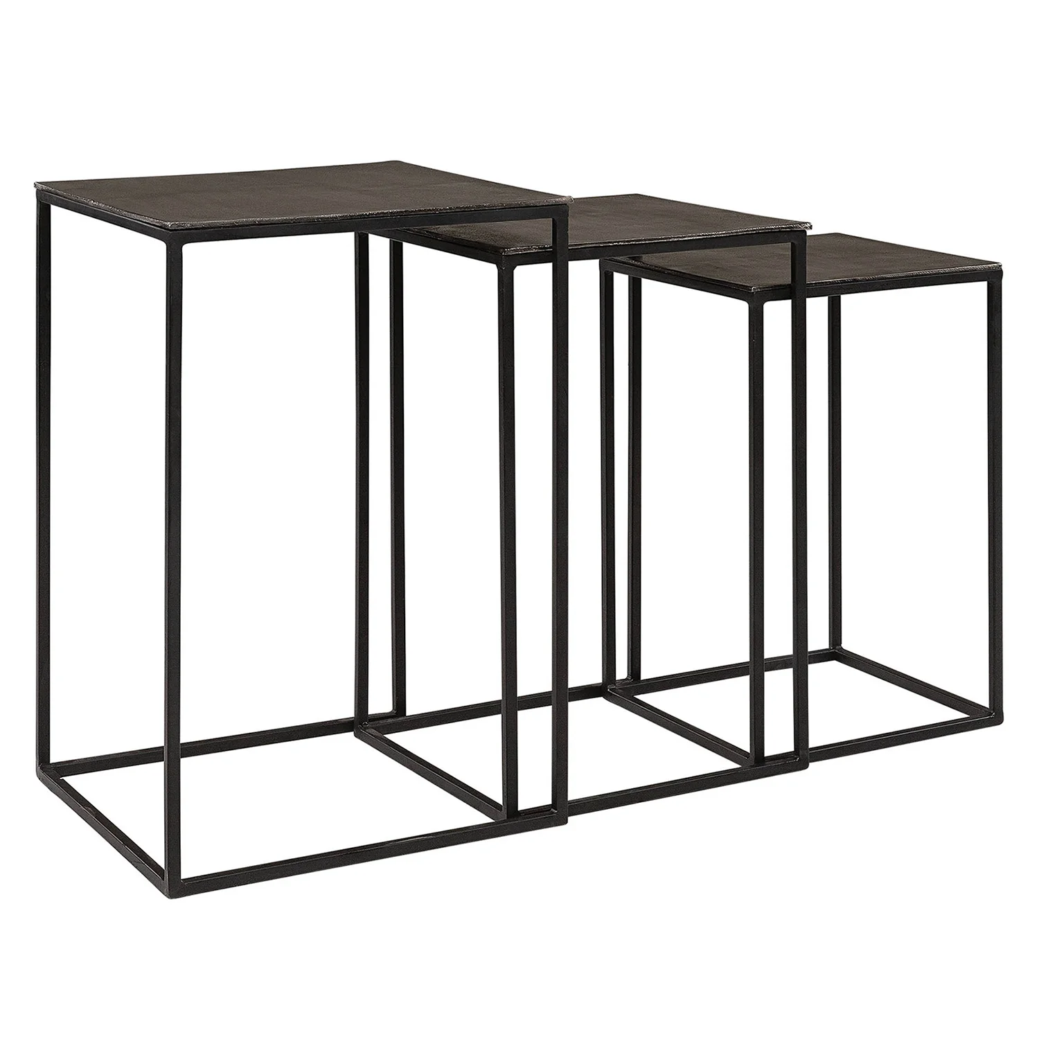 Nova set med tre stycken sidobord med bordsskiva i färgen grafit. Bordsstativen är tillverkade i järn och bordsskivorna är i aluminium.
