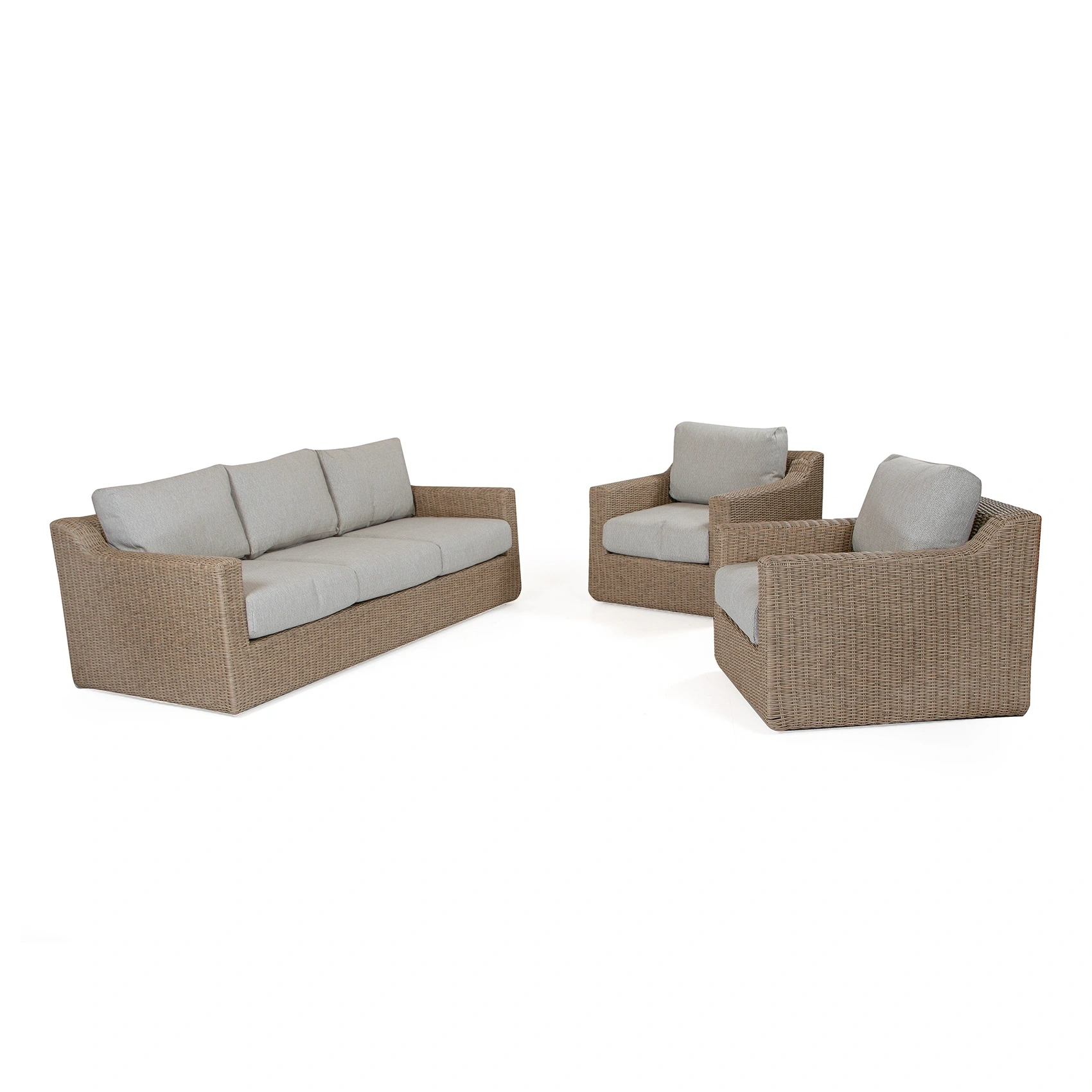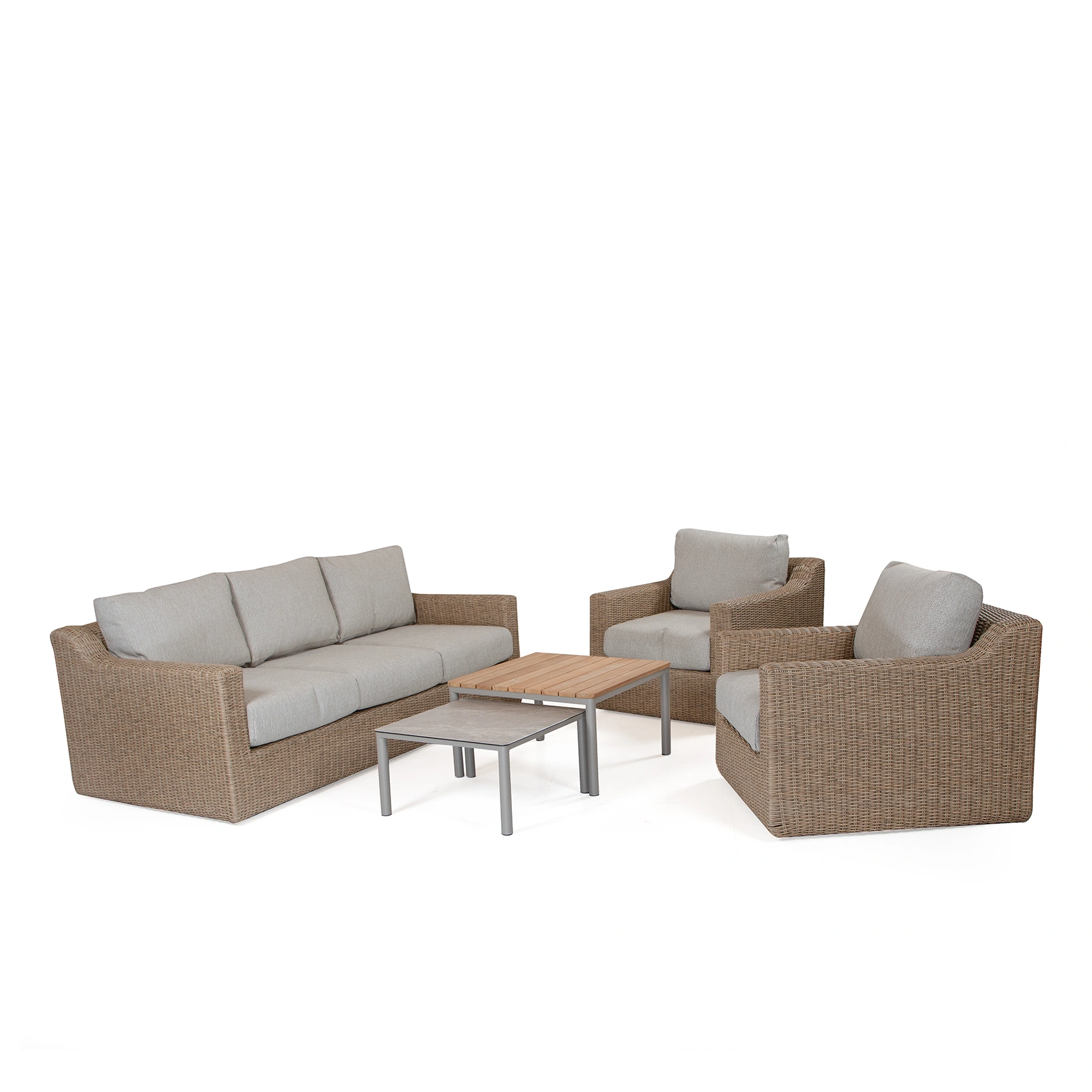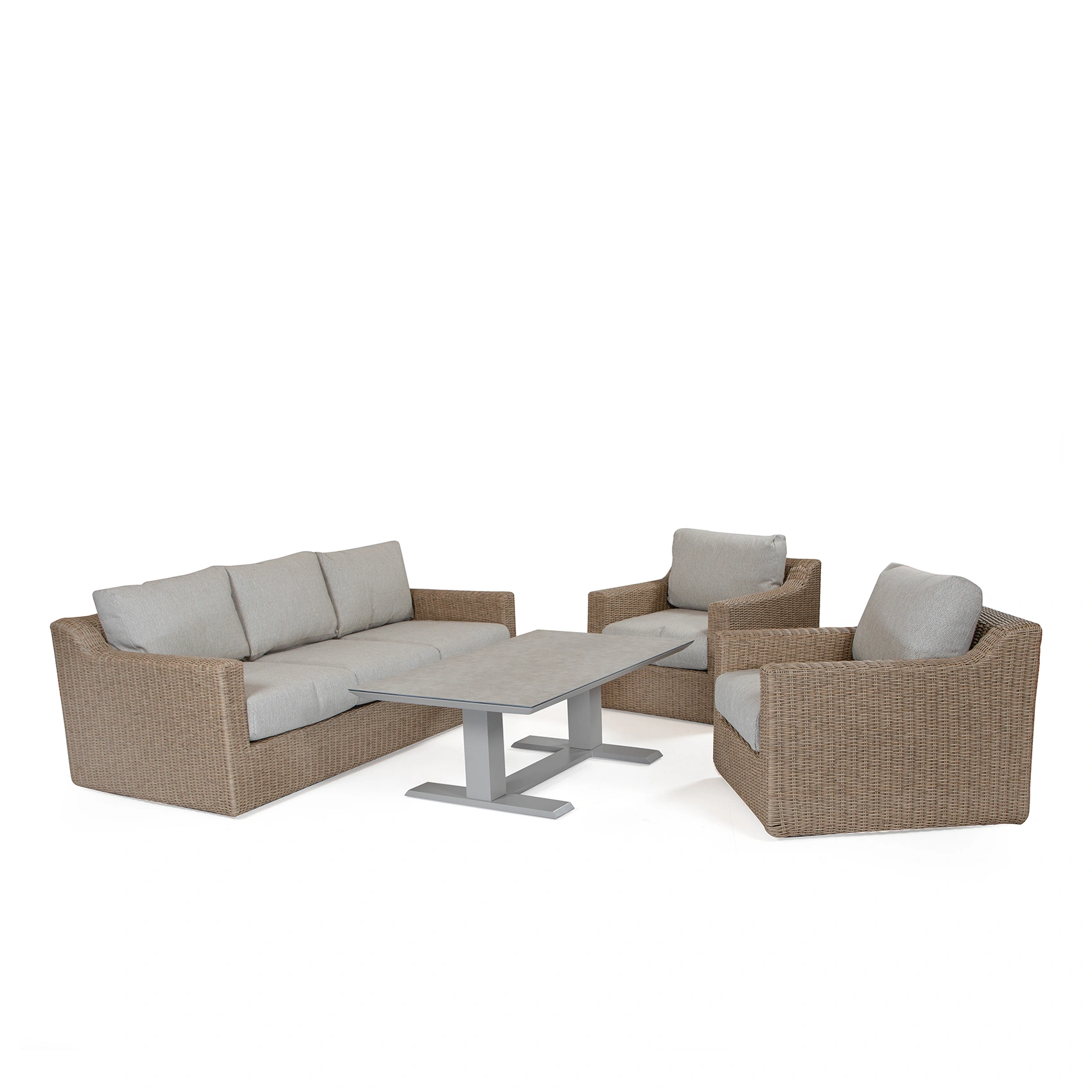 Pacific soffgrupp består av en 3-sitssoffa och två stycken fåtöljer – soffbord ingår inte. Soffgruppen passar mycket bra med ett soffbord i teak men kan även matchas med soffbord i andra material som exempelvis aluminium. Aluminiumsoffbord finns i i många olika färger och med bordsskivor i olika material.