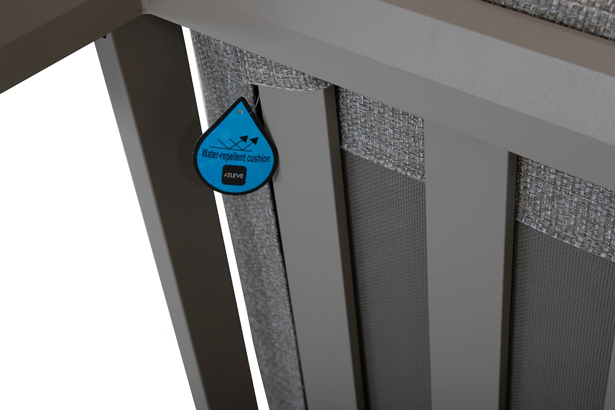 Stommen är tillverkad i aluminium, vilket gör möbeln både väderbeständig och lätt att flytta. Dynan är tillverkad i ett vattenavvisande allväderstyg som tål regnskurar och fukt. Skulle vatten tränga in, är dynorna konstruerade med ett nät i nederkant som gör att fukten kan rinna ut och dynan torkar snabbare. Tyget är slitstarkt, snabbtorkande och väl anpassat för nordiskt klimat. För att förlänga livslängden rekommenderas att dynorna förvaras torrt under längre regnperioder eller vintertid.