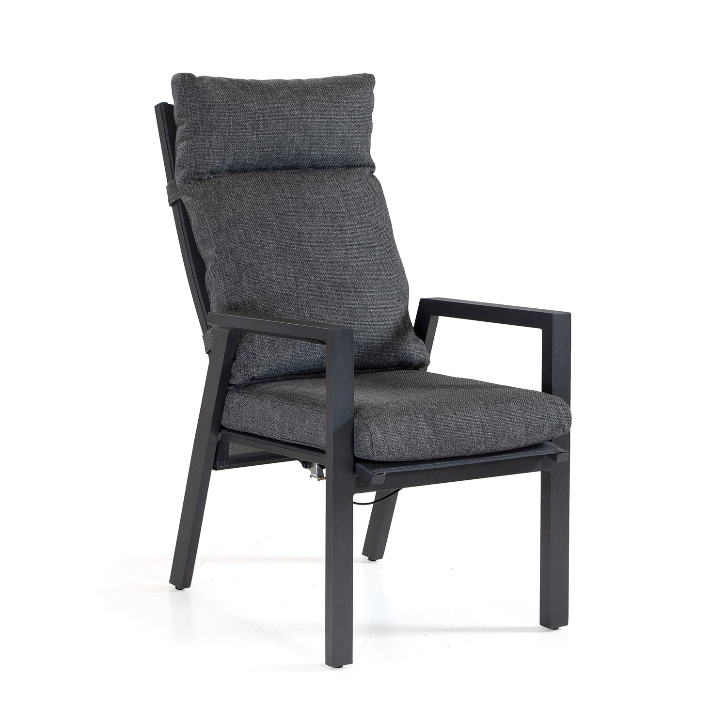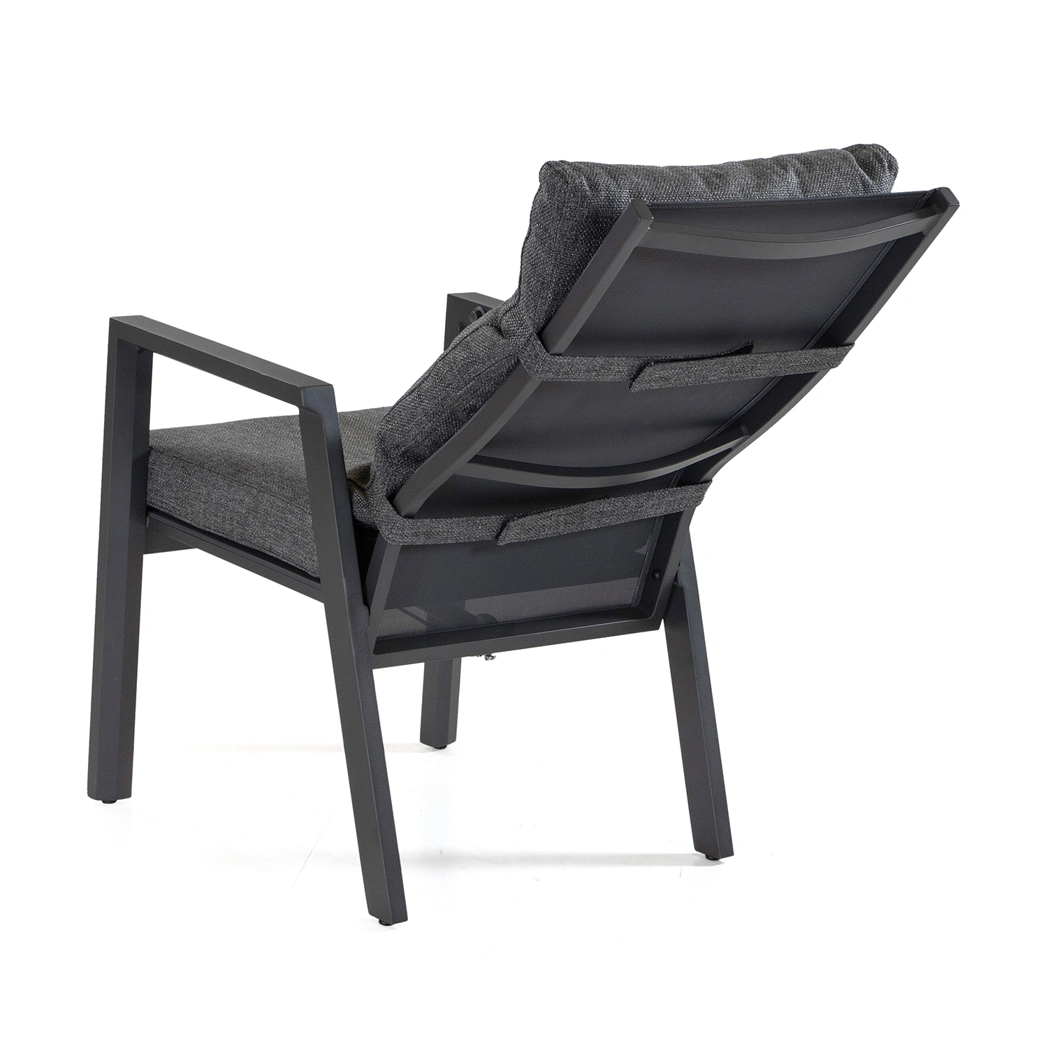Palau är en aluminiumserie från Atleve med både matgrupper, soffgrupper och tillbehör. Positionsstolen är tillverkad i aluminium med steglöst reglerbar rygg. Den tjocka dynan i mörkgrått ingår. Kombinera gärna med något av matborden från samma varumärke.