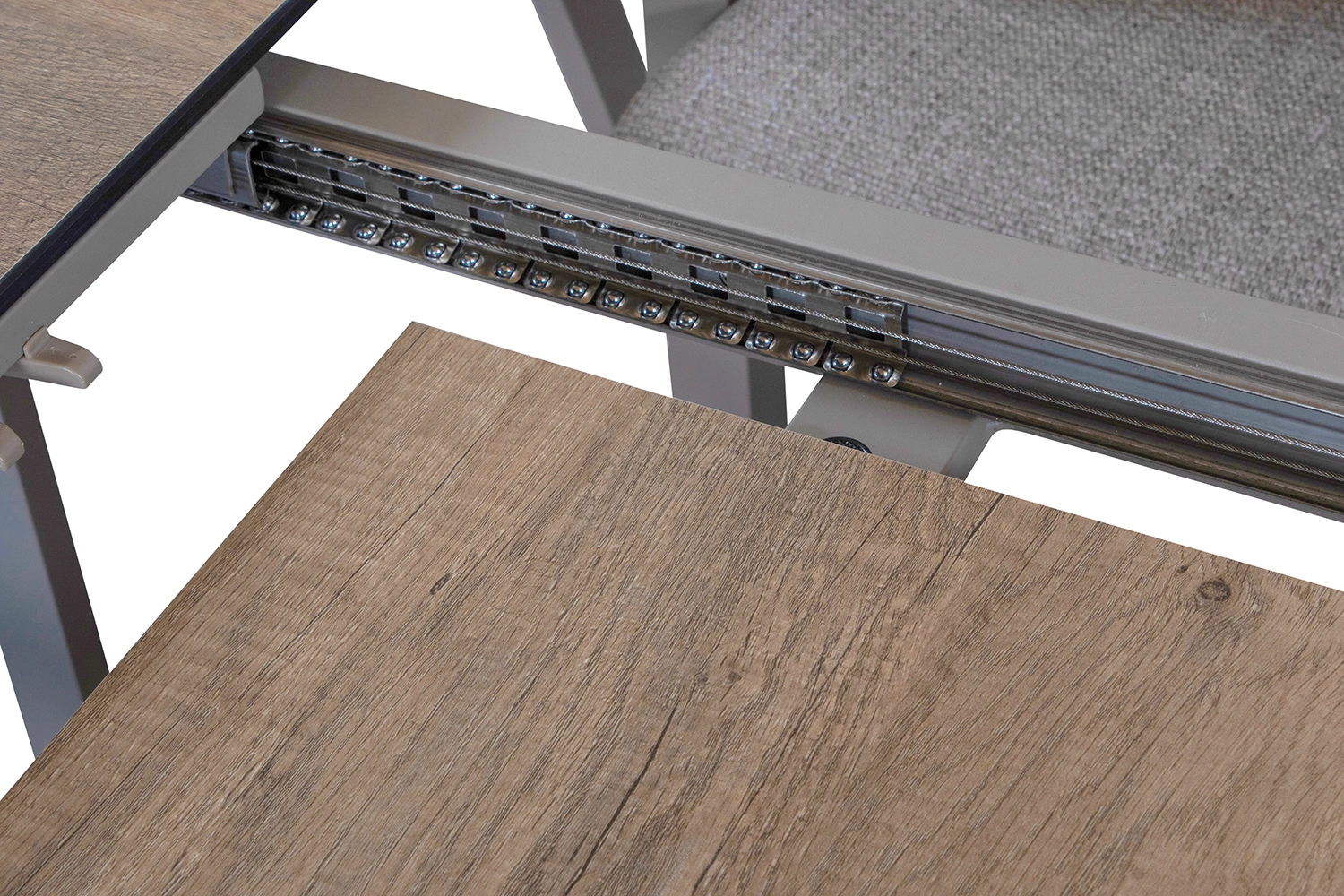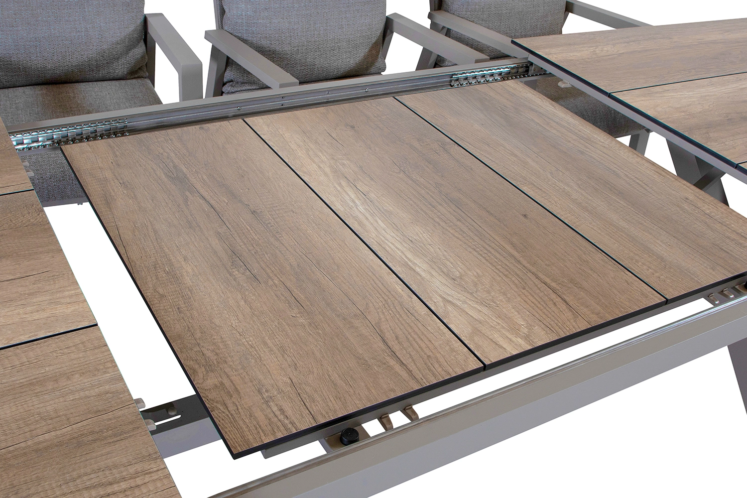 Palau är en aluminiumserie från Atleve med både matgrupper, soffgrupper och tillbehör. Positionsstolen är tillverkad i aluminium med steglöst reglerbar rygg. Den tjocka dynan i färgen greige ingår. Bordet är tillverkat i samma khakifärgade aluminium som stolen med kryssben och en bordsskiva i kompaktlaminat. Bordet är i grunden är 240 cm långt men helt utfällt med de extra förlängningsskivorna blir det hela 315 cm långt. Runt bordet kan man ha upp till 10 Palau-stolar.