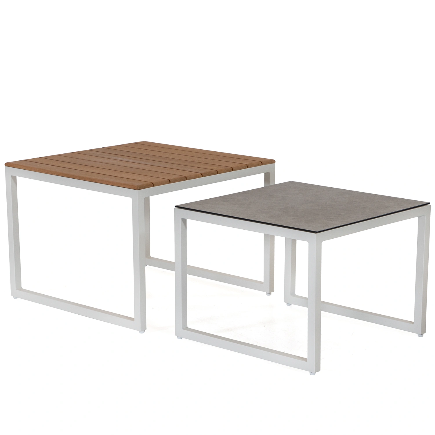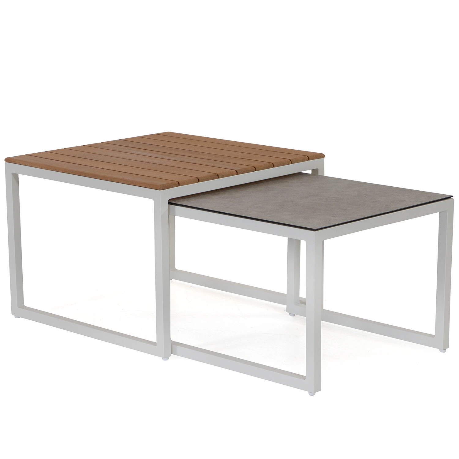 Palermo låg hörnsoffgrupp från Atleve. Palermosoffan är tillverkad i aluminium med detaljer i teak. Satsbordet, bestående av ett bord med teakskiva och ett bord med 3D-printad glasskiva, ingår.
