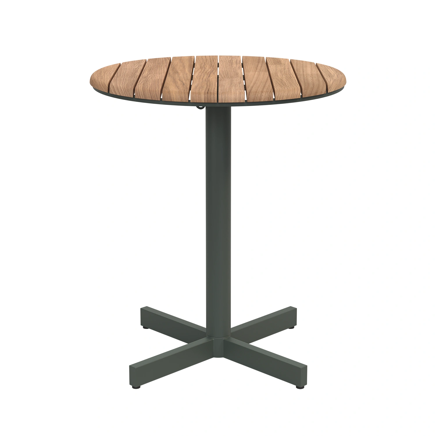 Pelagus Cafébord (Ø62,5 cm) har en rund, mittbaserad design med en bordsskiva i massiv teak och en pulverlackerad aluminiumram, tillgänglig i ljus elfenben och grönt. Utrustat med en länkanordning under bordsskivan som möjliggör säker sammankoppling av bord eller förvaring av en liten väska, vilket kombinerar funktionalitet med minimalistisk stil.