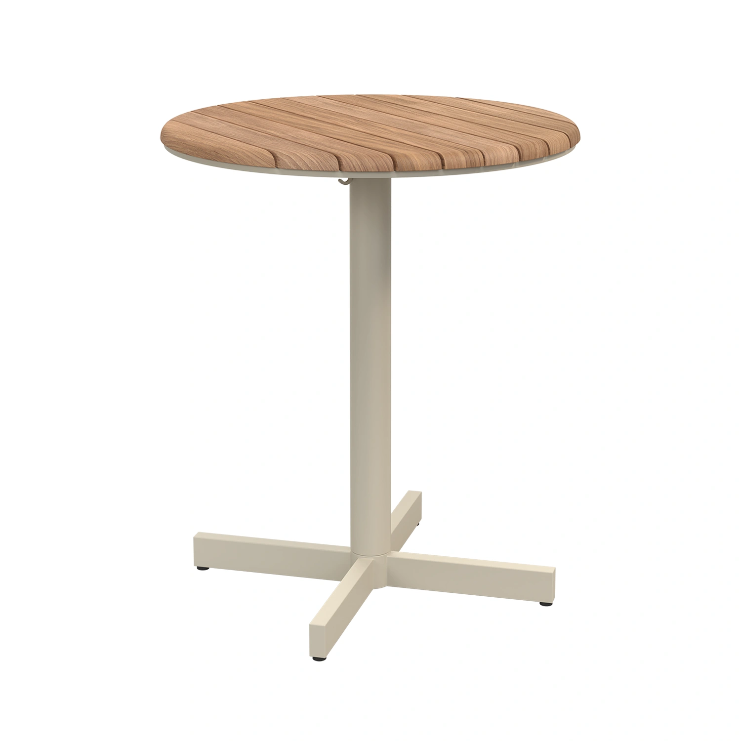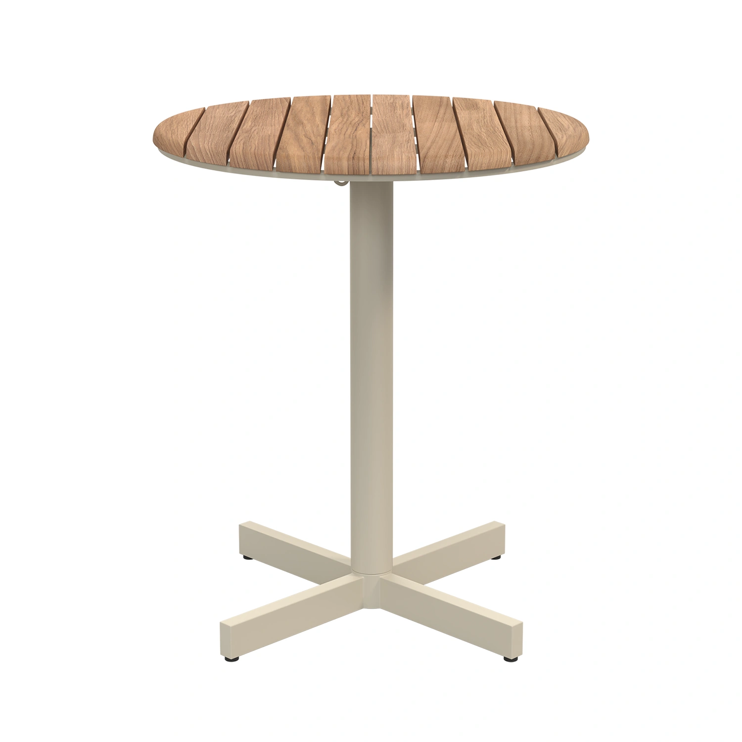 Pelagus Cafébord (Ø62,5 cm) har en rund, mittbaserad design med en bordsskiva i massiv teak och en pulverlackerad aluminiumram, tillgänglig i ljus elfenben och grönt. Utrustat med en länkanordning under bordsskivan som möjliggör säker sammankoppling av bord eller förvaring av en liten väska, vilket kombinerar funktionalitet med minimalistisk stil.