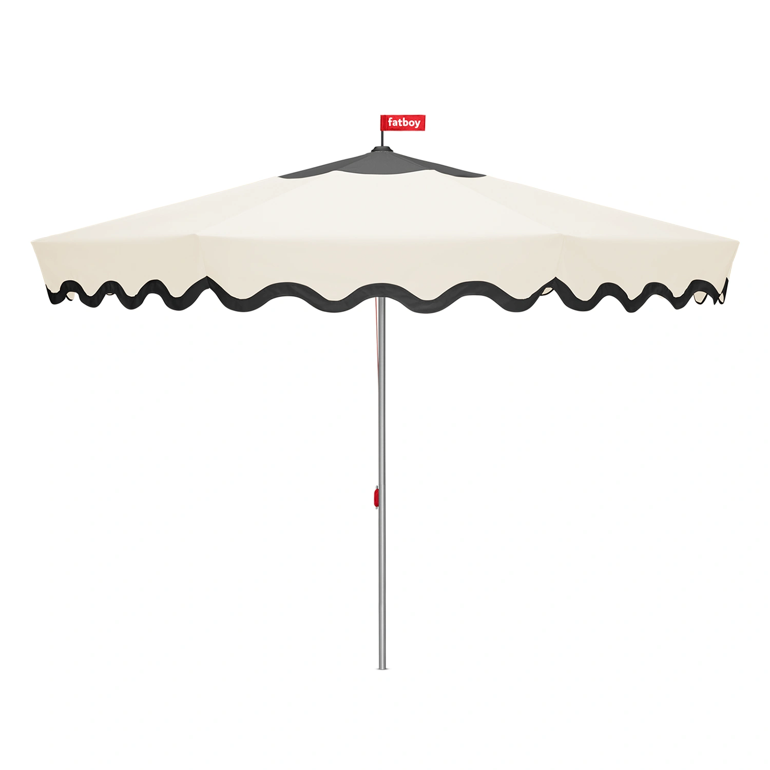 Pensol-parasollet kombinerar retrodesign med modern funktionalitet. Med sina lekfulla, vågiga kanter – inspirerade av pennspån – ger det en touch av 60-talets charm till din trädgård eller balkong. Den rymliga duken, med en diameter på 3,5 meter, ger gott om skugga och är tillverkad av färgbeständig polyester som är vatten- och smutsavvisande. Dessutom skyddar den effektivt mot solens starka UV-strålar. Tack vare den robusta aluminiumramen står Pensol-parasollet stadigt, och det medföljande skyddsfodralet och den ikoniska Fatboy-flaggan fulländar designen. En blickfångare och funktionell solskyddare i ett.