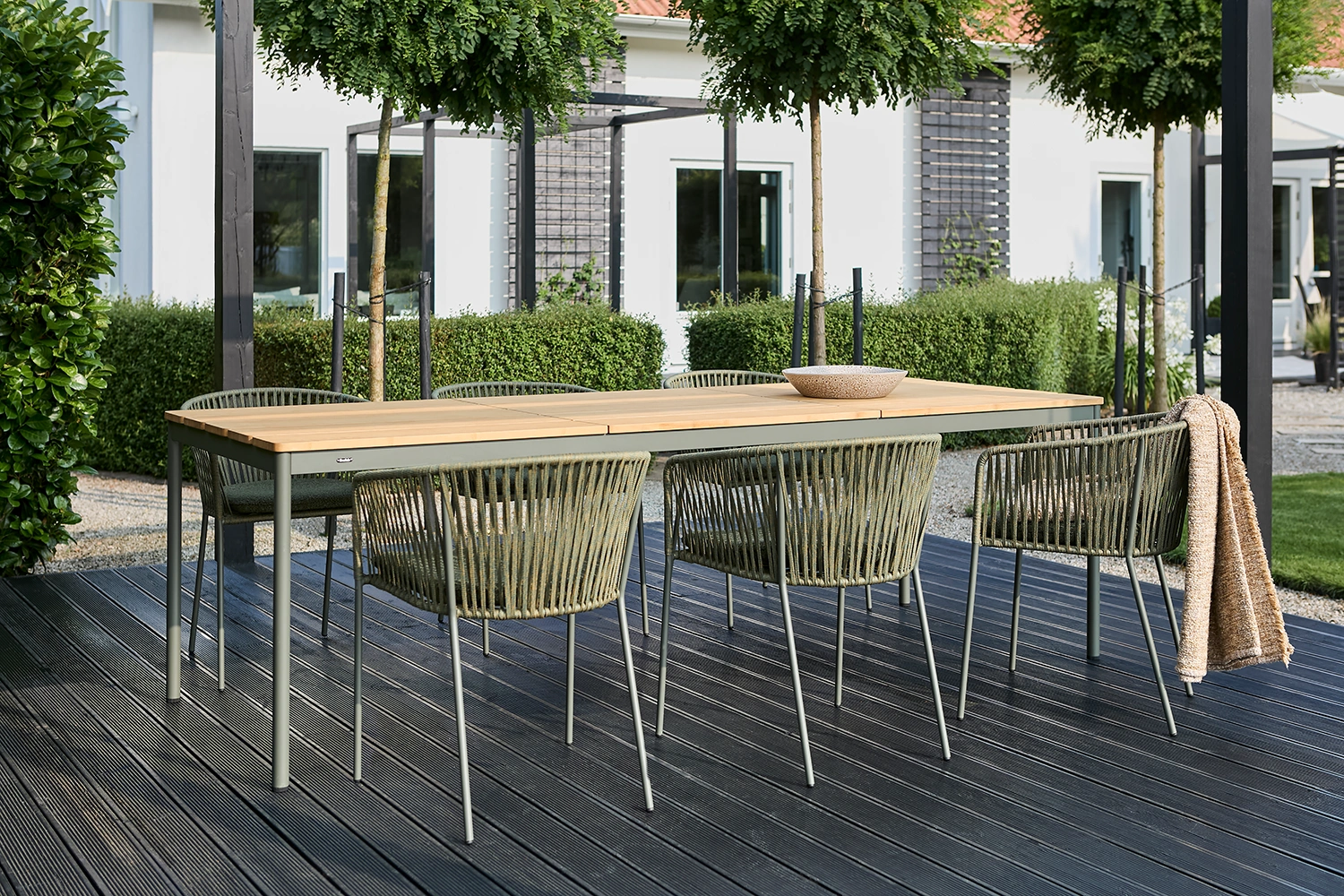 Piatto, matstolen som kombinerar komfort och hållbarhet med sin robusta stålram, designad för utomhusbruk samtidigt som den är vacker och stilren. Sits och rygg är gjord av breda, vävda rep som ger skönt stöd och tillför en touch av hantverksmässig elegans till din utemiljö.
