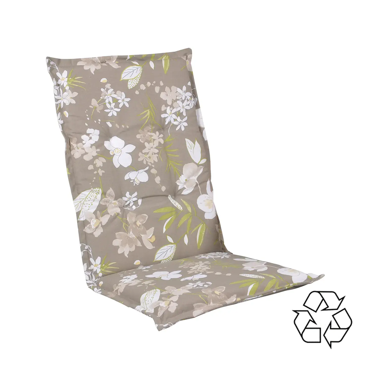 Positionsdyna med stoppning i polyeter och fibervadd. Dynan är sydd i Botanical mönstrat tyg med vinge runt om. Tyget är tillverkat av återvunnen bomull, polyester och annan textil. Dynan är lite tjockare i sitsen än i ryggen.