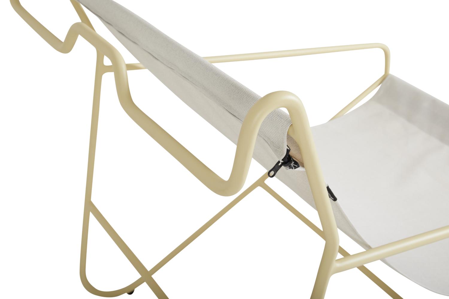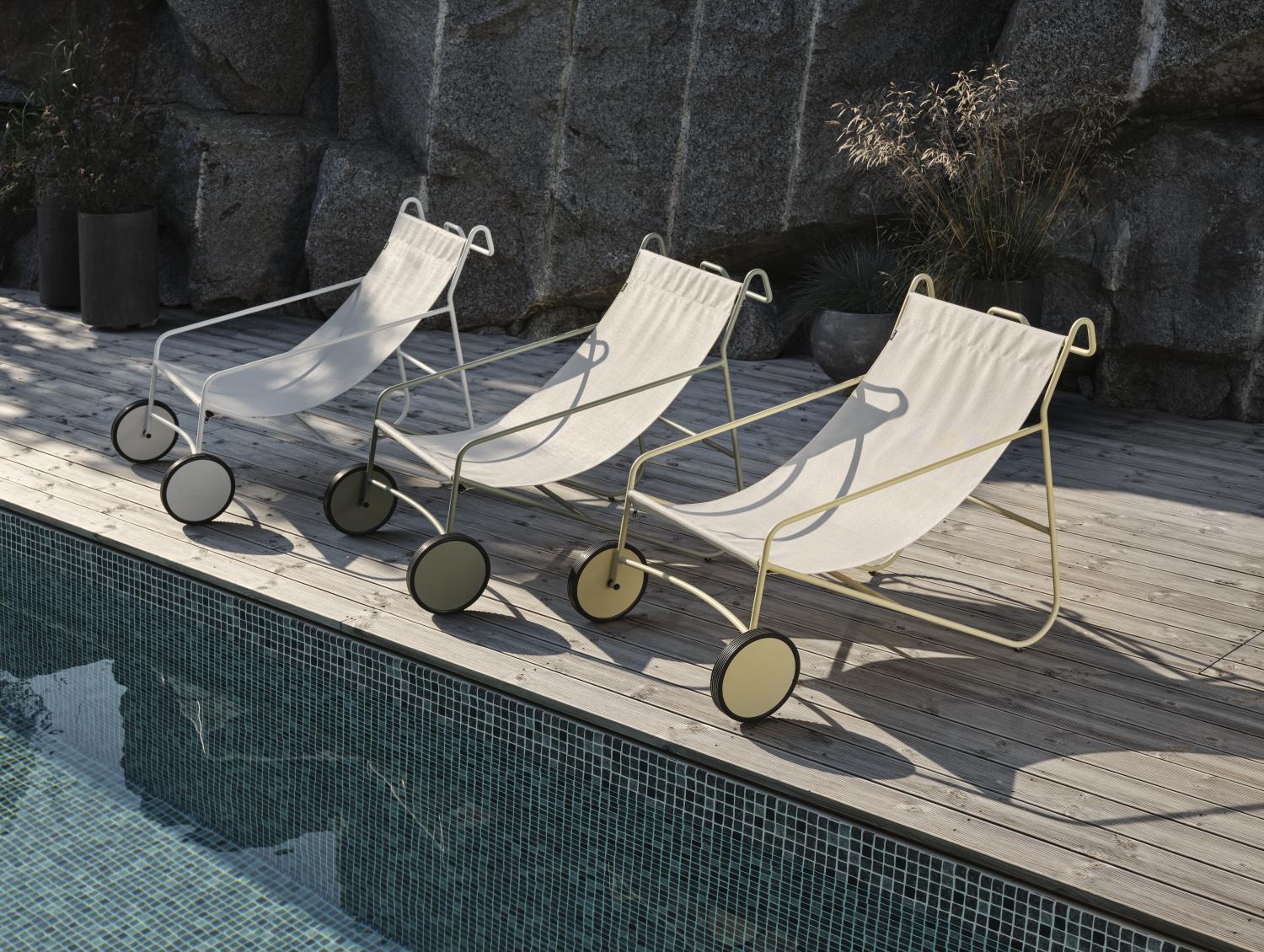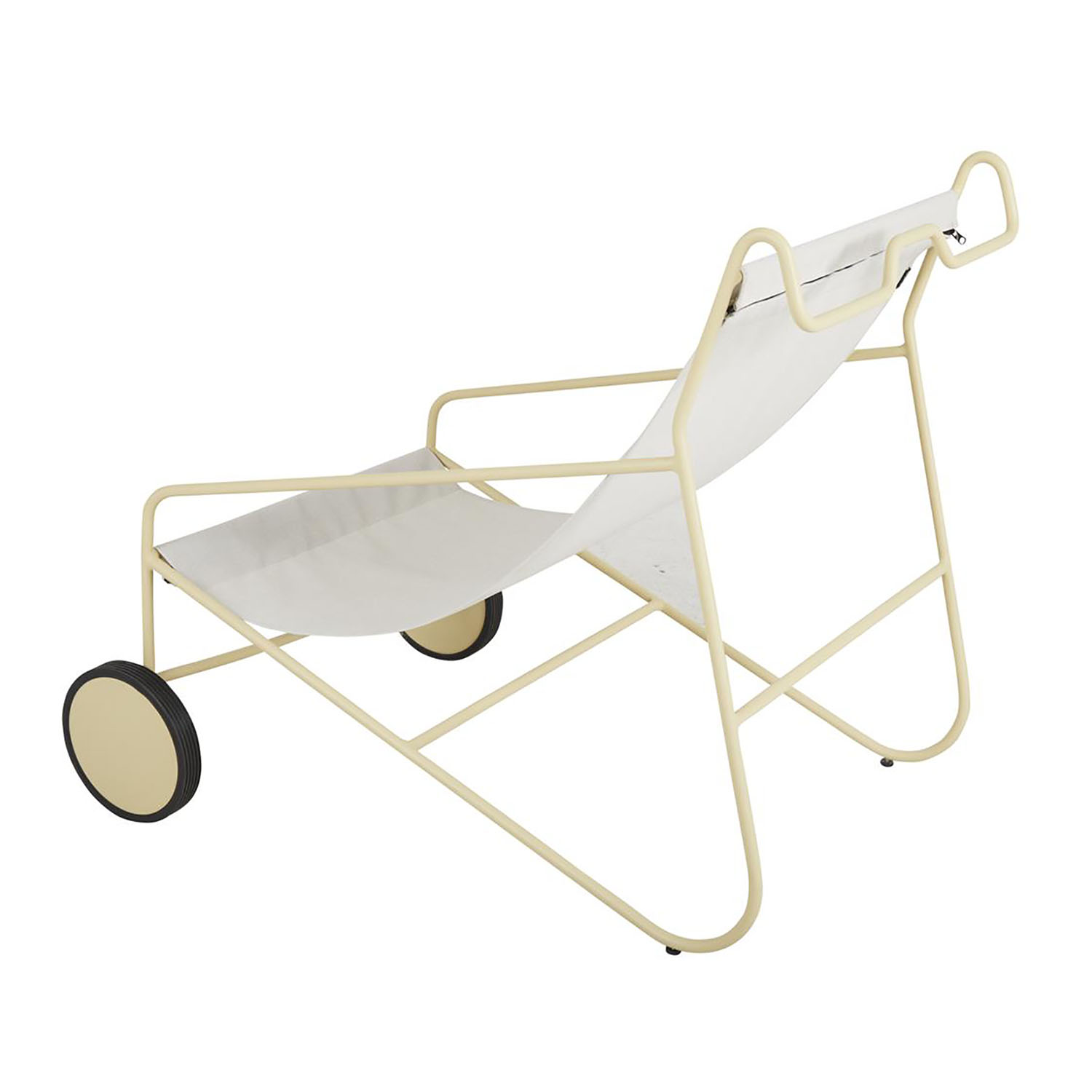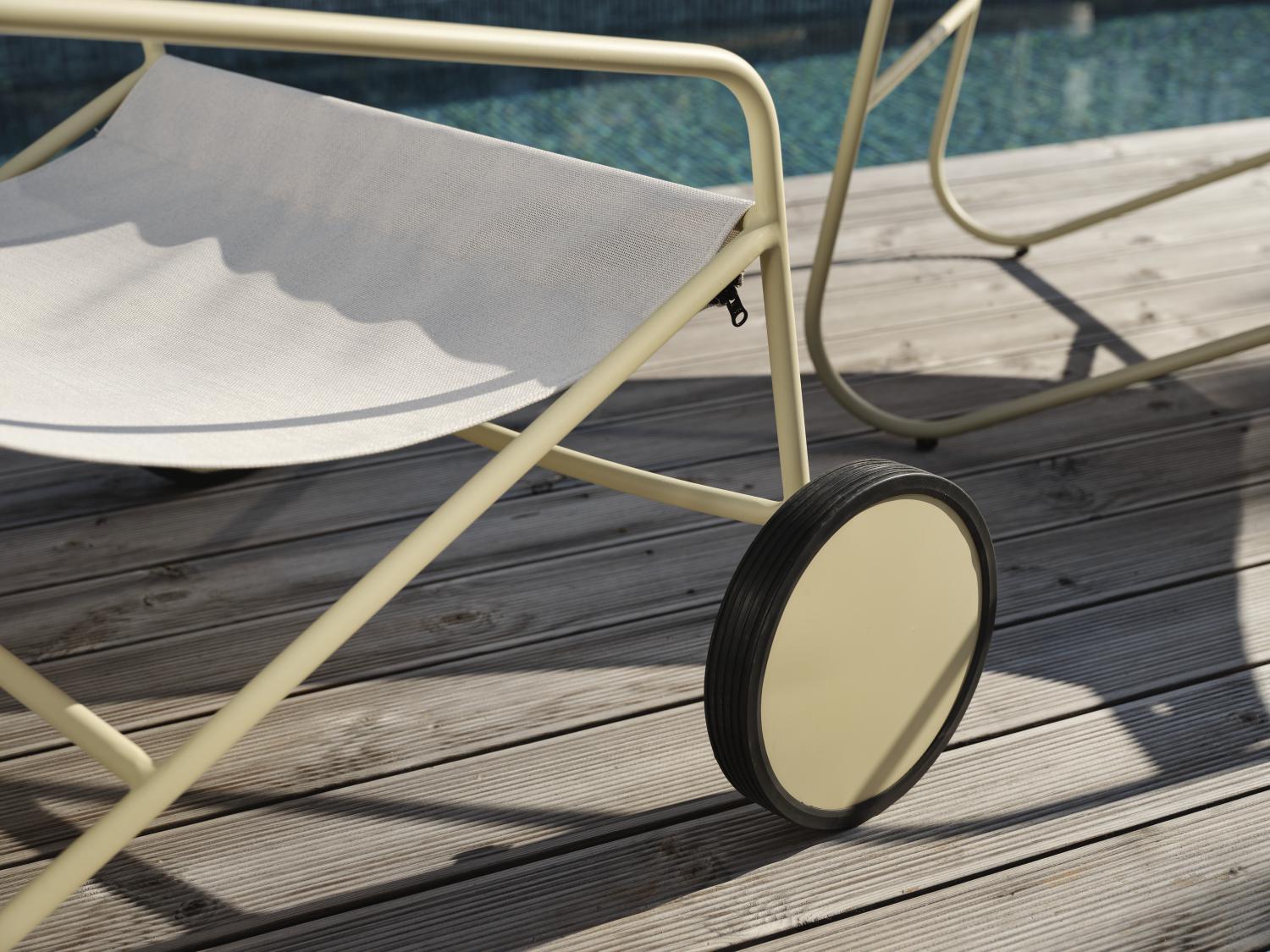 En unik loungestol med glimten i ögat. Rulla din viloplats dit du vill ha den med hjälp av hjulen och den smarta stången baktill – som även dubbeljobbar som krok när du behöver hänga ifrån dig din handduk, skjorta eller solhatt. Behöver du tvätta tygsisten går den enkelt att ta av tack vare en dragkedja.