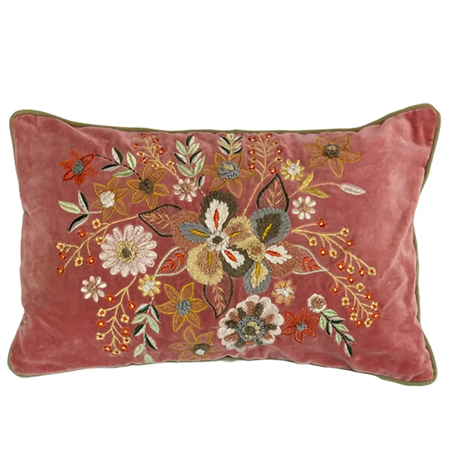 Denna vackra handbroderade kudde är tillverkad i mjuk sammet, broderat med vackra blommönster, och omgivet av passpoal i en kontrasterande färg, vilket ramar in kudden och ger den ett exklusivt utseende. Baksidan är gjord av bomull med en dold dragkedja som gör hela looken väldigt elegant. Många timmar har lagts ner på de handbroderade mönstren och kudden ger en personlig touch till din inredning, som är mycket lyxigt bohemisk.