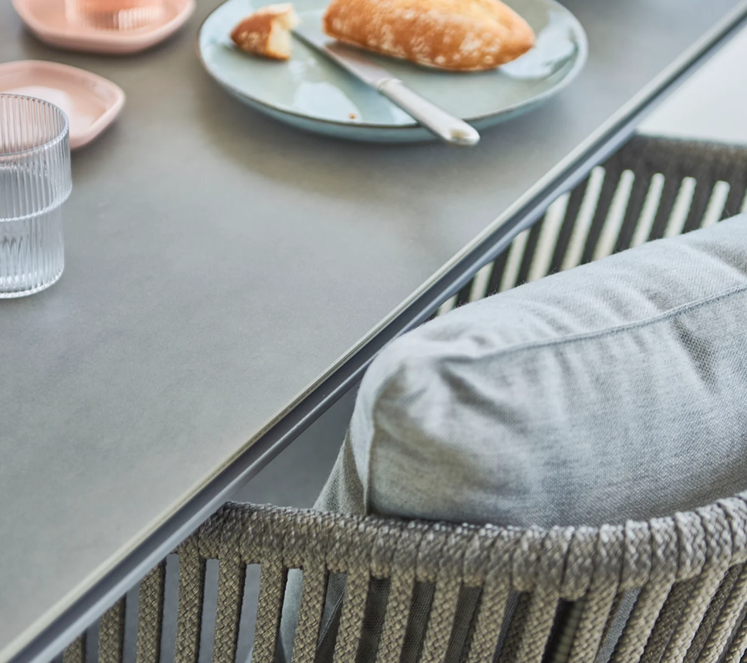 Trädgårdsborden finns i olika utföranden och visas här med ljusgrått stativ och tre olika bordsskivor. Bordsskivorna är tillverkade i det tåliga materialet keramik.