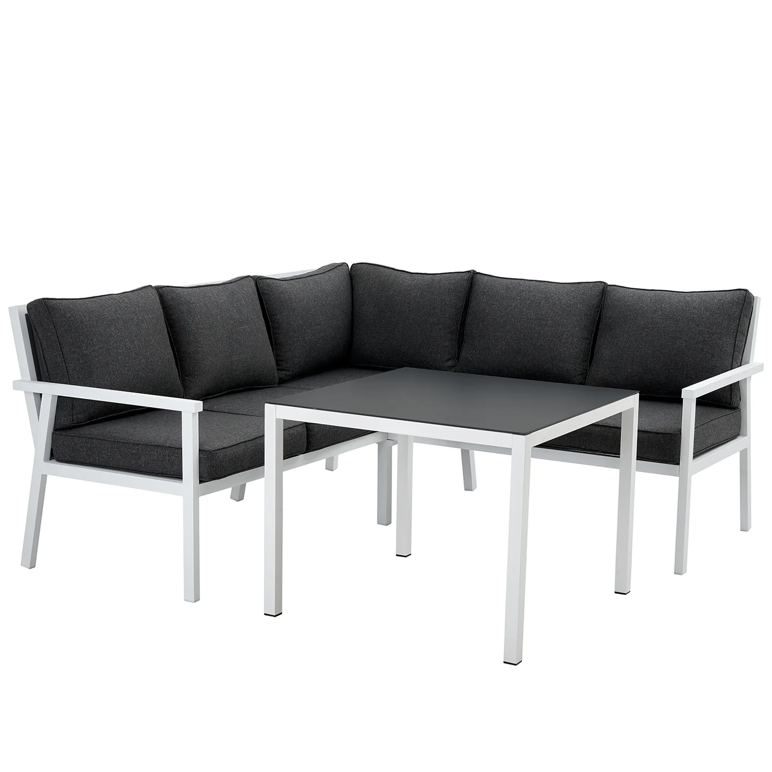 Rana hörnsoffa inklusive bord i vitt. Här visas den liksidiga soffan med kvadratiskt soffbord.