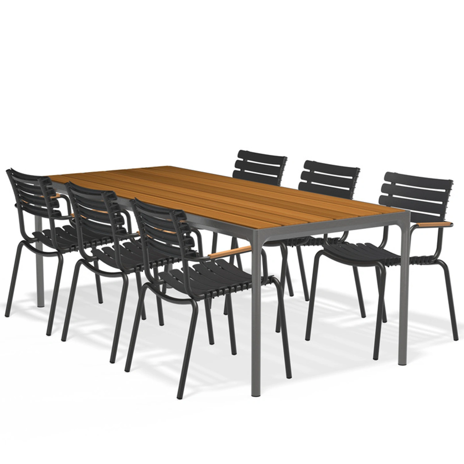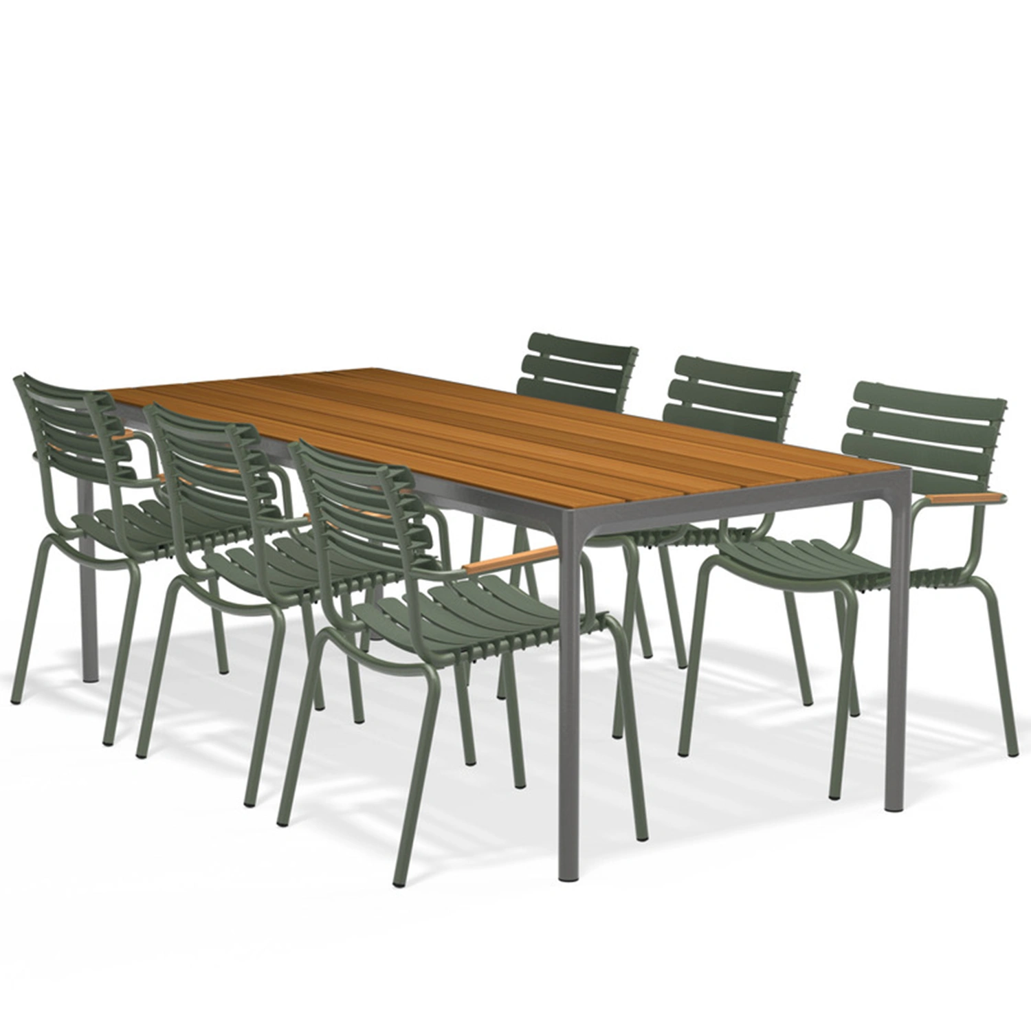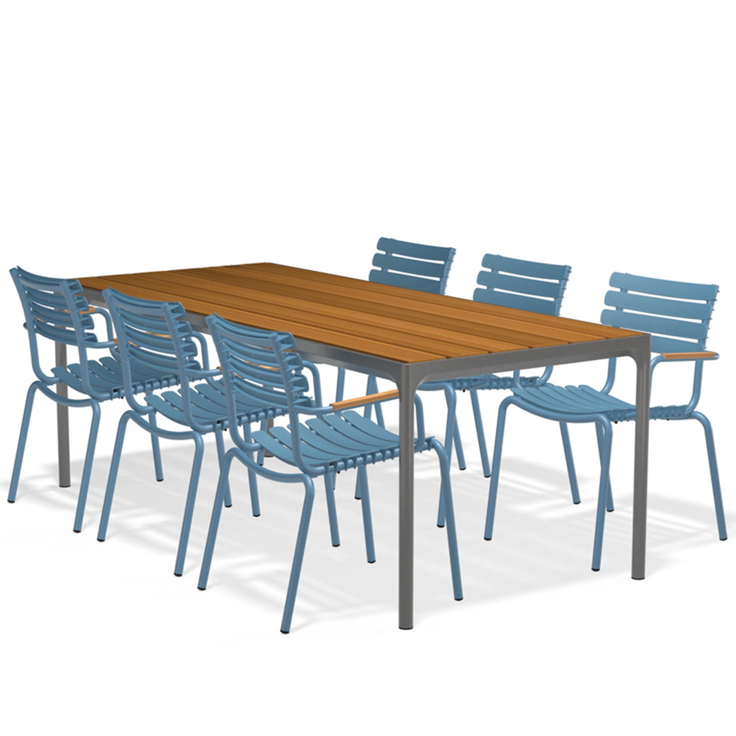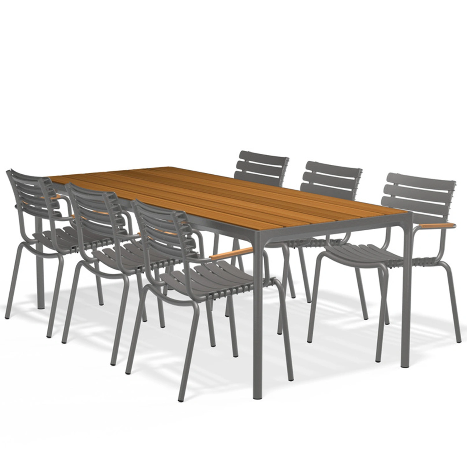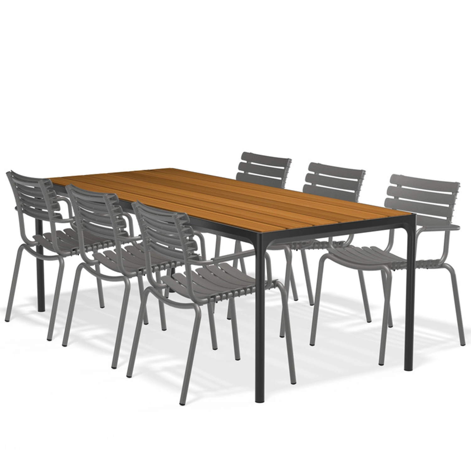 ReCLIPS matstolar finns i fyra monofärger med valet att lägga till armstöd i bambu. Aluminiumramen i kombination med UV-skyddade plastlameller håller underhållet till ett minimum. Lamellerna är utformade så att de sviktar precis lagom, därför behövs ingen dyna. ReCLIPS matstolar är stapelbara.