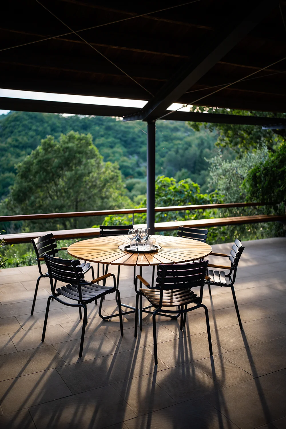 ReCLIPS matstolar finns i fyra monofärger med valet att lägga till armstöd i bambu. aluminiumramen i kombination med UV-skyddade plastlameller håller underhållet till ett minimum. Lamellerna är utformade så att de sviktar precis lagom, därför behövs ingen dyna. ReCLIPS matstolar är stapelbara. Stolen kombineras med fördel till ett av Houes egna matbord.