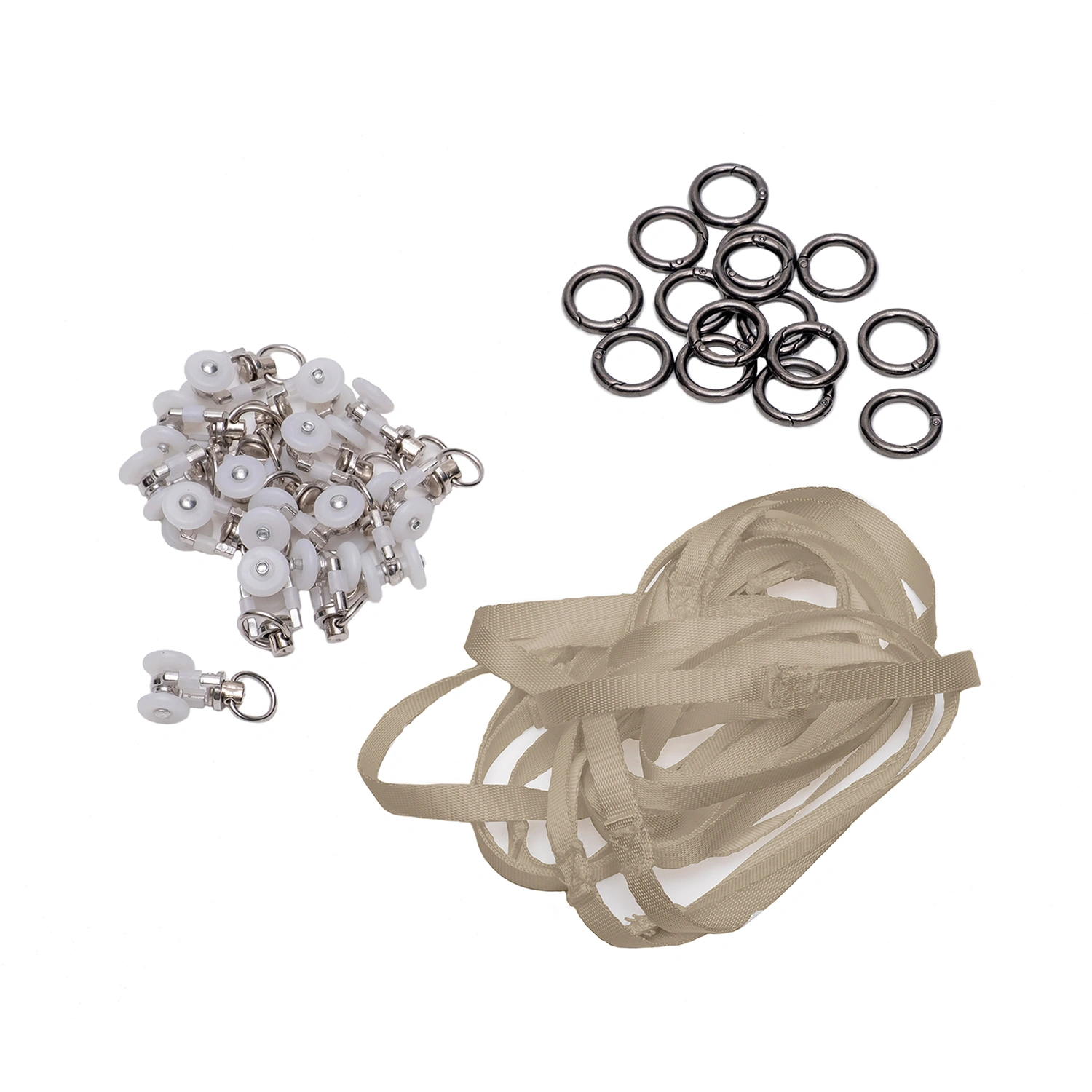 Innehåller 15 x sandfärgade band, 15 x metallringar samt 15 x plasthjul. Avståndet mellan hjulen är 12 mm, det yttre måttet över plasthjulen är 19 mm.