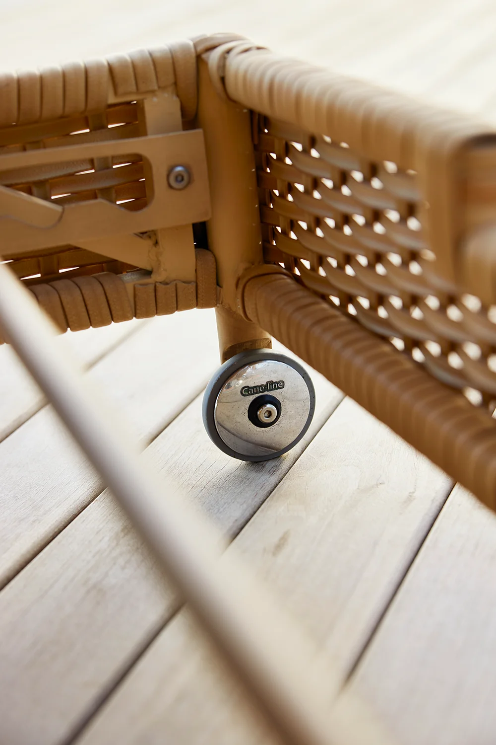 De bekväma dynorna har Cane-line QuickDry & Airflow-systemet, vilket gör att de torkar snabbare än vanliga dynor. Rest-solsängen har två små hjul som gör den lätt att flytta på. Du kan justera ryggstödet i 4 olika positioner, från helt liggande till helt sittande. Luta dig tillbaka och njut av härliga timmar i solen.