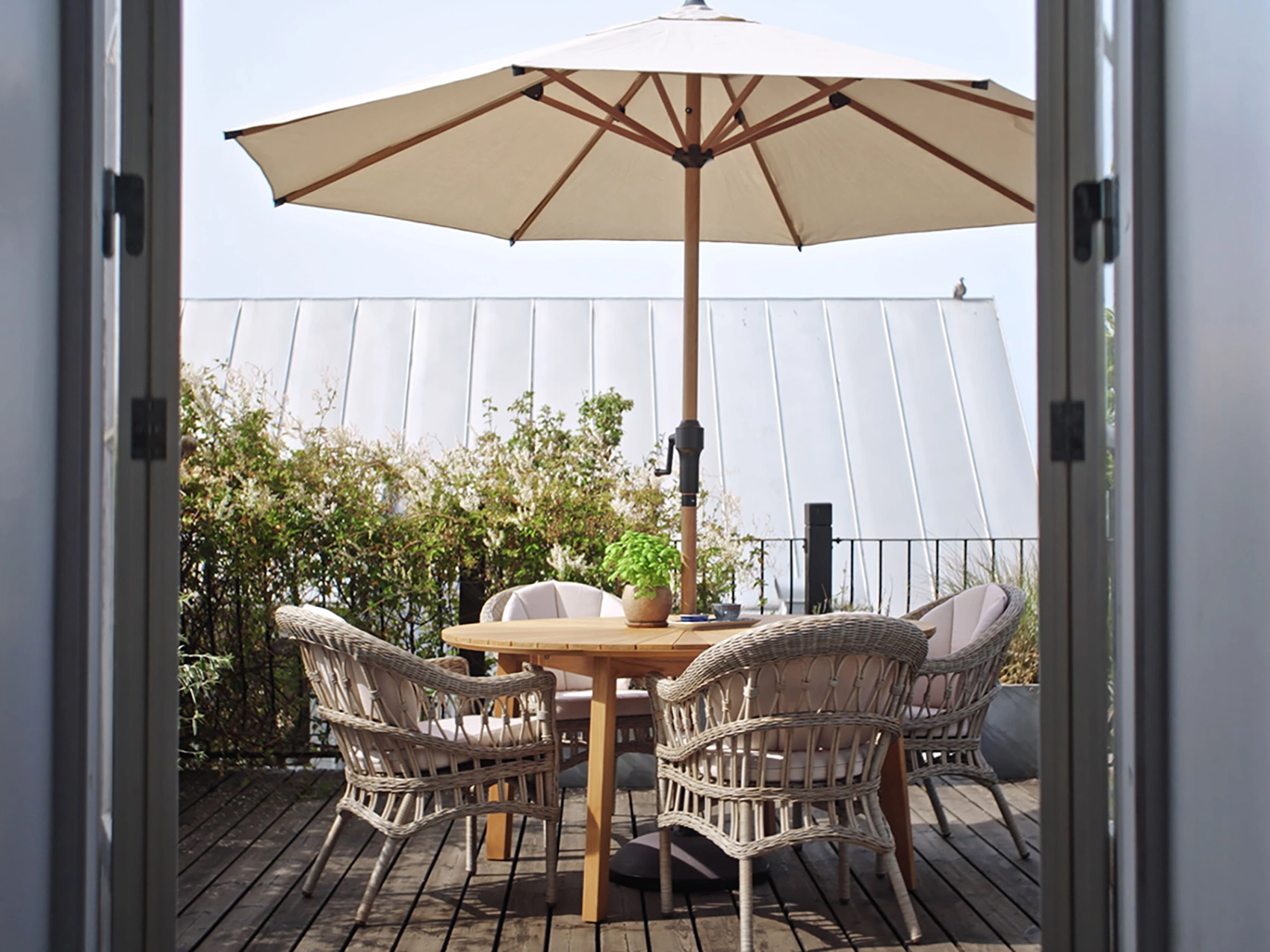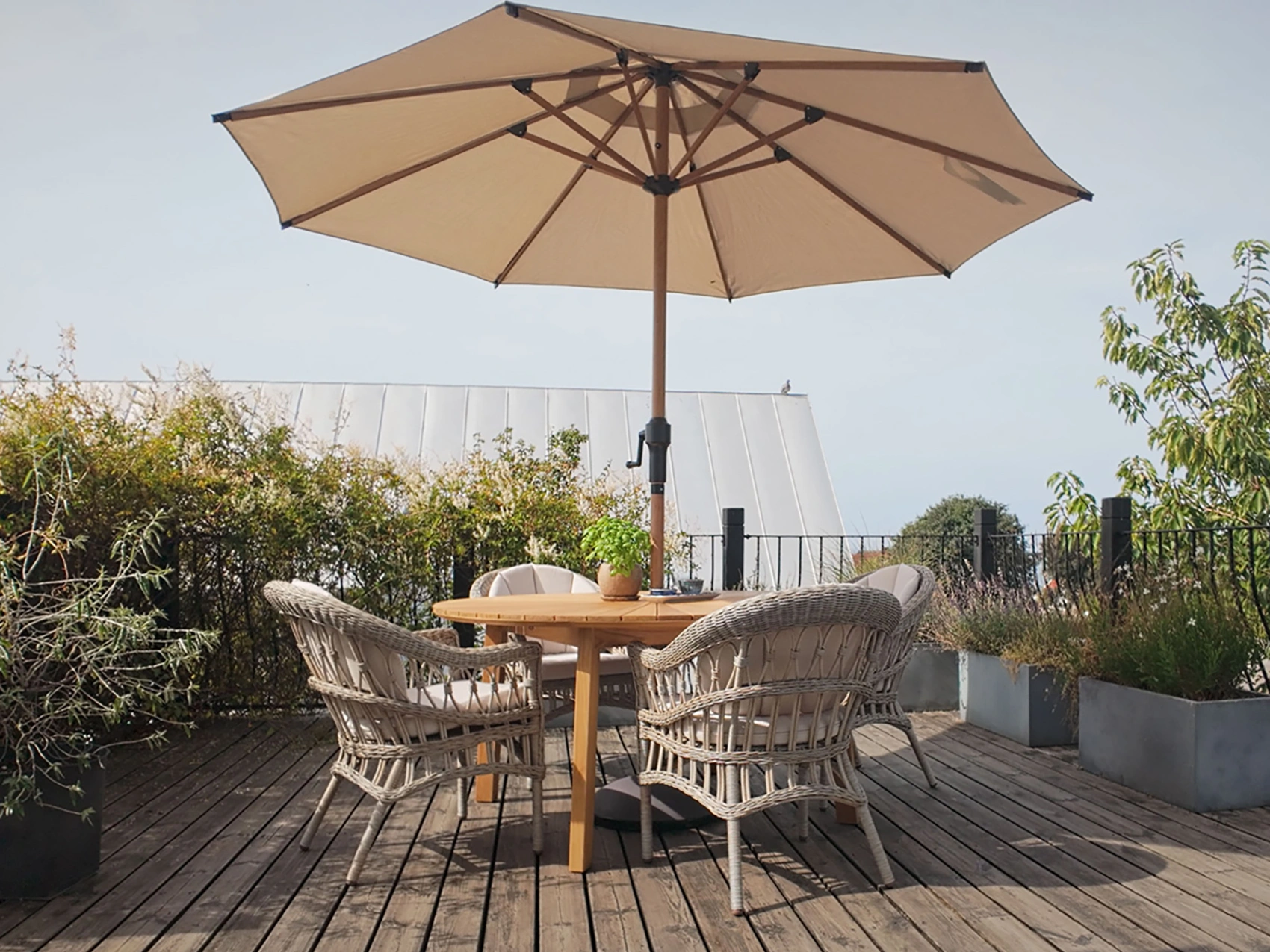 Ett vackert designat bord med solfjäderformad bordsskiva och hål för parasoll på Ø5 cm. Kan kombineras med Himmelsnäs eller Ardernäs karmstolar.