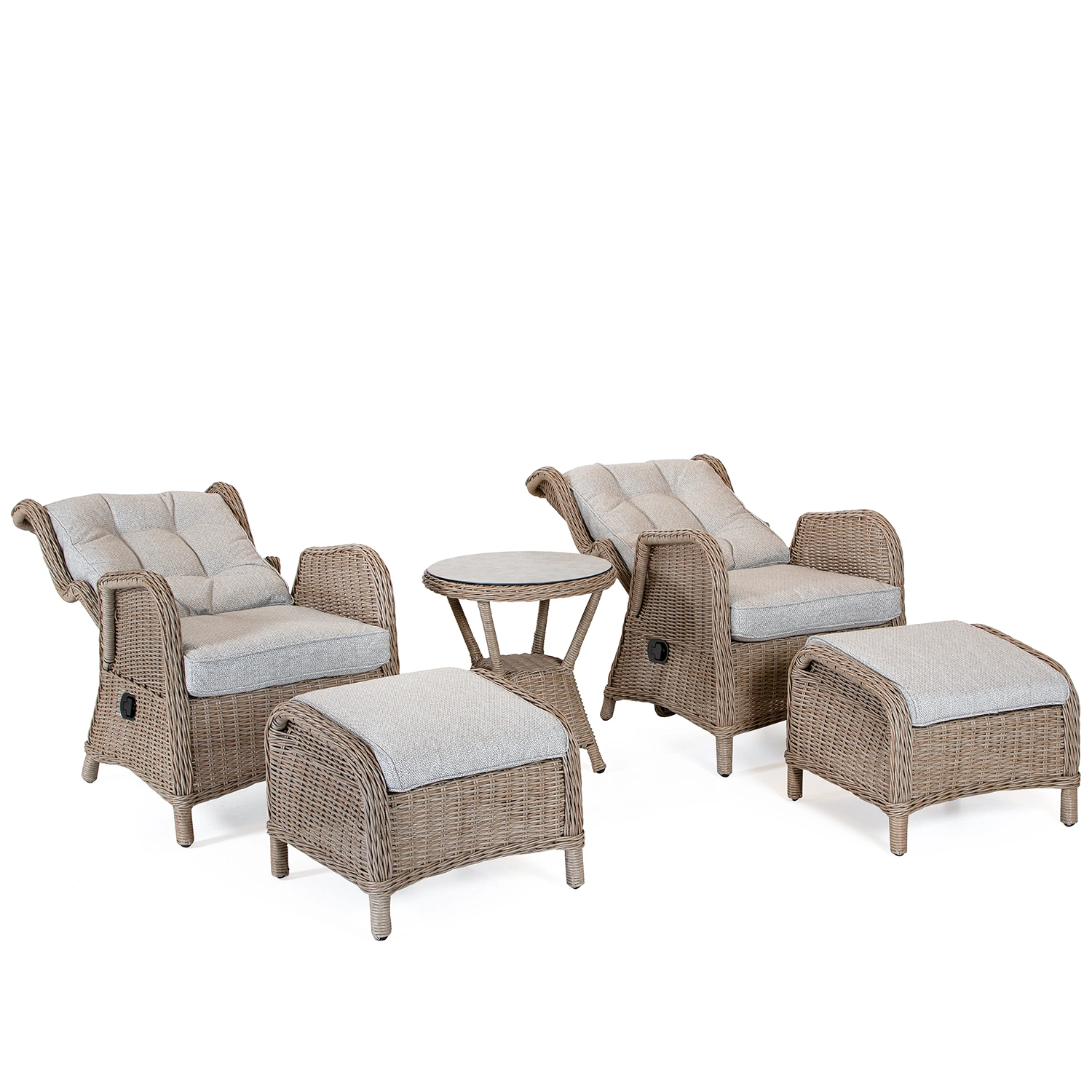 Rio fåtöljgrupp i naturfärgad konstrotting med beige allvädersdynor är en inbjudande loungelösning för trädgård, altan eller balkong. Gruppen består av två ställbara fåtöljer, två fotpallar och ett sidobord – allt designat för maximal komfort och avslappning. Den mjuka färgskalan och de rundade formerna gör att gruppen smälter in i både moderna och klassiska utemiljöer.