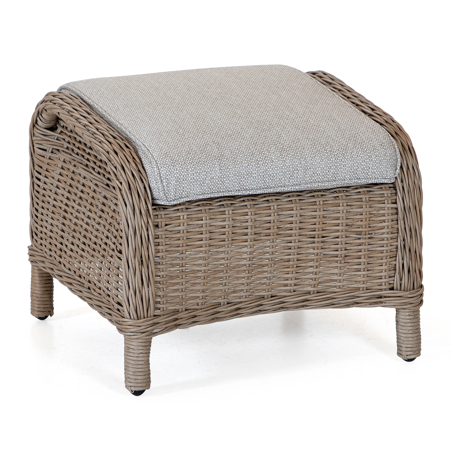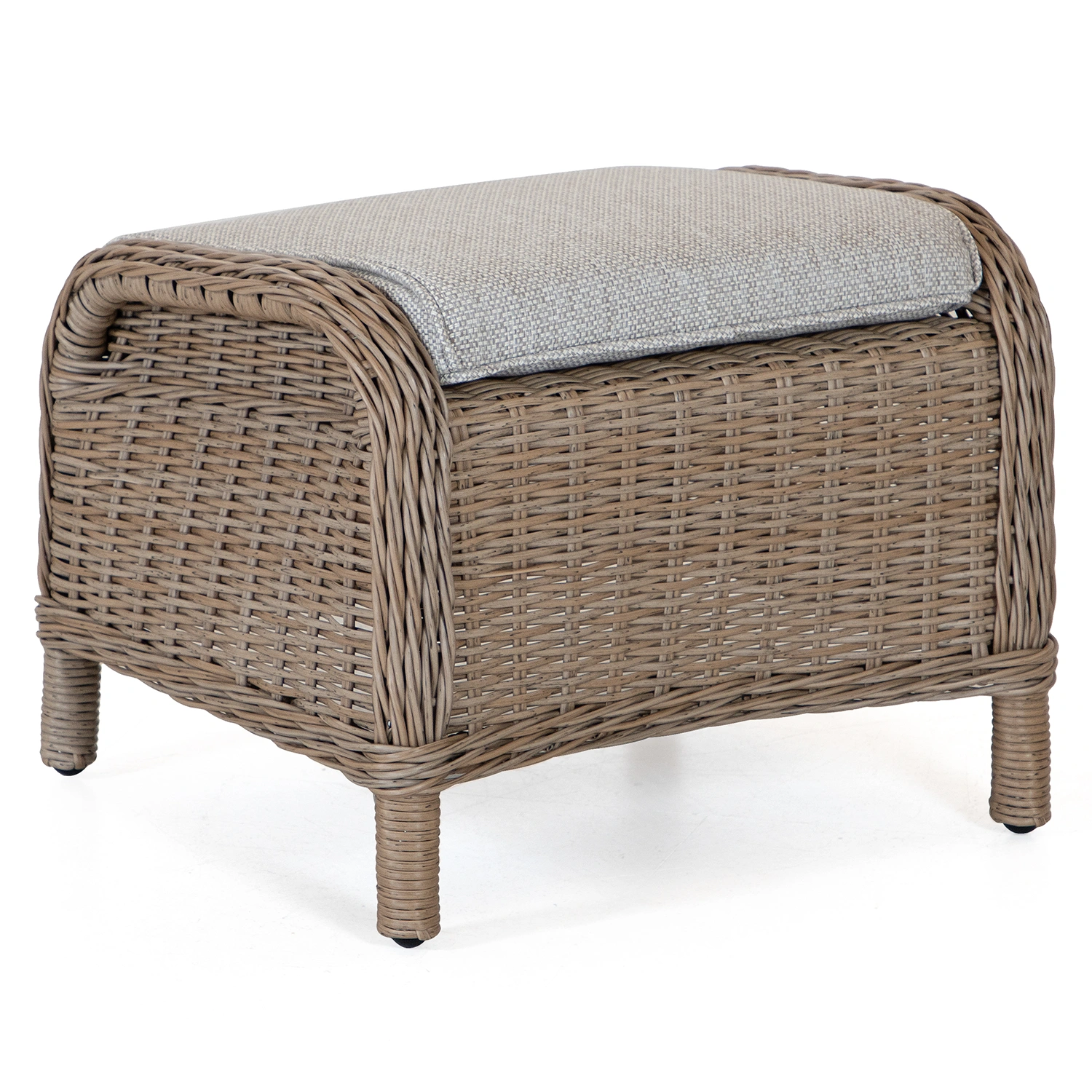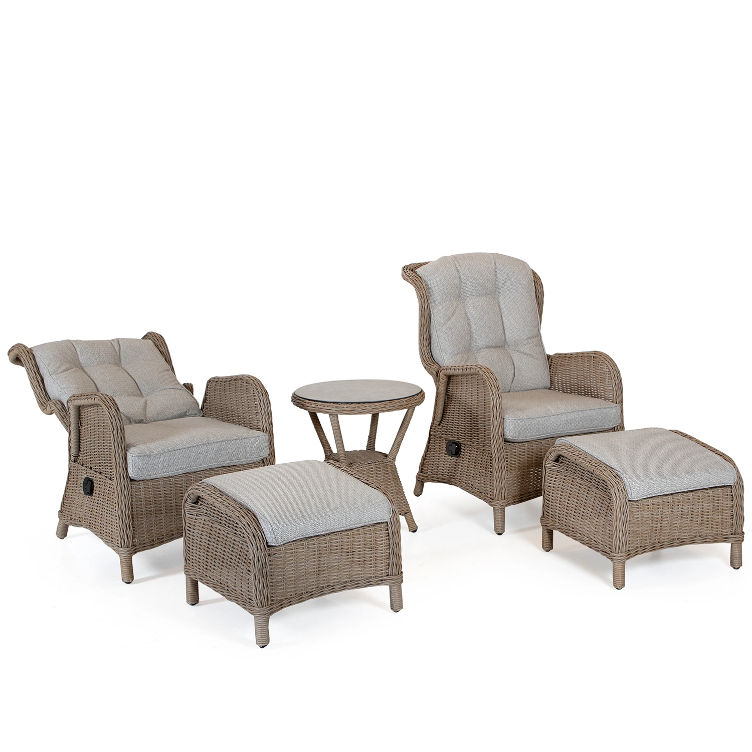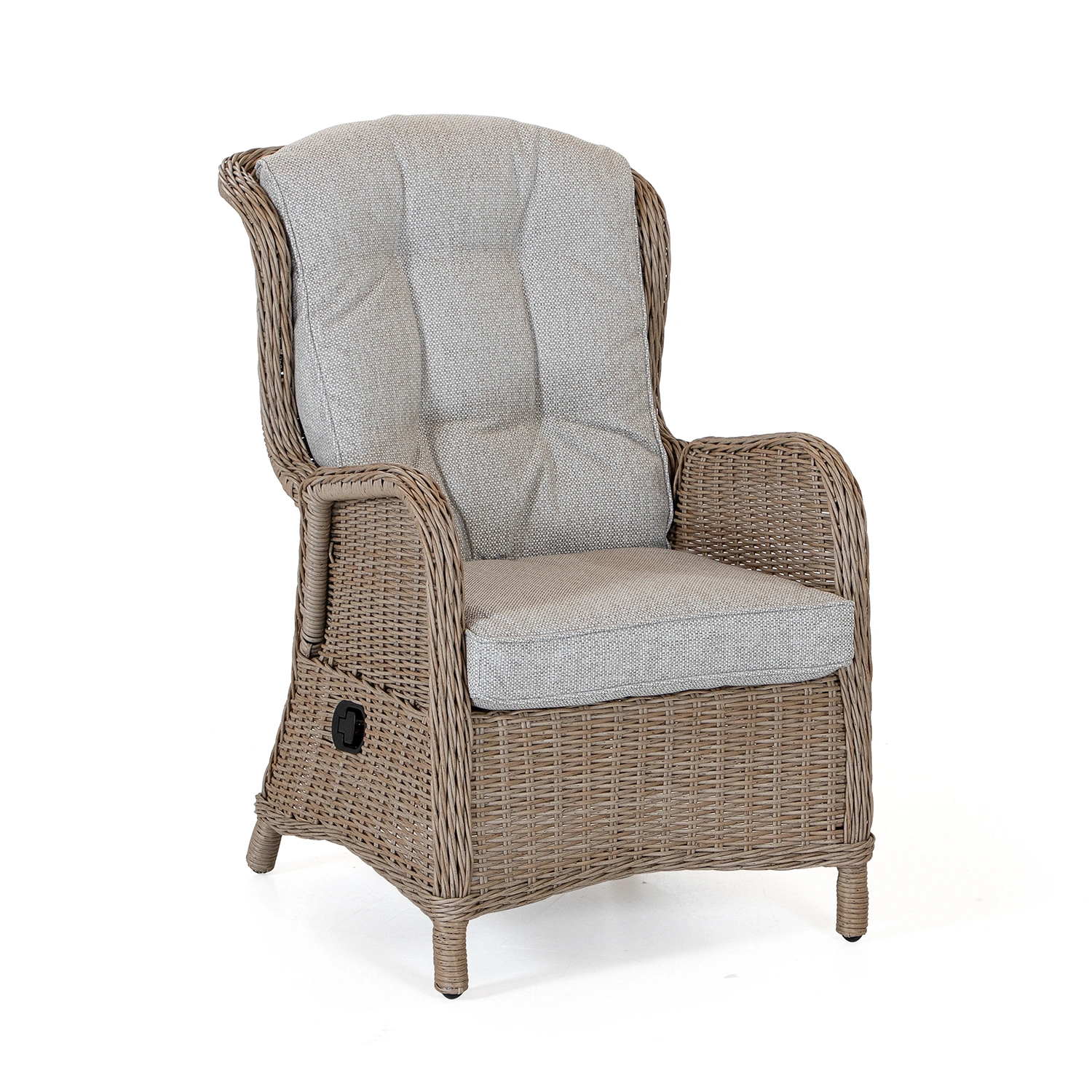 Rio-gruppen är lika funktionell som estetisk. Den naturfärgade konstrottingen ger ett varmt och organiskt uttryck, medan de beiga dynorna tillför en mjuk kontrast. Gruppen passar utmärkt i gröna trädgårdar, på trädeck eller i uterum med ljusa textilier. Tack vare de ställbara ryggarna och separata fotpallarna kan du enkelt skapa en personlig sittställning – perfekt för både samtal och vila.