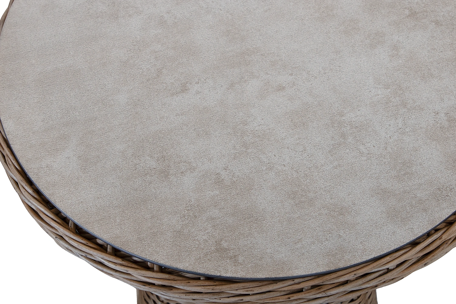 Stommen är tillverkad i aluminium, klädd med slitstark konstrotting som tål väder och vind. Dynorna är allvädersdynor med vattenavvisande egenskaper. Bordet har en 3D-printad glasskiva som är både dekorativ och tålig. Gruppen innehåller:
