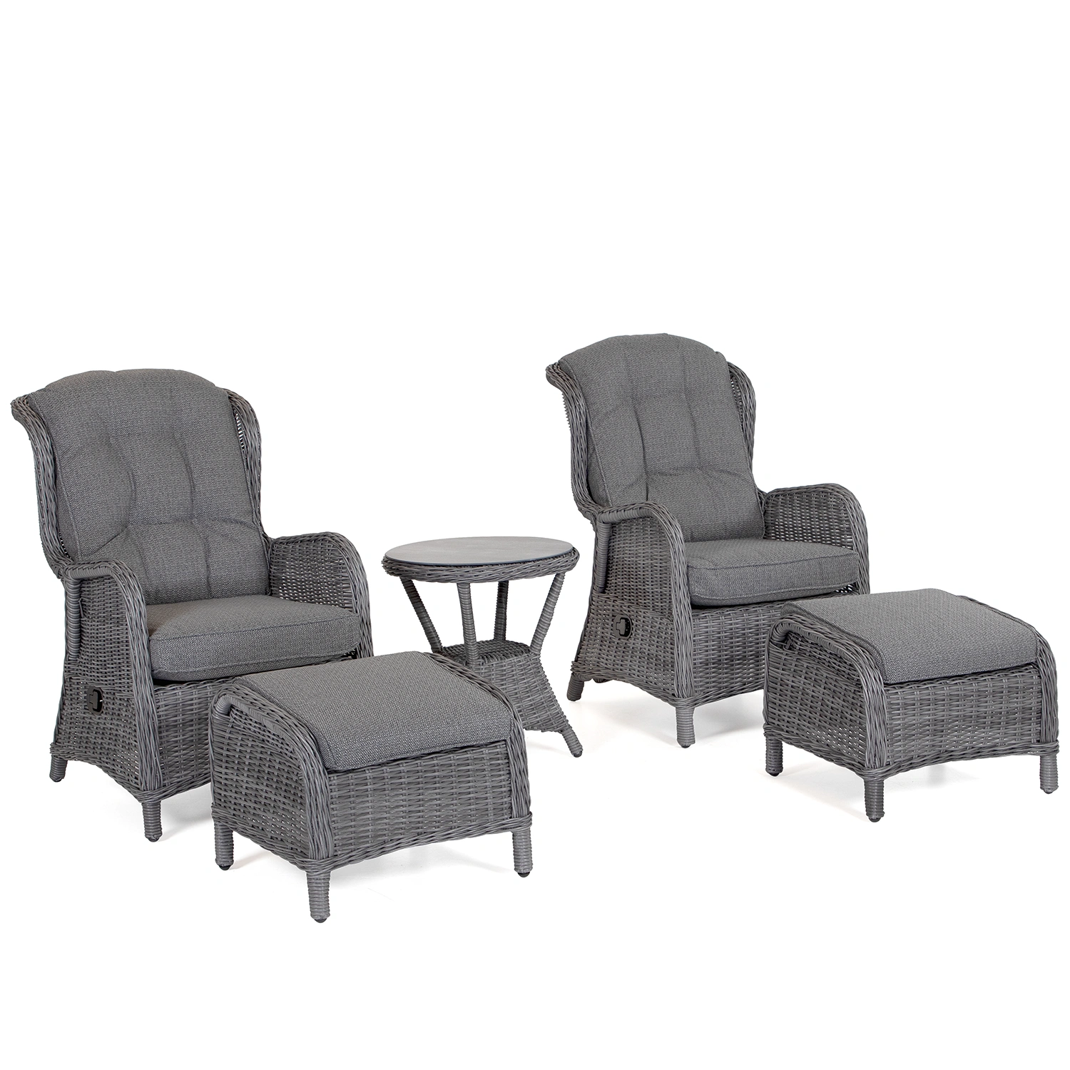 Färgkombinationen i antracit och mörkgrått ger ett stilrent intryck som harmoniserar med betong, trä och metall. Gruppen passar särskilt bra i urbana miljöer, på takterrasser eller i minimalistiska trädgårdar. De ställbara ryggarna och separata fotpallarna gör det enkelt att skapa en personlig sittställning – perfekt för både samtal och vila.