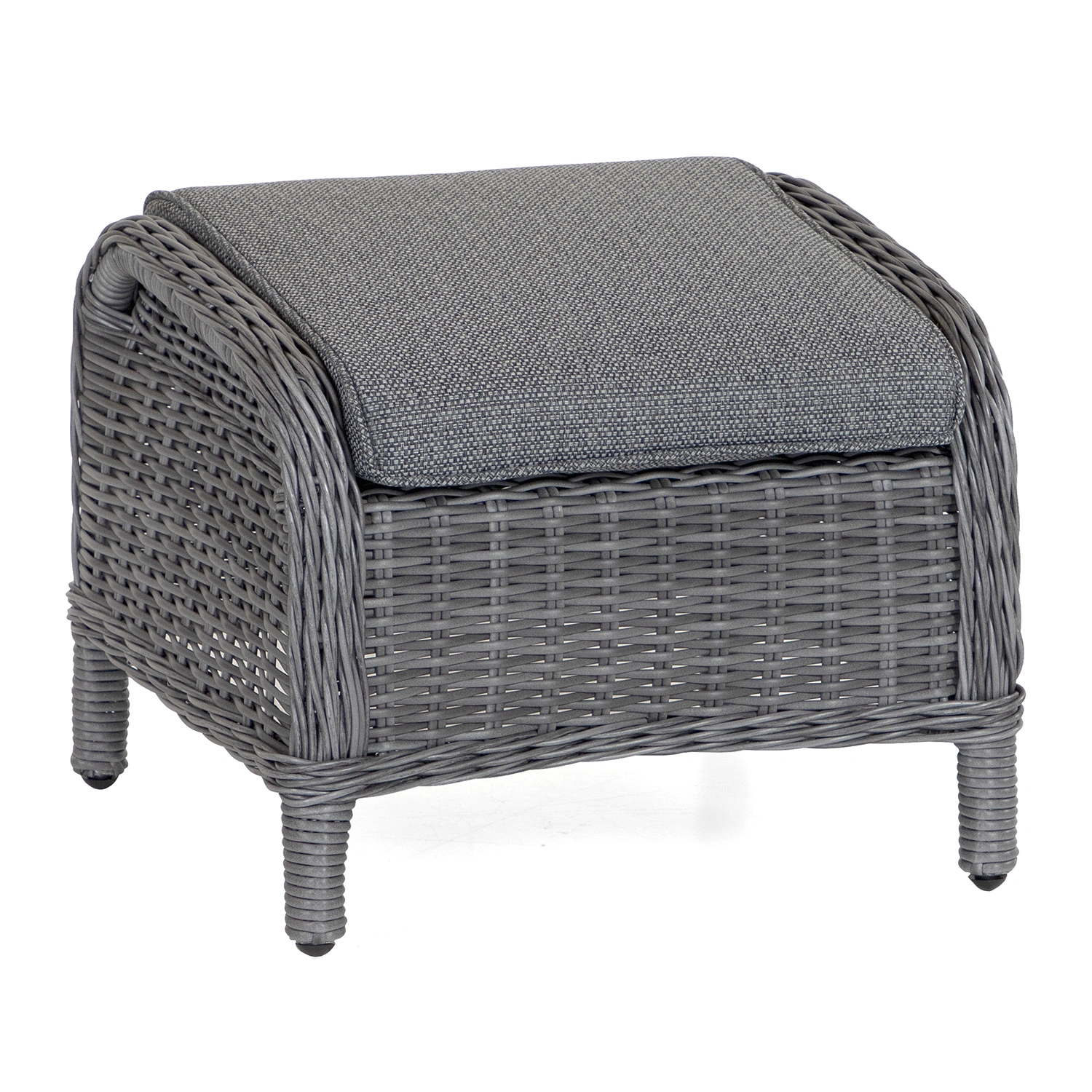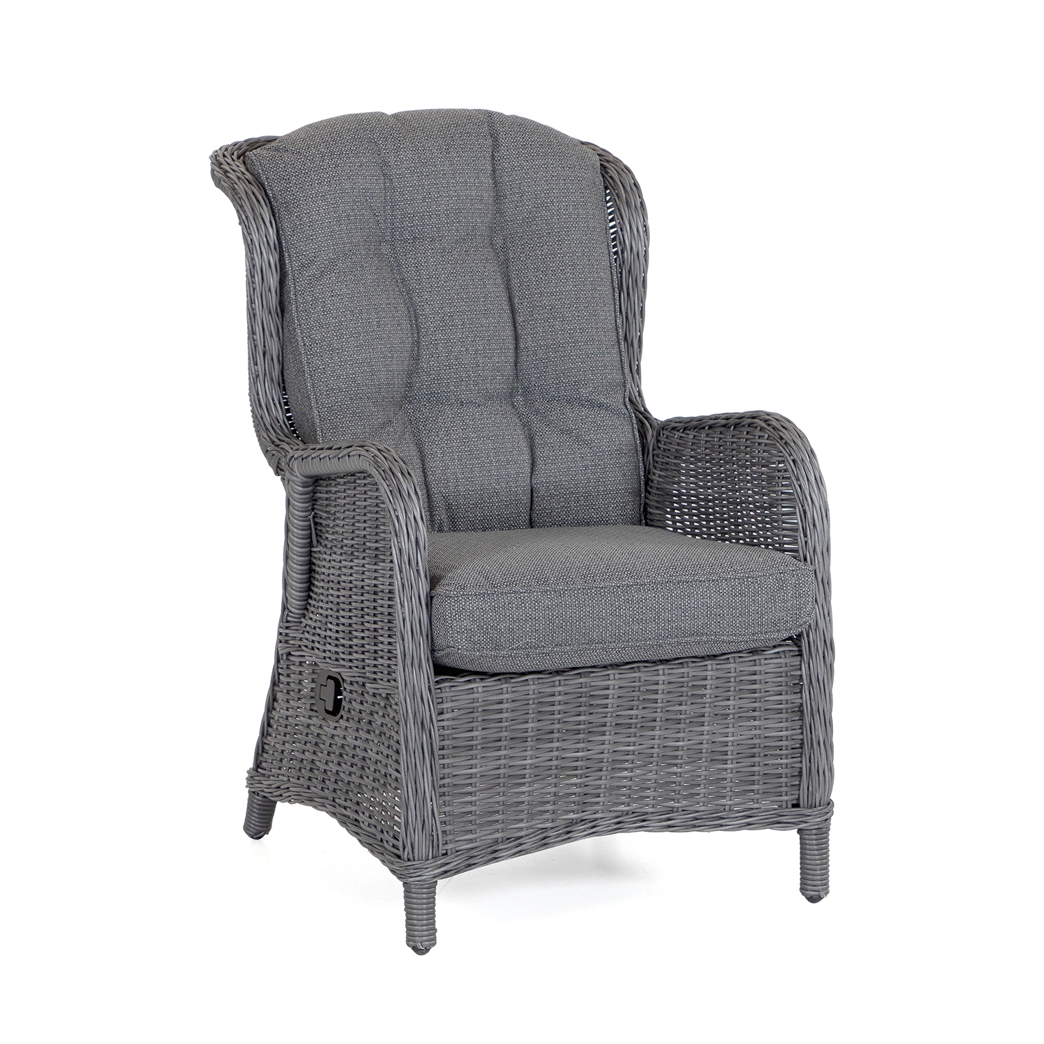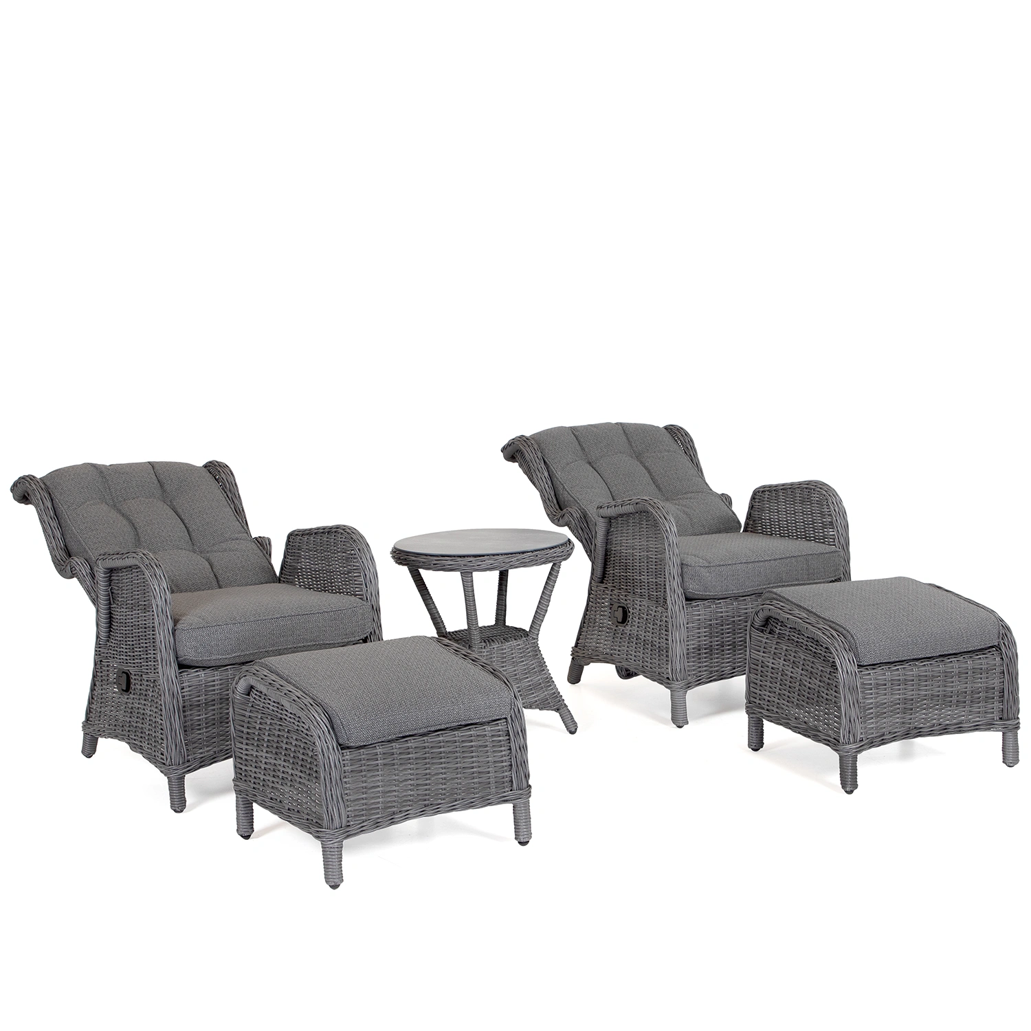 Rio fåtöljgrupp i antracitgrå konstrotting med mörkgrå allvädersdynor är en elegant loungelösning för trädgård, altan eller balkong. Gruppen består av två ställbara fåtöljer, två fotpallar och ett sidobord – allt designat för maximal komfort och avslappning. Den mörka färgskalan ger ett sofistikerat uttryck som passar moderna utemiljöer.