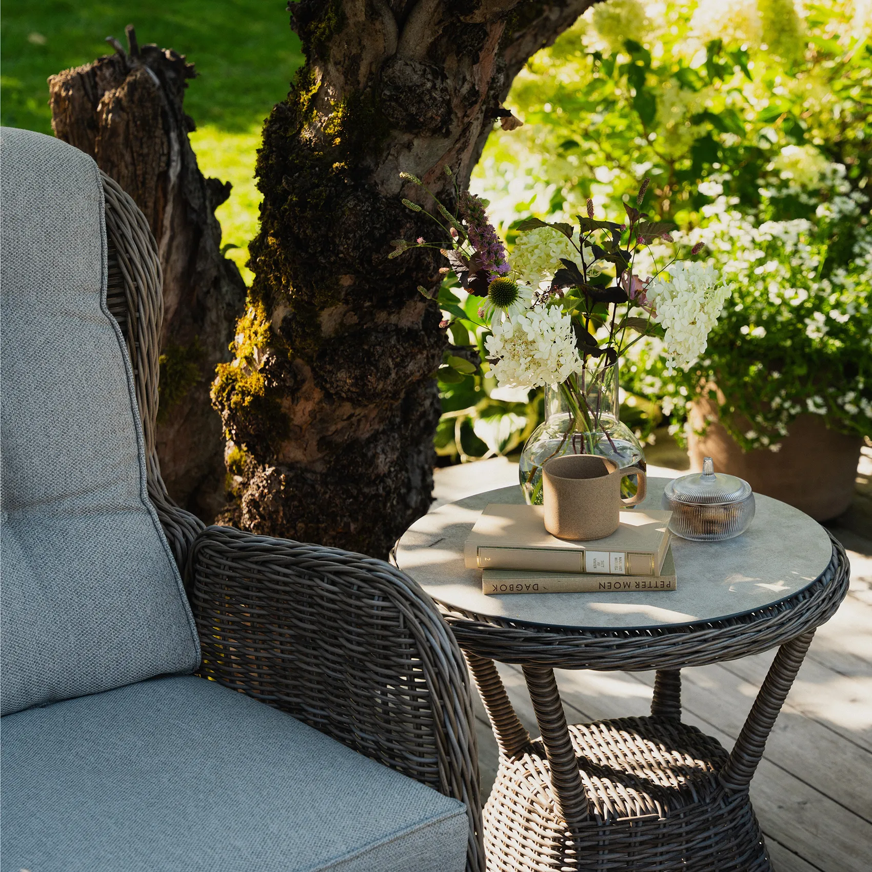 Rio fåtöljgrupp i drivvedsfärgad konstrotting med linfärgade dynor är en varm och inbjudande loungelösning för trädgård, altan eller balkong. Gruppen består av två ställbara fåtöljer, två fotpallar och ett sidobord – allt designat för maximal komfort och avslappning. Den gråbruna tonen i konstrottingen ger ett naturligt uttryck som passar både rustika och moderna miljöer.