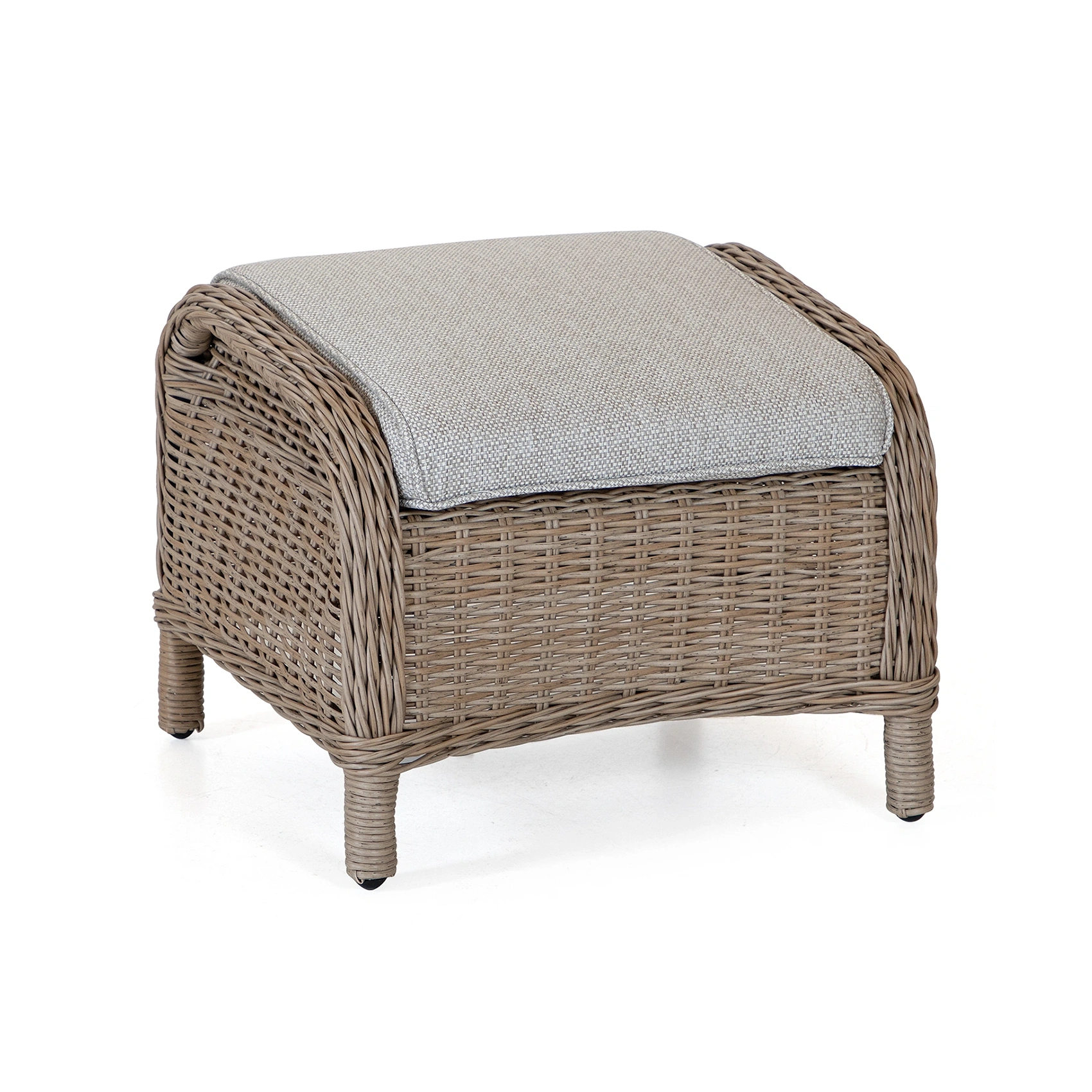 Rio fotpall i naturfärgad konstrotting med beige allvädersdyna. Fotpallen kan köpas till fåtöljen, sofffgruppen eller hörnsoffan.
